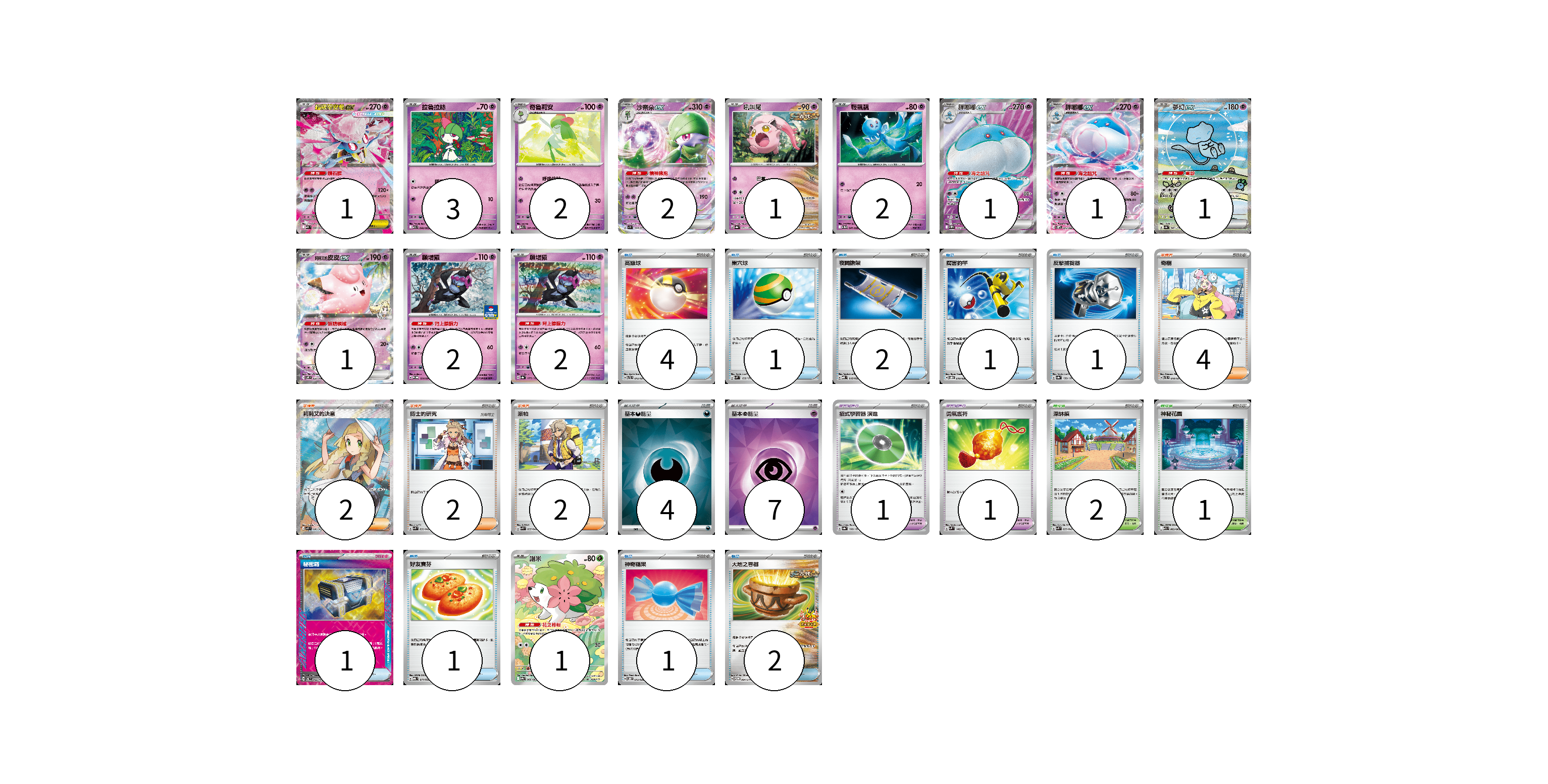 牌組構築方案 以此牌組為基礎新構築牌組 顯示卡面 顯示列表 寶可夢卡(20) 1 3 2 2 1 2 1 1 1 1 2 2 1 寶可夢道具(6) 4 1 1 物品卡(14) 4 1 2 1 1 1 1 1 2 支援者卡(6) 2 2 2 競技場卡(3) 2 1 能量卡(11) 4 7 寶可夢卡(20) 卡牌名稱 張數 卡牌名稱 張數 超級蒂安希ex MBD 006/022 01 拉魯拉絲 M1S 040/063 03 奇魯莉安 M1S 041/063 02 沙奈朵ex SV1S 028/078 02 吼叫尾 SV8a 071/187 01 輕飄飄 SV11W 041/086 02 胖嘟嘟ex SV11W 162/086 01 胖嘟嘟ex SV11W 042/086 01 夢幻ex SV4a 347/190 01 莉莉艾的皮皮ex SV9 033/100 01 願增猿 M-P 014/M-P 02 願增猿 SV8a 075/187 02 謝米 SV9a 066/063 01 寶可夢道具(6) 卡牌名稱 張數 卡牌名稱 張數 奇樹 SVTL 018/021 04 招式學習器 演進 SV8a 160/187 01 勇氣護符 SVM 142/175 01 物品卡(14) 卡牌名稱 張數 卡牌名稱 張數 高級球 SVTL 012/021 04 巢穴球 SVM 133/175 01 夜間擔架 MBD 016/022 02 厲害釣竿 SVOD 010/020 01 反擊捕捉器 SV8a 139/187 01 秘密箱 SV6 092/101 01 好友寶芬 MBG 011/022 01 神奇糖果 SVOD 013/020 01 大地之容器 SV-P 084/SV-P 02 支援者卡(6) 卡牌名稱 張數 卡牌名稱 張數 莉莉艾的決意 M1L 086/063 02 博士的研究 SVK 032/042 02 派帕 SVK 035/042 02 競技場卡(3) 卡牌名稱 張數 卡牌名稱 張數 深缽鎮 SVK 039/042 02 神秘花園 M1S 063/063 01 能量卡(11) 卡牌名稱 張數 卡牌名稱 張數 基本【惡】能量 SVOM DAR 04 基本【超】能量 SVOD PSY 07 以此牌組為基礎新構築牌組 牌組編碼 fearFu-eeeGbN-IlCJBF copy 列印牌組單 牌組編碼已複製 分享至SNS