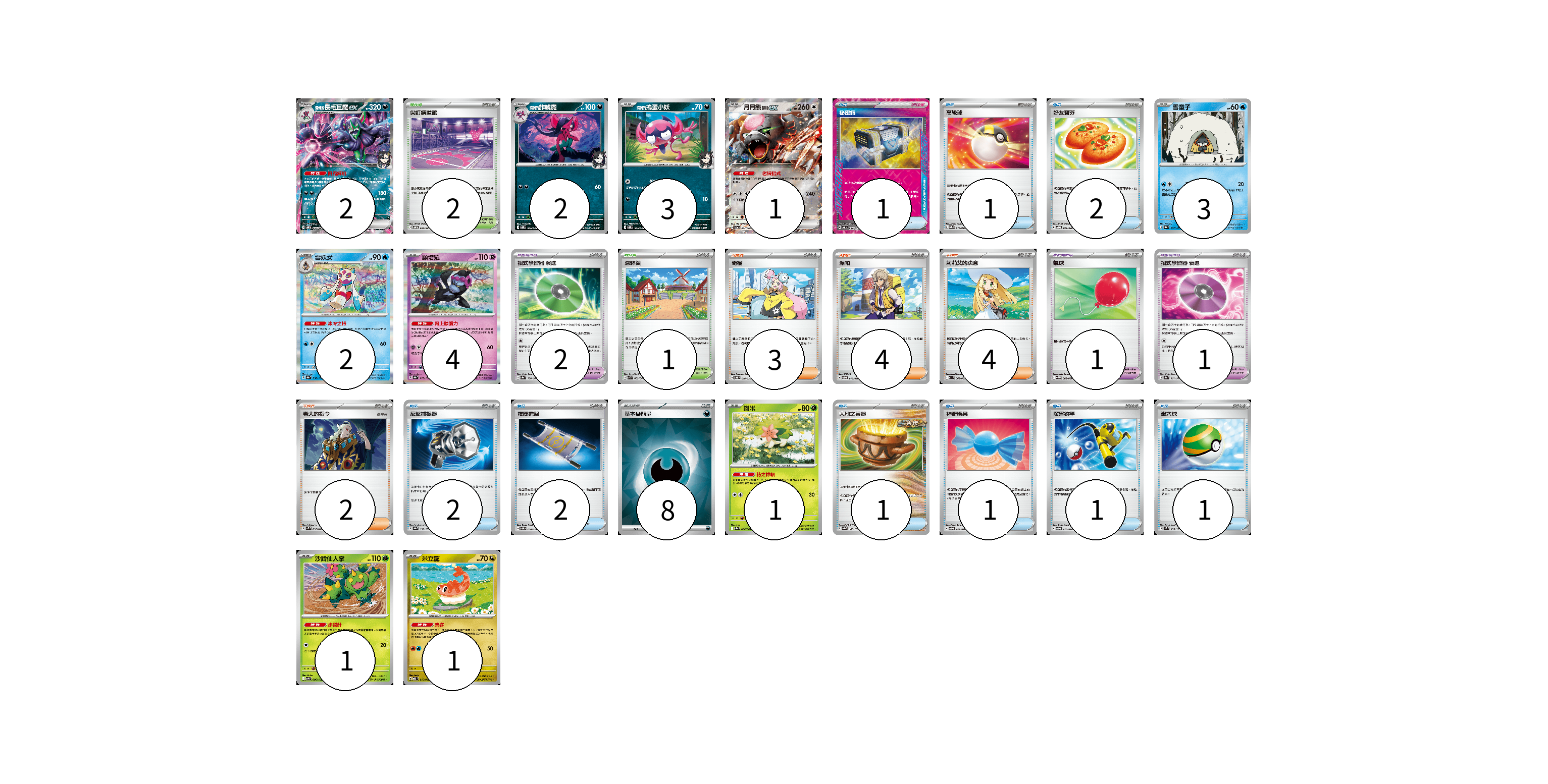 牌組構築方案 以此牌組為基礎新構築牌組 顯示卡面 顯示列表 寶可夢卡(20) 2 2 3 1 3 2 4 1 1 1 寶可夢道具(4) 2 1 1 物品卡(12) 1 1 2 2 2 1 1 1 1 支援者卡(13) 3 4 4 2 競技場卡(3) 2 1 能量卡(8) 8 寶可夢卡(20) 卡牌名稱 張數 卡牌名稱 張數 <瑪俐的>長毛巨魔ex SVOM 007/021 02 <瑪俐的>詐唬魔 SVOM 006/021 02 <瑪俐的>搗蛋小妖 SVOM 005/021 03 月月熊 赫月 ex SV5a 052/066 01 雪童子 SV8a 037/187 03 雪妖女 SV8a 038/187 02 願增猿 SV8a 075/187 04 謝米 SV9a 006/063 01 沙鈴仙人掌 SV9 006/100 01 米立龍 MBD 010/022 01 寶可夢道具(4) 卡牌名稱 張數 卡牌名稱 張數 招式學習器 演進 SV8a 160/187 02 氣球 SV11B 082/086 01 招式學習器 衰退 SV8a 161/187 01 物品卡(12) 卡牌名稱 張數 卡牌名稱 張數 秘密箱 SV6 092/101 01 高級球 SVQL 015/022 01 好友寶芬 SVOD 011/020 02 反擊捕捉器 SV8a 139/187 02 夜間擔架 SVOM 016/021 02 大地之容器 SV8a 143/187 01 神奇糖果 SVOD 013/020 01 厲害釣竿 SVOD 010/020 01 巢穴球 SVM 133/175 01 支援者卡(13) 卡牌名稱 張數 卡牌名稱 張數 奇樹 SVOD 016/020 03 派帕 SVOD 018/020 04 莉莉艾的決意 M1L 062/063 04 老大的指令 SVK 036/042 02 競技場卡(3) 卡牌名稱 張數 卡牌名稱 張數 尖釘鎮道館 SVOM 021/021 02 深缽鎮 SVK 039/042 01 能量卡(8) 卡牌名稱 張數 卡牌名稱 張數 基本【惡】能量 SVOM DAR 08 以此牌組為基礎新構築牌組 牌組編碼 feuRhk-YjbKMT-KlcrwN copy 列印牌組單 牌組編碼已複製 分享至SNS