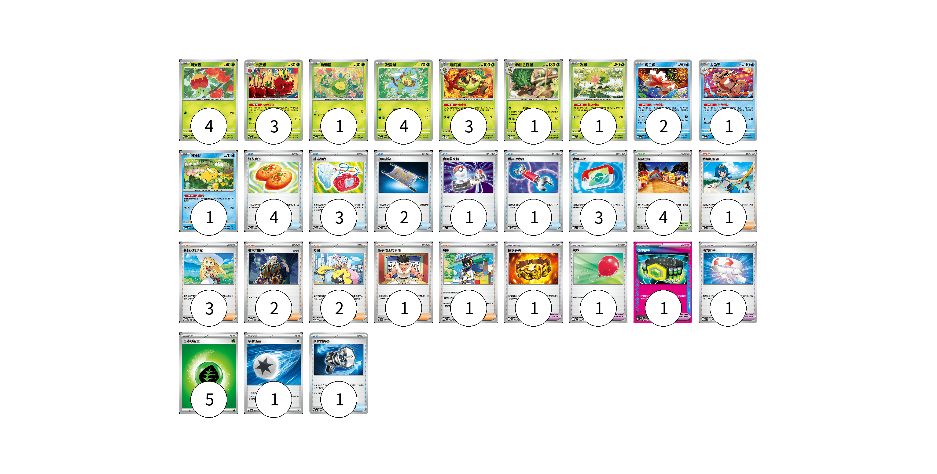 牌組構築方案 以此牌組為基礎新構築牌組 顯示卡面 顯示列表 寶可夢卡(21) 4 3 1 4 3 1 1 2 1 1 寶可夢道具(4) 1 1 1 1 物品卡(15) 4 3 2 1 1 3 1 支援者卡(10) 1 3 2 2 1 1 競技場卡(4) 4 能量卡(6) 5 1 寶可夢卡(21) 卡牌名稱 張數 卡牌名稱 張數 啃果蟲 MC 062/742 04 裹蜜蟲 SV8a 009/187 03 含羞苞 M2a 011/193 01 敲音猴 SV8a 006/187 04 啪咚猴 SV6 009/101 03 轟擂金剛猩 SV6 010/101 01 謝米 M2a 012/193 01 角金魚 SV8a 028/187 02 金魚王 SV8a 029/187 01 可達鴨 M2a 032/193 01 寶可夢道具(4) 卡牌名稱 張數 卡牌名稱 張數 猛攻手鐲 MC 689/742 01 氣球 MC 688/742 01 極限腰帶 MC 691/742 01 活力頭帶 SVM 140/175 01 物品卡(15) 卡牌名稱 張數 卡牌名稱 張數 好友寶芬 MC 648/742 04 捕蟲組合 MC 667/742 03 夜間擔架 MC 670/742 02 寶可夢交替 MC 663/742 01 道具拆除器 SV11W 080/086 01 寶可平板 MC 662/742 03 反擊捕捉器 SV8a 139/187 01 支援者卡(10) 卡牌名稱 張數 卡牌名稱 張數 水蓮的照顧 MC 712/742 01 莉莉艾的決意 M2a 175/193 03 老大的指令 MBG 021/022 02 奇樹 SVOD 016/020 02 空手道王的演練 SVM 143/175 01 烏栗 MC 713/742 01 競技場卡(4) 卡牌名稱 張數 卡牌名稱 張數 祭典會場 SV6 099/101 04 能量卡(6) 卡牌名稱 張數 卡牌名稱 張數 基本【草】能量 MC GRA 05 噴射能量 SVK 040/042 01 以此牌組為基礎新構築牌組 牌組編碼 fhjiXR-JhNTMA-JWTChG copy 列印牌組單 牌組編碼已複製 分享至SNS