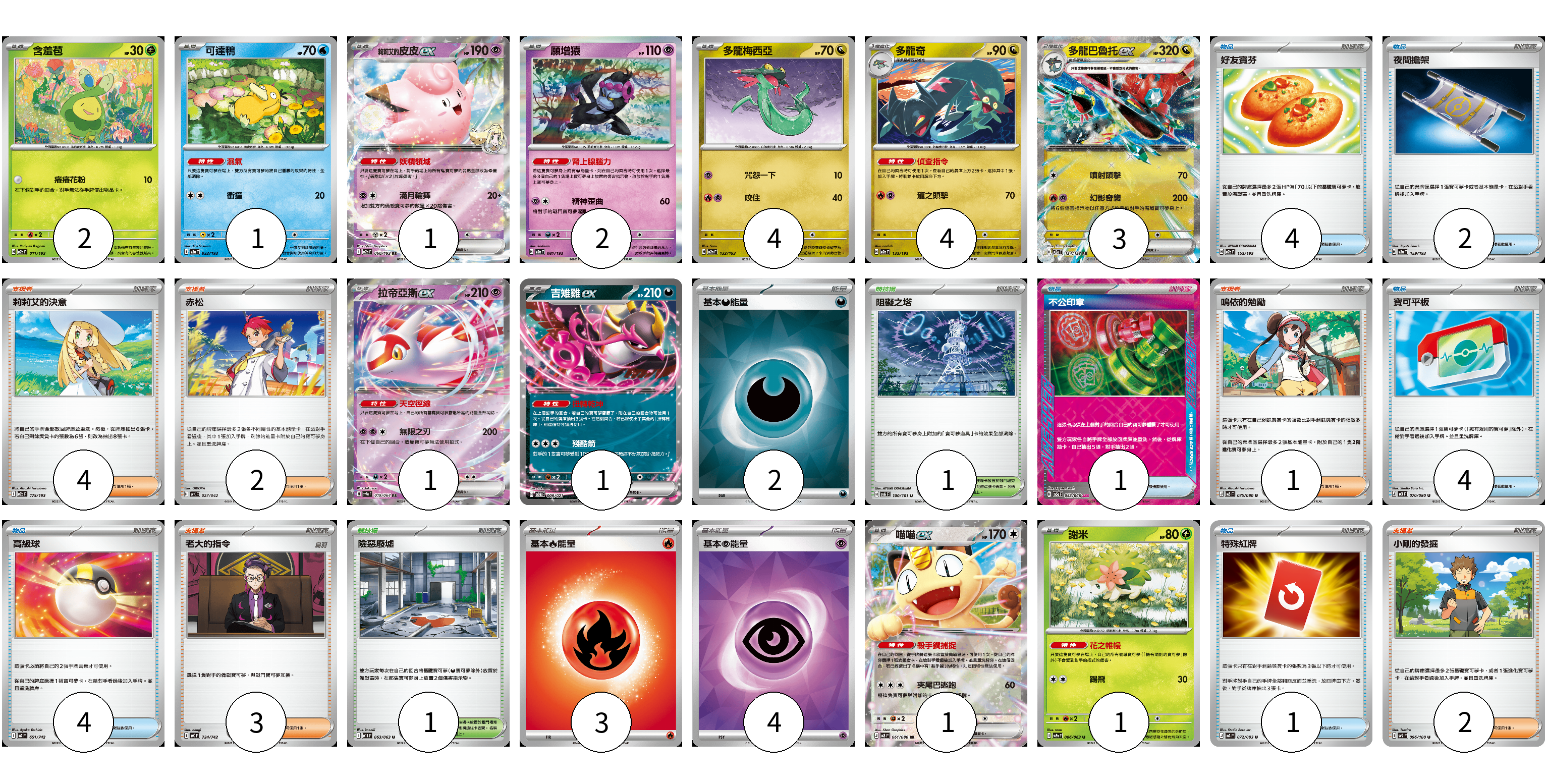 牌組構築方案 以此牌組為基礎新構築牌組 顯示卡面 顯示列表 寶可夢卡(21) 2 1 1 2 4 4 3 1 1 1 1 物品卡(16) 4 2 1 4 4 1 支援者卡(12) 4 2 1 3 2 競技場卡(2) 1 1 能量卡(9) 2 3 4 寶可夢卡(21) 卡牌名稱 張數 卡牌名稱 張數 含羞苞 M2a 011/193 02 可達鴨 M2a 032/193 01 莉莉艾的皮皮ex M2a 060/193 01 願增猿 M2a 081/193 02 多龍梅西亞 M2a 132/193 04 多龍奇 M2a 133/193 04 多龍巴魯托ex M2a 134/193 03 拉帝亞斯ex SV7a 019/064 01 吉雉雞ex SVOM 009/021 01 喵喵ex M3 061/080 01 謝米 SV9a 006/063 01 物品卡(16) 卡牌名稱 張數 卡牌名稱 張數 好友寶芬 M2a 153/193 04 夜間擔架 M2a 159/193 02 不公印章 SV5a 053/066 01 寶可平板 M3 070/080 04 高級球 MC 651/742 04 特殊紅牌 M4 072/083 01 支援者卡(12) 卡牌名稱 張數 卡牌名稱 張數 莉莉艾的決意 M2a 175/193 04 赤松 SVK 027/042 02 鳴依的勉勵 M3 075/080 01 老大的指令 MC 724/742 03 小剛的發掘 SV9 096/100 02 競技場卡(2) 卡牌名稱 張數 卡牌名稱 張數 阻礙之塔 SV6 100/101 01 險惡廢墟 M1L 063/063 01 能量卡(9) 卡牌名稱 張數 卡牌名稱 張數 基本【惡】能量 SVOM DAR 02 基本【火】能量 MC FIR 03 基本【超】能量 SVOD PSY 04 以此牌組為基礎新構築牌組 牌組編碼 fhlWAc-YWrUie-pBcFNe copy 列印牌組單 牌組編碼已複製 分享至SNS