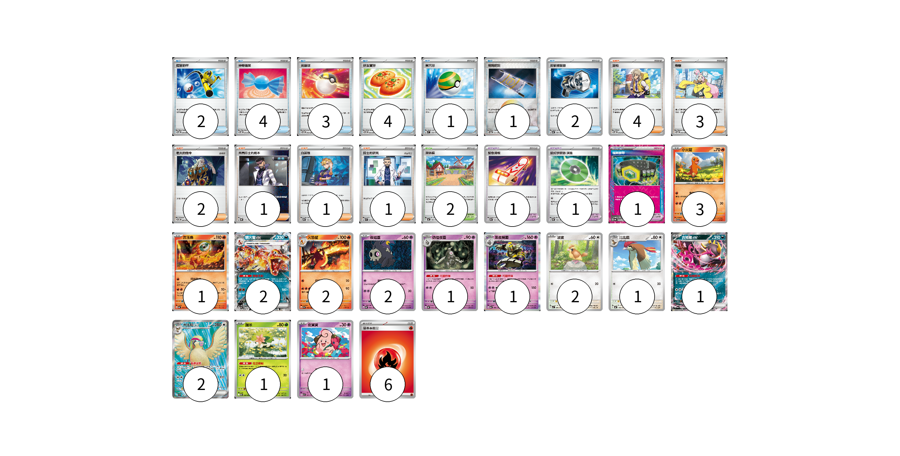 牌組構築方案 以此牌組為基礎新構築牌組 顯示卡面 顯示列表 寶可夢卡(20) 3 1 2 2 2 1 1 2 1 1 2 1 1 寶可夢道具(3) 1 1 1 物品卡(17) 2 4 3 4 1 1 2 支援者卡(12) 4 3 2 1 1 1 競技場卡(2) 2 能量卡(6) 6 寶可夢卡(20) 卡牌名稱 張數 卡牌名稱 張數 小火龍 SVTL 001/021 03 古玉魚 SV8a 025/187 01 噴火龍ex SV4a 115/190 02 火恐龍 SV2a 005/165 02 夜巡靈 SV8a 064/187 02 彷徨夜靈 SV8a 065/187 01 黑夜魔靈 SV8a 066/187 01 波波 SV3 087/108 02 比比鳥 SV4a 138/190 01 吉雉雞ex SV6a 038/064 01 大比鳥ex SV3 128/108 02 謝米 SV9a 006/063 01 皮寶寶 SV3 042/108 01 寶可夢道具(3) 卡牌名稱 張數 卡牌名稱 張數 緊急滑板 SV8a 153/187 01 招式學習器 演進 SV8a 160/187 01 極限腰帶 SV8a 159/187 01 物品卡(17) 卡牌名稱 張數 卡牌名稱 張數 厲害釣竿 SVOD 010/020 02 神奇糖果 SVOD 013/020 04 高級球 SVOM 013/021 03 好友寶芬 SVOM 012/021 04 巢穴球 SVM 133/175 01 夜間擔架 SV8a 151/187 01 反擊捕捉器 SV8a 139/187 02 支援者卡(12) 卡牌名稱 張數 卡牌名稱 張數 派帕 SVOD 018/020 04 奇樹 SVOD 016/020 03 老大的指令 SVOM 020/021 02 弗圖博士的劇本 SV8a 175/187 01 白蕾雅 SV8a 176/187 01 博士的研究 SVK 033/042 01 競技場卡(2) 卡牌名稱 張數 卡牌名稱 張數 深缽鎮 SV4a 185/190 02 能量卡(6) 卡牌名稱 張數 卡牌名稱 張數 基本【火】能量 SVHK FIR 06 以此牌組為基礎新構築牌組 牌組編碼 firrqB-yNbLjo-JRtiRo copy 列印牌組單 牌組編碼已複製 分享至SNS