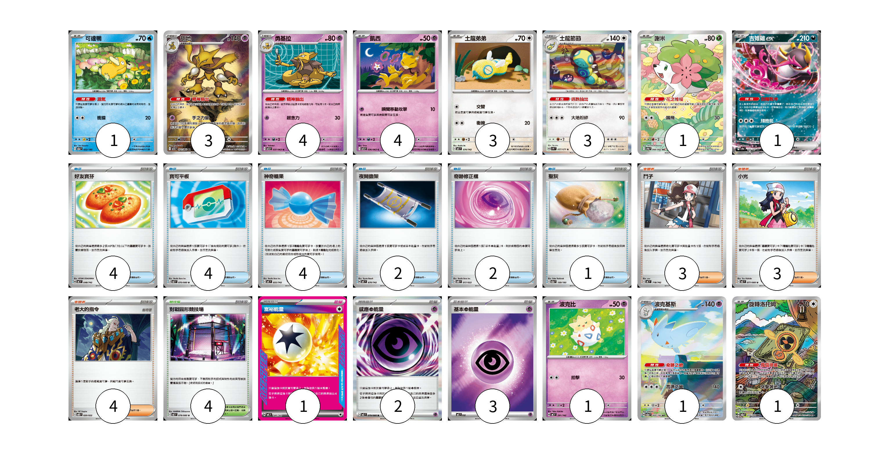 牌組構築方案 以此牌組為基礎新構築牌組 顯示卡面 顯示列表 寶可夢卡(23) 1 3 4 4 3 3 1 1 1 1 1 物品卡(17) 4 4 4 2 2 1 支援者卡(10) 3 3 4 競技場卡(4) 4 能量卡(6) 1 2 3 寶可夢卡(23) 卡牌名稱 張數 卡牌名稱 張數 可達鴨 M2a 032/193 01 胡地 M1S 071/063 03 勇基拉 M1S 037/063 04 凱西 M1S 036/063 04 土龍弟弟 MC 574/742 03 土龍節節 SV5K 057/071 03 謝米 SV9a 066/063 01 吉雉雞ex SV8a 104/187 01 波克比 MC 291/742 01 波克基斯 M2a 203/193 01 旋轉洛托姆 M2a 213/193 01 物品卡(17) 卡牌名稱 張數 卡牌名稱 張數 好友寶芬 MC 648/742 04 寶可平板 M3 070/080 04 神奇糖果 MC 655/742 04 夜間擔架 MC 670/742 02 奇跡修正檔 MBD 017/022 02 聖灰 M2a 150/193 01 支援者卡(10) 卡牌名稱 張數 卡牌名稱 張數 鬥子 MC 718/742 03 小光 M2 077/080 03 老大的指令 MBD 020/022 04 競技場卡(4) 卡牌名稱 張數 卡牌名稱 張數 對戰圓形競技場 M2 079/080 04 能量卡(6) 卡牌名稱 張數 卡牌名稱 張數 富裕能量 MC 740/742 01 感應【超】能量 M3 079/080 02 基本【超】能量 MC PSY 03 以此牌組為基礎新構築牌組 牌組編碼 fmEXbo-rktWrY-hlkCuv copy 列印牌組單 牌組編碼已複製 分享至SNS