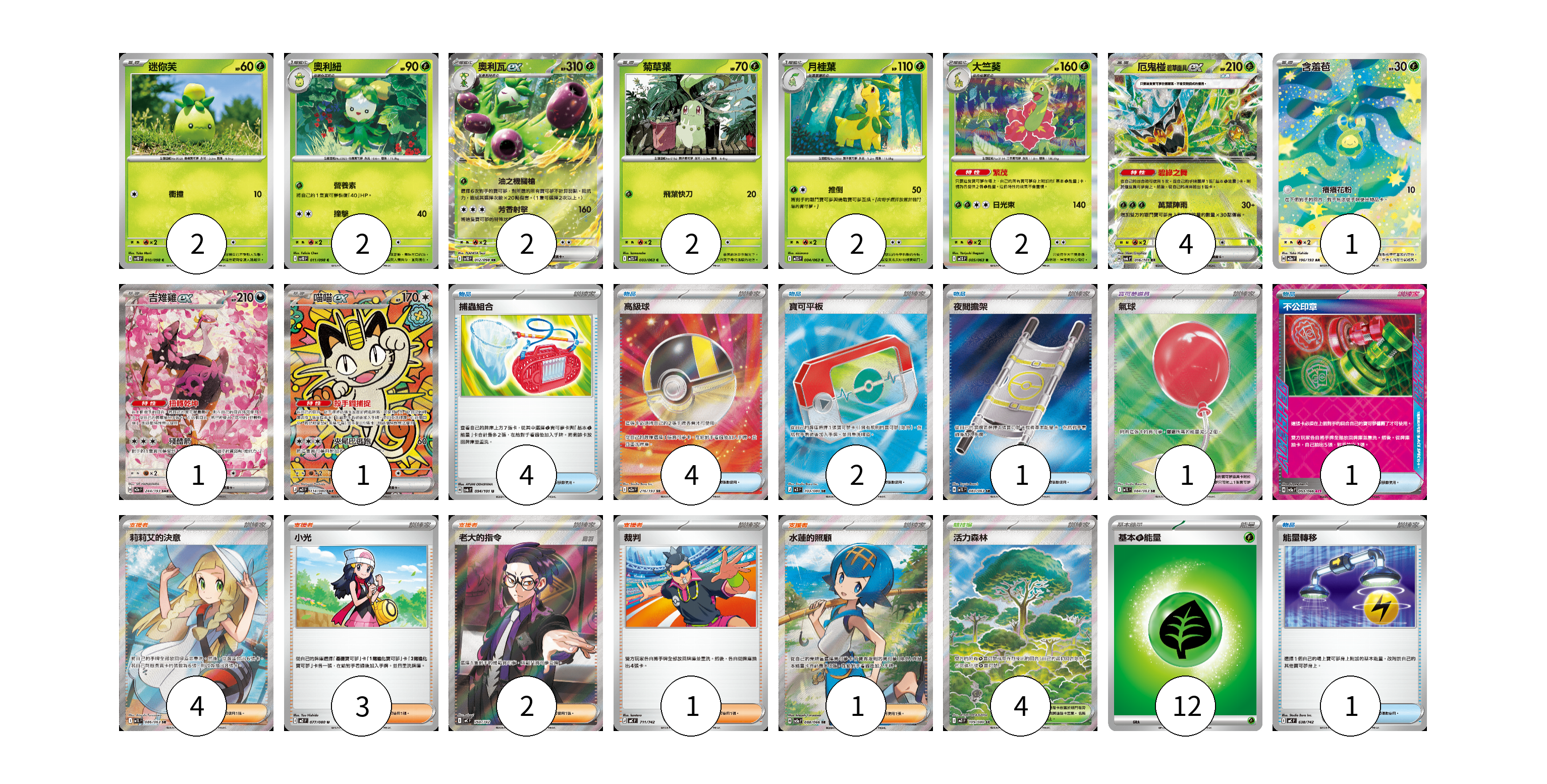 牌組構築方案 以此牌組為基礎新構築牌組 顯示卡面 顯示列表 寶可夢卡(19) 2 2 2 2 2 2 4 1 1 1 寶可夢道具(1) 1 物品卡(13) 4 4 2 1 1 1 支援者卡(11) 4 3 2 1 1 競技場卡(4) 4 能量卡(12) 12 寶可夢卡(19) 卡牌名稱 張數 卡牌名稱 張數 迷你芙 SV10 010/098 02 奧利紐 SV10 011/098 02 奧利瓦ex SV10 012/098 02 菊草葉 M1S 003/063 02 月桂葉 M1S 004/063 02 大竺葵 M1S 005/063 02 厄鬼椪 碧草面具ex SV6 016/101 04 含羞苞 M2a 196/193 01 吉雉雞ex M2a 244/193 01 喵喵ex M3 114/080 01 寶可夢道具(1) 卡牌名稱 張數 卡牌名稱 張數 氣球 M1L 084/063 01 物品卡(13) 卡牌名稱 張數 卡牌名稱 張數 捕蟲組合 SV6 094/101 04 高級球 M2a 216/193 04 寶可平板 M3 103/080 02 夜間擔架 M1L 083/063 01 不公印章 SV5a 053/066 01 能量轉移 MC 638/742 01 支援者卡(11) 卡牌名稱 張數 卡牌名稱 張數 莉莉艾的決意 M1L 086/063 04 小光 M2 077/080 03 老大的指令(烏羽) MC 760/742 02 裁判 MC 711/742 01 水蓮的照顧 SV5a 088/066 01 競技場卡(4) 卡牌名稱 張數 卡牌名稱 張數 活力森林 M3 109/080 04 能量卡(12) 卡牌名稱 張數 卡牌名稱 張數 基本【草】能量 MJ GRA 12 以此牌組為基礎新構築牌組 牌組編碼 fpDCpr-WbHLLP-TCkOyu copy 列印牌組單 牌組編碼已複製 分享至SNS