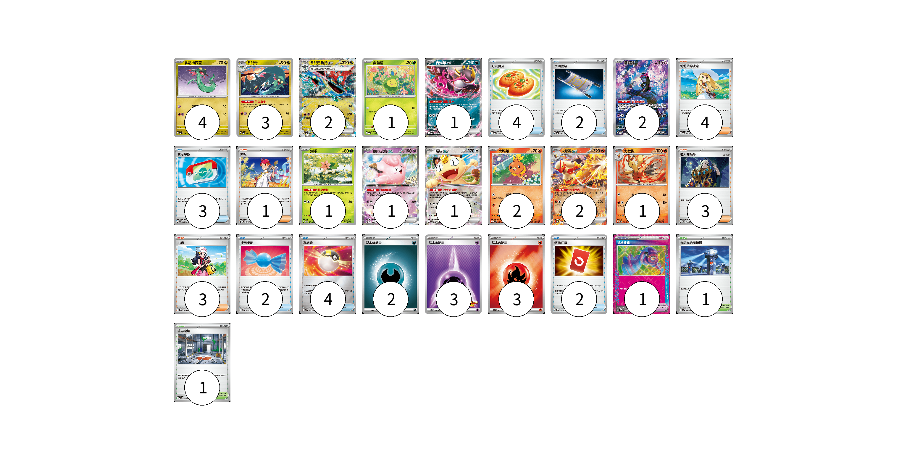牌組構築方案 以此牌組為基礎新構築牌組 顯示卡面 顯示列表 寶可夢卡(21) 4 3 2 1 1 2 1 1 1 2 2 1 寶可夢道具(1) 1 物品卡(17) 4 2 3 2 4 2 支援者卡(11) 4 1 3 3 競技場卡(2) 1 1 能量卡(8) 2 3 3 寶可夢卡(21) 卡牌名稱 張數 卡牌名稱 張數 多龍梅西亞 SV8a 118/187 04 多龍奇 SV8a 119/187 03 多龍巴魯托ex SV8a 120/187 02 含羞苞 SV8a 001/187 01 吉雉雞ex SV8a 104/187 01 願增猿 SV6 107/101 02 謝米 M2a 012/193 01 莉莉艾的皮皮ex SV9 033/100 01 喵喵ex M3 061/080 01 火稚雞 SV10 018/098 02 火焰雞ex SVM 016/175 02 力壯雞 SV10 019/098 01 寶可夢道具(1) 卡牌名稱 張數 卡牌名稱 張數 英雄斗篷 SV5M 064/071 01 物品卡(17) 卡牌名稱 張數 卡牌名稱 張數 好友寶芬 SV8a 147/187 04 夜間擔架 SV8a 151/187 02 寶可平板 MC 662/742 03 神奇糖果 MBG 013/022 02 高級球 MC 651/742 04 特殊紅牌 M4 072/083 02 支援者卡(11) 卡牌名稱 張數 卡牌名稱 張數 莉莉艾的決意 MBG 022/022 04 赤松 MC 696/742 01 老大的指令 MBD 020/022 03 小光 M2 077/080 03 競技場卡(2) 卡牌名稱 張數 卡牌名稱 張數 火箭隊的監視塔 M2a 189/193 01 險惡廢墟 M1L 063/063 01 能量卡(8) 卡牌名稱 張數 卡牌名稱 張數 基本【惡】能量 MC DAR 02 基本【超】能量 SV-P 261/SV-P 03 基本【火】能量 MC FIR 03 以此牌組為基礎新構築牌組 牌組編碼 fqUgMS-TCLrXR-VrGLNk copy 列印牌組單 牌組編碼已複製 分享至SNS