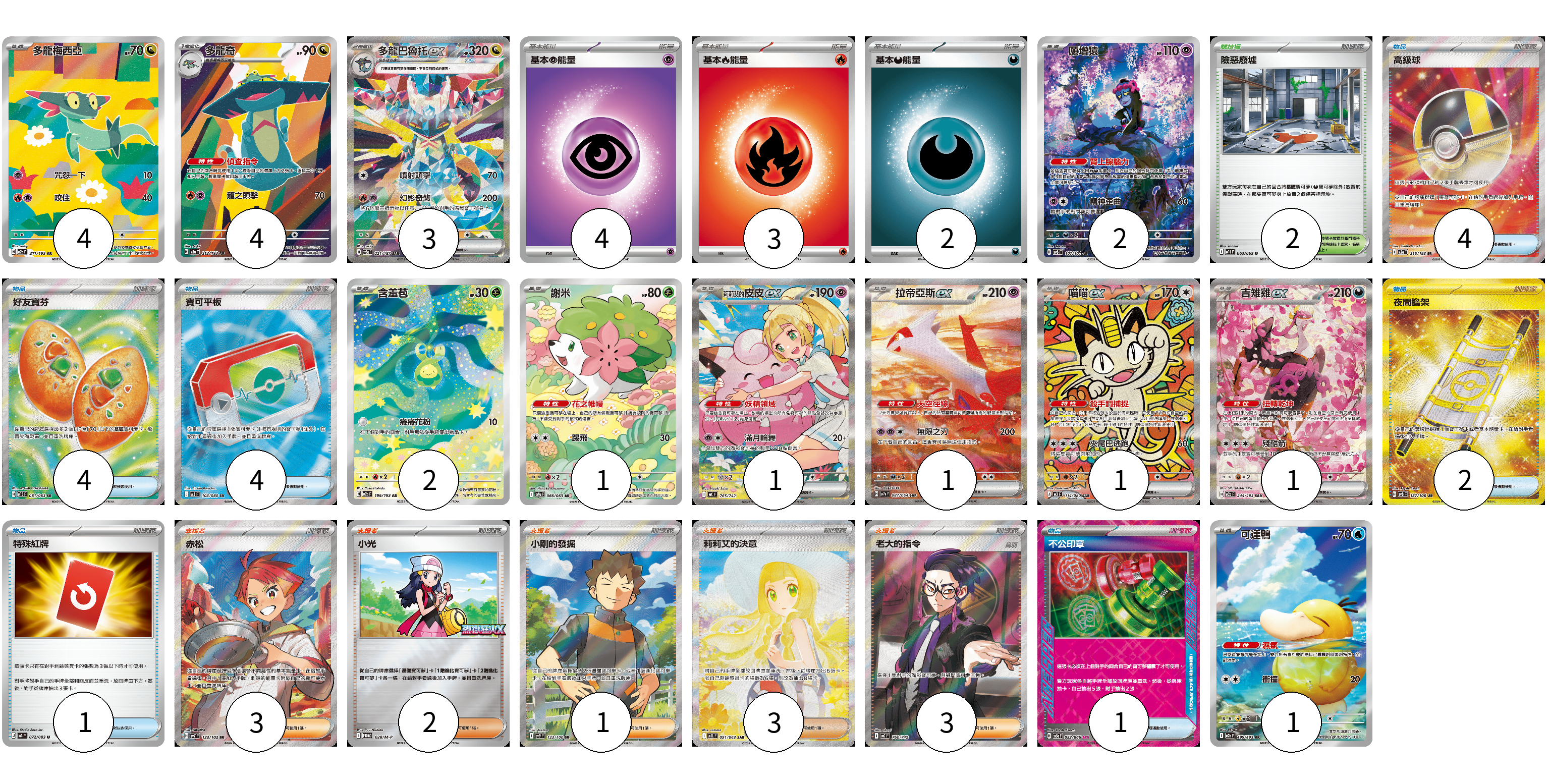 牌組構築方案 以此牌組為基礎新構築牌組 顯示卡面 顯示列表 寶可夢卡(21) 4 4 3 2 2 1 1 1 1 1 1 物品卡(16) 4 4 4 2 1 1 支援者卡(12) 3 2 1 3 3 競技場卡(2) 2 能量卡(9) 4 3 2 寶可夢卡(21) 卡牌名稱 張數 卡牌名稱 張數 多龍梅西亞 M2a 211/193 04 多龍奇 M2a 212/193 04 多龍巴魯托ex SV8a 221/187 03 願增猿 SV6 107/101 02 含羞苞 M2a 196/193 02 謝米 SV9a 066/063 01 莉莉艾的皮皮ex MC 765/742 01 拉帝亞斯ex SV7a 087/064 01 喵喵ex M3 114/080 01 吉雉雞ex M2a 244/193 01 可達鴨 M2a 199/193 01 物品卡(16) 卡牌名稱 張數 卡牌名稱 張數 高級球 M2a 216/193 04 好友寶芬 M1S 081/063 04 寶可平板 M3 103/080 04 夜間擔架 SV8 137/106 02 特殊紅牌 M4 072/083 01 不公印章 SV5a 053/066 01 支援者卡(12) 卡牌名稱 張數 卡牌名稱 張數 赤松 SV7 123/102 03 小光 M-P 028/M-P 02 小剛的發掘 SV9 123/100 01 莉莉艾的決意 M1L 091/063 03 老大的指令(烏羽) MC 760/742 03 競技場卡(2) 卡牌名稱 張數 卡牌名稱 張數 險惡廢墟 M1L 063/063 02 能量卡(9) 卡牌名稱 張數 卡牌名稱 張數 基本【超】能量 M-P PSY 04 基本【火】能量 M-P FIR 03 基本【惡】能量 M-P DAR 02 以此牌組為基礎新構築牌組 牌組編碼 fqpnIt-ONtdEs-ahuVjR copy 列印牌組單 牌組編碼已複製 分享至SNS