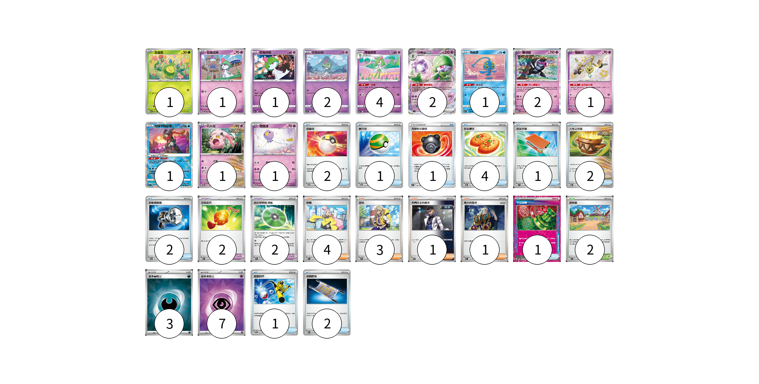 牌組構築方案 以此牌組為基礎新構築牌組 顯示卡面 顯示列表 寶可夢卡(18) 1 1 1 2 4 2 1 2 1 1 1 1 寶可夢道具(4) 2 2 物品卡(17) 2 1 1 4 1 2 2 1 1 2 支援者卡(9) 4 3 1 1 競技場卡(2) 2 能量卡(10) 3 7 寶可夢卡(18) 卡牌名稱 張數 卡牌名稱 張數 含羞苞 SV8a 001/187 01 拉魯拉絲 SVTS 002/022 01 拉魯拉絲 SVF 006/038 01 拉魯拉絲 S9a 032/067 02 奇魯莉安 SVF 007/038 04 沙奈朵ex SV1S 028/078 02 瑪納霏 SVF 003/038 01 願增猿 SV8a 075/187 02 鑰圈兒 SV4a 264/190 01 光輝甲賀忍蛙 SVF 004/038 01 吼叫尾 SVTS 007/022 01 飄飄球 SVTS 005/022 01 寶可夢道具(4) 卡牌名稱 張數 卡牌名稱 張數 勇氣護符 SVK 024/042 02 招式學習器 演進 SVK 025/042 02 物品卡(17) 卡牌名稱 張數 卡牌名稱 張數 高級球 SVTR 014/021 02 巢穴球 SVTS 013/022 01 洗翠的沉重球 SVF 019/038 01 好友寶芬 SV8a 147/187 04 朋友手冊 SVK 014/042 01 大地之容器 SV8a 143/187 02 反擊捕捉器 SV8a 139/187 02 不公印章 SV5a 053/066 01 厲害釣竿 SVTR 012/021 01 夜間擔架 SV6a 056/064 02 支援者卡(9) 卡牌名稱 張數 卡牌名稱 張數 奇樹 SVM 160/175 04 派帕 SVK 035/042 03 弗圖博士的劇本 SV8a 175/187 01 老大的指令 SVM 172/175 01 競技場卡(2) 卡牌名稱 張數 卡牌名稱 張數 深缽鎮 SVK 039/042 02 能量卡(10) 卡牌名稱 張數 卡牌名稱 張數 基本【惡】能量 SVK DAR 03 基本【超】能量 SVK PSY 07 以此牌組為基礎新構築牌組 牌組編碼 ftHDNw-hbYFWm-mWFEMn copy 列印牌組單 牌組編碼已複製 分享至SNS