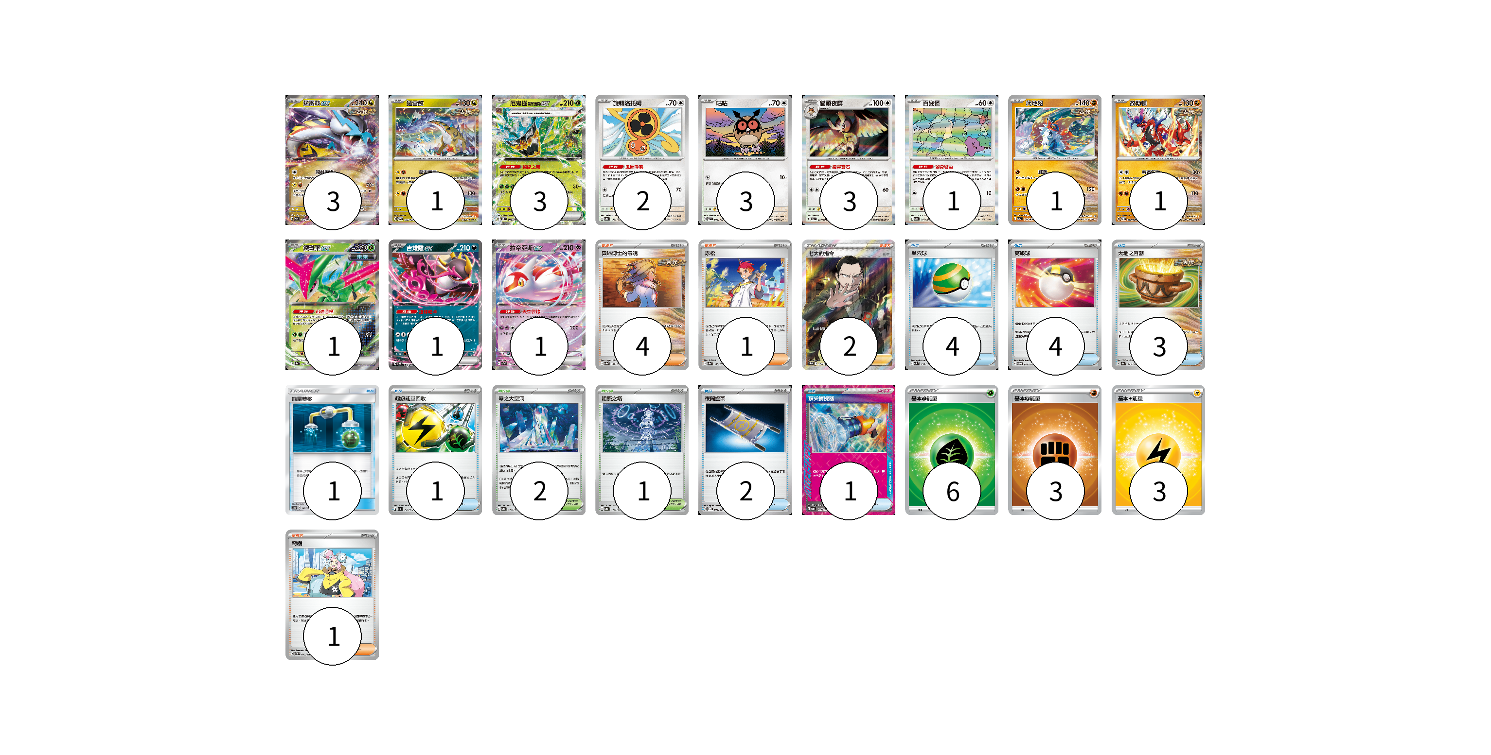 牌組構築方案 以此牌組為基礎新構築牌組 顯示卡面 顯示列表 寶可夢卡(21) 3 1 3 2 3 3 1 1 1 1 1 1 物品卡(16) 4 4 3 1 1 2 1 支援者卡(8) 4 1 2 1 競技場卡(3) 2 1 能量卡(12) 6 3 3 寶可夢卡(21) 卡牌名稱 張數 卡牌名稱 張數 猛雷鼓ex SV5K 053/071 03 猛雷鼓 SV7 075/102 01 厄鬼椪 碧草面具ex SV6 016/101 03 旋轉洛托姆 SV8a 131/187 02 咕咕 SV7 076/102 03 貓頭夜鷹 SV7 077/102 03 百變怪 SV4a 144/190 01 爬地翅 SV4K 041/066 01 故勒頓 SV8 069/106 01 鐵斑葉ex SV8a 016/187 01 吉雉雞ex SVOD 004/020 01 拉帝亞斯ex SV7a 019/064 01 物品卡(16) 卡牌名稱 張數 卡牌名稱 張數 巢穴球 SVM 133/175 04 高級球 SVOD 012/020 04 大地之容器 SV8a 143/187 03 能量轉移 AS6D 142/168 01 超級能量回收 SV1a 064/073 01 夜間擔架 SVOM 016/021 02 頂尖捕捉器 SV8a 148/187 01 支援者卡(8) 卡牌名稱 張數 卡牌名稱 張數 奧琳博士的氣魄 SV8a 167/187 04 赤松 SV8a 163/187 01 老大的指令(坂木) SC1b 170/153 02 奇樹 SVTH 015/018 01 競技場卡(3) 卡牌名稱 張數 卡牌名稱 張數 零之大空洞 SV8a 182/187 02 阻礙之塔 SV8a 181/187 01 能量卡(12) 卡牌名稱 張數 卡牌名稱 張數 基本【草】能量 SI GRA 06 基本【鬥】能量 SI FIG 03 基本【雷】能量 SI LIG 03 以此牌組為基礎新構築牌組 牌組編碼 fvZjOk-NJOoaK-KEUCwL copy 列印牌組單 牌組編碼已複製 分享至SNS
