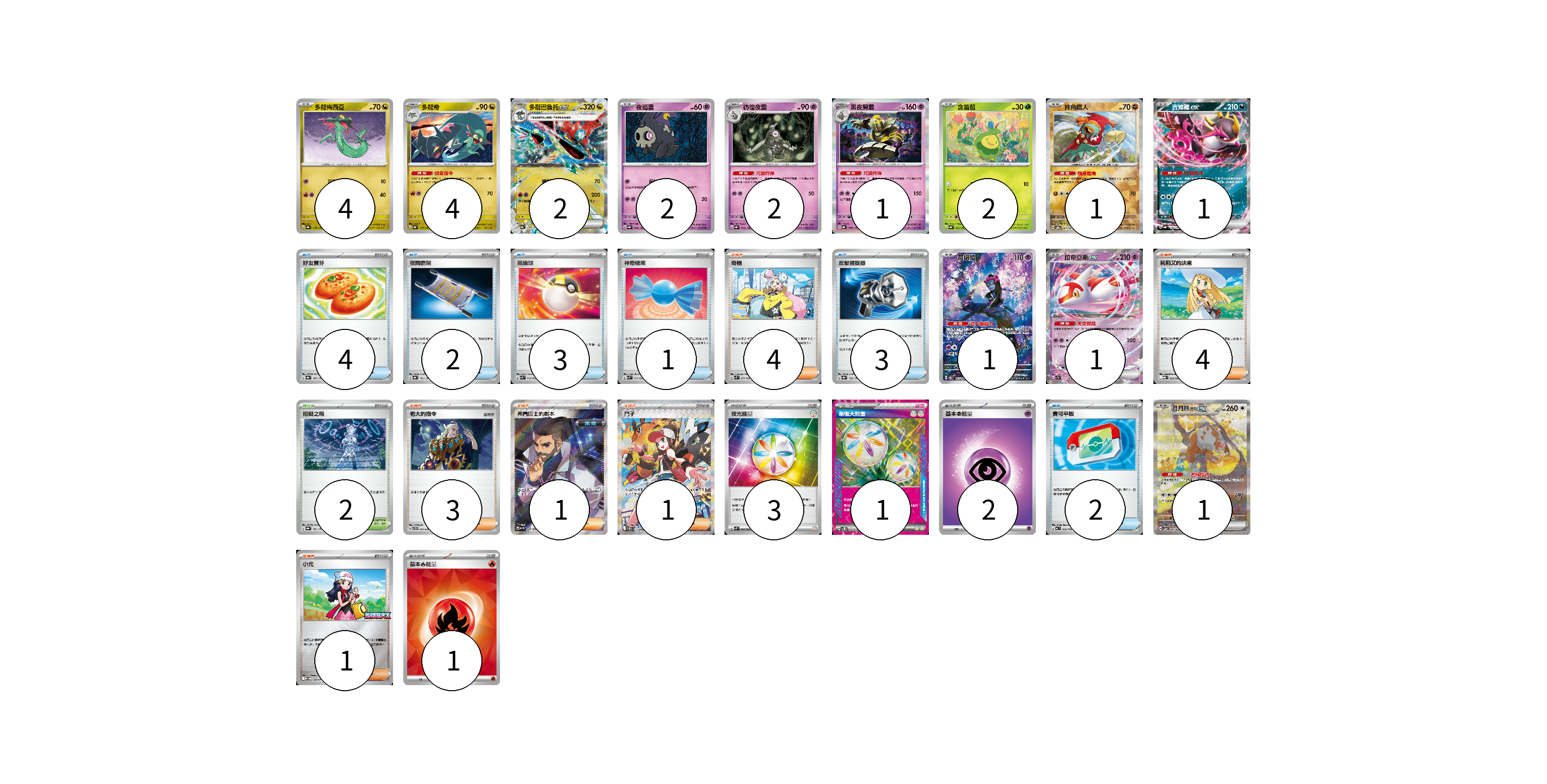 牌組構築方案 以此牌組為基礎新構築牌組 顯示卡面 顯示列表 寶可夢卡(22) 4 4 2 2 2 1 2 1 1 1 1 1 物品卡(15) 4 2 3 1 3 2 支援者卡(14) 4 4 3 1 1 1 競技場卡(2) 2 能量卡(7) 3 1 2 1 寶可夢卡(22) 卡牌名稱 張數 卡牌名稱 張數 多龍梅西亞 SV8a 118/187 04 多龍奇 SV8a 119/187 04 多龍巴魯托ex SV8a 120/187 02 夜巡靈 SV8a 064/187 02 彷徨夜靈 SV8a 065/187 02 黑夜魔靈 SV8a 066/187 01 含羞苞 SV8a 001/187 02 摔角鷹人 SV8a 084/187 01 吉雉雞ex SV8a 104/187 01 願增猿 SV6 107/101 01 拉帝亞斯ex SV7a 019/064 01 月月熊 赫月 ex SV5a 091/066 01 物品卡(15) 卡牌名稱 張數 卡牌名稱 張數 好友寶芬 SV8a 147/187 04 夜間擔架 SV8a 151/187 02 高級球 SVK 018/042 03 神奇糖果 SVK 019/042 01 反擊捕捉器 SV8a 139/187 03 寶可平板 MC 662/742 02 支援者卡(14) 卡牌名稱 張數 卡牌名稱 張數 奇樹 SVK 031/042 04 莉莉艾的決意 MBG 022/022 04 老大的指令 SVTH 017/018 03 弗圖博士的劇本 SV4M 086/066 01 鬥子 SV11W 173/086 01 小光 M-P 028/M-P 01 競技場卡(2) 卡牌名稱 張數 卡牌名稱 張數 阻礙之塔 SV8a 181/187 02 能量卡(7) 卡牌名稱 張數 卡牌名稱 張數 夜光能量 SVK 042/042 03 新衝天能量 SV5K 071/071 01 基本【超】能量 M-P PSY 02 基本【火】能量 SVQL FIR 01 以此牌組為基礎新構築牌組 牌組編碼 fzhyMf-exbzft-fNsHPL copy 列印牌組單 牌組編碼已複製 分享至SNS