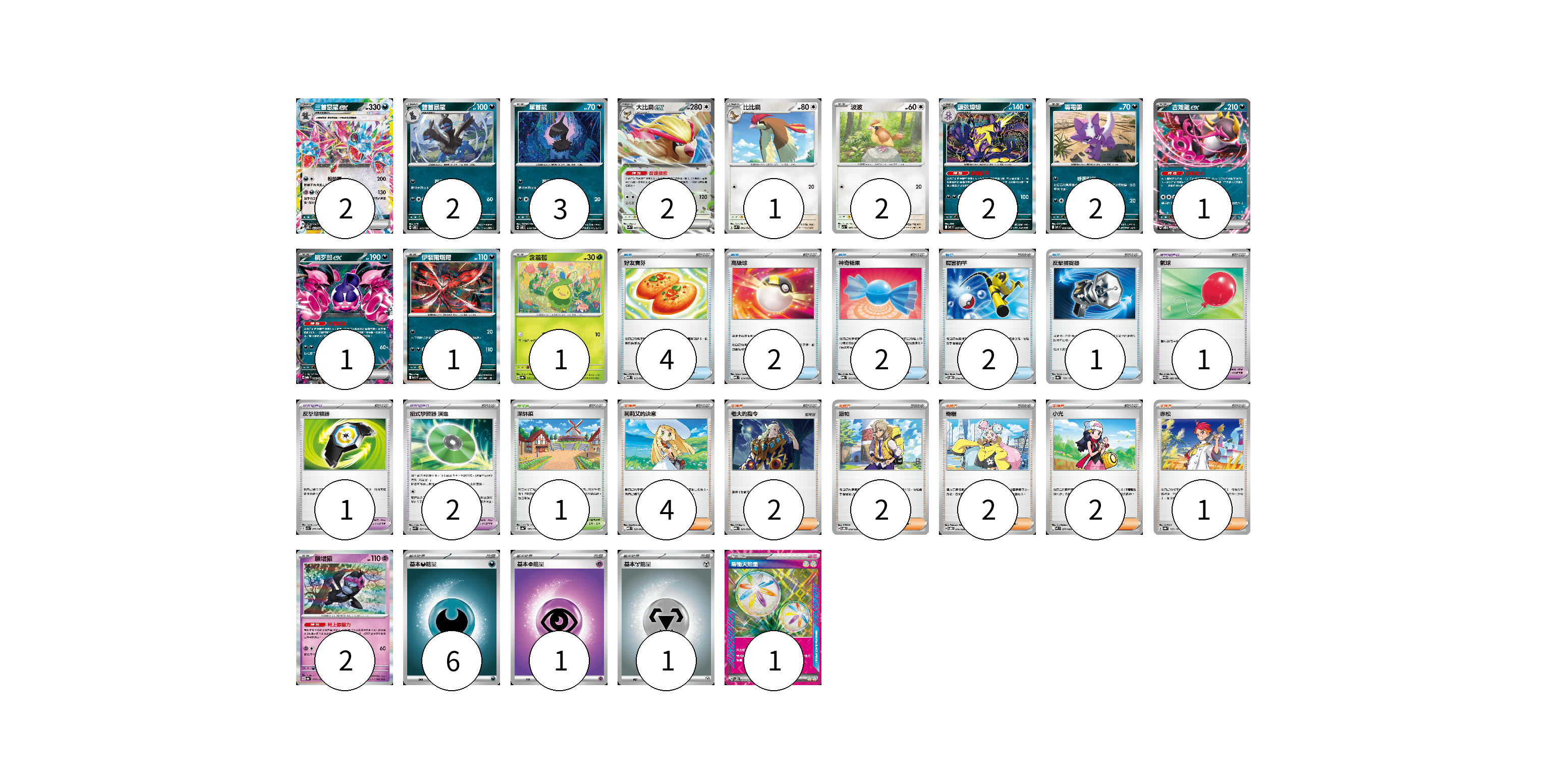 牌組構築方案 以此牌組為基礎新構築牌組 顯示卡面 顯示列表 寶可夢卡(22) 2 2 3 2 1 2 2 2 1 1 1 1 2 寶可夢道具(4) 1 1 2 物品卡(11) 4 2 2 2 1 支援者卡(13) 4 2 2 2 2 1 競技場卡(1) 1 能量卡(9) 6 1 1 1 寶可夢卡(22) 卡牌名稱 張數 卡牌名稱 張數 三首惡龍ex SV8 072/106 02 雙首暴龍 SV8 071/106 02 單首龍 SV8 070/106 03 大比鳥ex SVK 005/042 02 比比鳥 SVK 004/042 01 波波 SV3 087/108 02 顫弦蠑螈 M2 057/080 02 毒電嬰 M2 056/080 02 吉雉雞ex SVOD 004/020 01 桃歹郎ex MBG 009/022 01 伊裴爾塔爾 M1L 040/063 01 含羞苞 SV8a 001/187 01 願增猿 SV8a 075/187 02 寶可夢道具(4) 卡牌名稱 張數 卡牌名稱 張數 氣球 SV11B 082/086 01 反擊增幅器 SV7a 059/064 01 招式學習器 演進 SVK 025/042 02 物品卡(11) 卡牌名稱 張數 卡牌名稱 張數 好友寶芬 MBD 013/022 04 高級球 MBD 014/022 02 神奇糖果 MBG 013/022 02 厲害釣竿 SVOD 010/020 02 反擊捕捉器 SV8a 139/187 01 支援者卡(13) 卡牌名稱 張數 卡牌名稱 張數 莉莉艾的決意 MBD 021/022 04 老大的指令 MBG 021/022 02 派帕 SVOD 018/020 02 奇樹 SVOD 016/020 02 小光 M2 077/080 02 赤松 SV8a 163/187 01 競技場卡(1) 卡牌名稱 張數 卡牌名稱 張數 深缽鎮 SV4a 185/190 01 能量卡(9) 卡牌名稱 張數 卡牌名稱 張數 基本【惡】能量 MBG DAR 06 基本【超】能量 MBD PSY 01 基本【鋼】能量 M-P MET 01 新衝天能量 SV5K 071/071 01 以此牌組為基礎新構築牌組 牌組編碼 gCqTPf-ERBzNj-uMzmTU copy 列印牌組單 牌組編碼已複製 分享至SNS