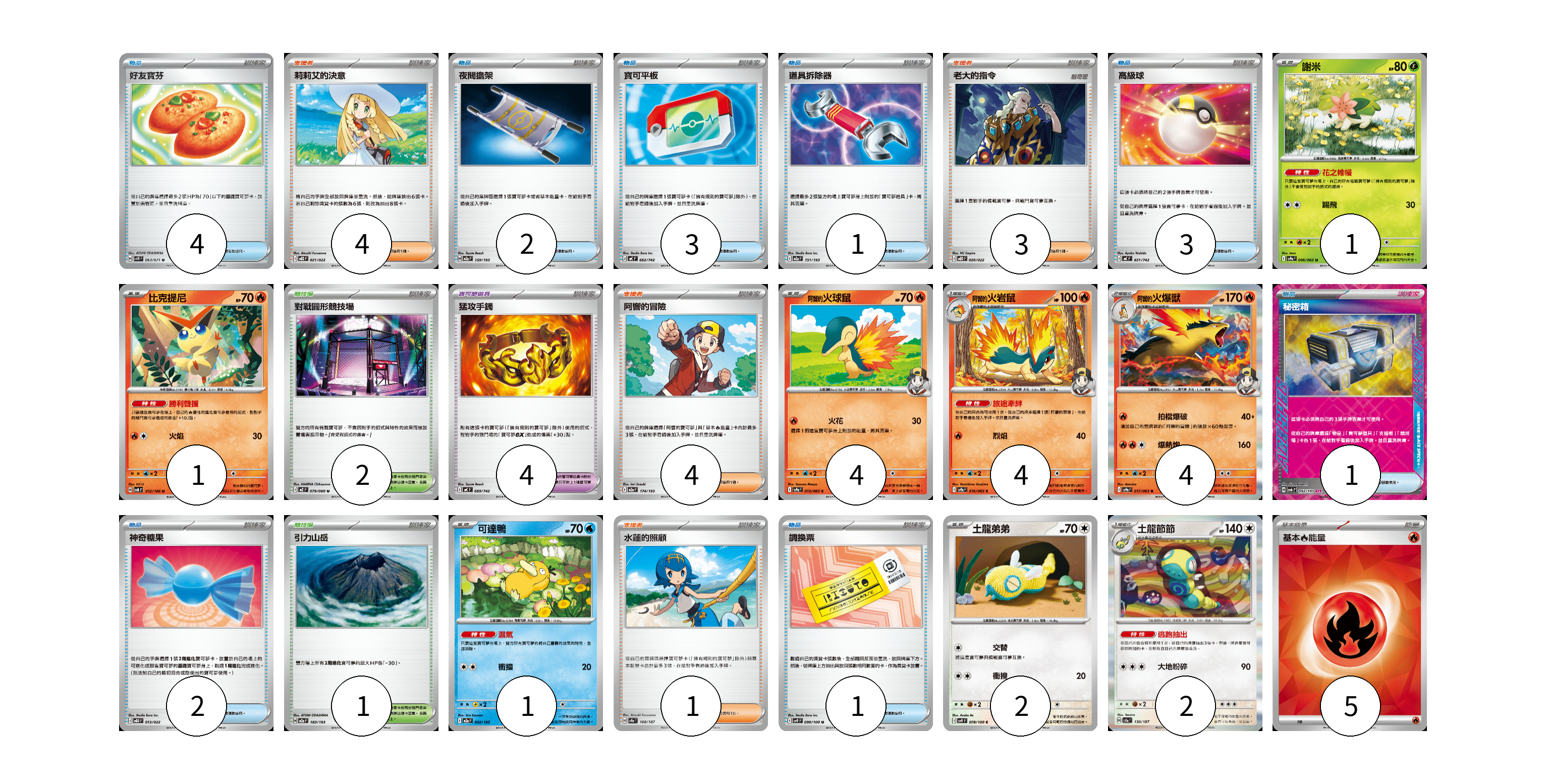 牌組構築方案 以此牌組為基礎新構築牌組 顯示卡面 顯示列表 寶可夢卡(19) 1 1 4 4 4 1 2 2 寶可夢道具(4) 4 物品卡(17) 4 2 3 1 3 1 2 1 支援者卡(12) 4 3 4 1 競技場卡(3) 2 1 能量卡(5) 5 寶可夢卡(19) 卡牌名稱 張數 卡牌名稱 張數 謝米 SV9a 006/063 01 比克提尼 SV8 012/106 01 <阿響的>火球鼠 SV9a 015/063 04 <阿響的>火岩鼠 SV9a 016/063 04 <阿響的>火爆獸 SV9a 017/063 04 可達鴨 M2a 032/193 01 土龍弟弟 SV9 078/100 02 土龍節節 SV8a 130/187 02 寶可夢道具(4) 卡牌名稱 張數 卡牌名稱 張數 猛攻手鐲 MC 689/742 04 物品卡(17) 卡牌名稱 張數 卡牌名稱 張數 好友寶芬 SV5K 063/071 04 夜間擔架 M2a 159/193 02 寶可平板 MC 662/742 03 道具拆除器 M2a 151/193 01 高級球 MC 651/742 03 秘密箱 SV6 092/101 01 神奇糖果 MBG 013/022 02 調換票 SV9 090/100 01 支援者卡(12) 卡牌名稱 張數 卡牌名稱 張數 莉莉艾的決意 MBD 021/022 04 老大的指令 MBD 020/022 03 阿響的冒險 M2a 174/193 04 水蓮的照顧 SV8a 168/187 01 競技場卡(3) 卡牌名稱 張數 卡牌名稱 張數 對戰圓形競技場 M2 079/080 02 引力山岳 M2a 183/193 01 能量卡(5) 卡牌名稱 張數 卡牌名稱 張數 基本【火】能量 SVM FIR 05 以此牌組為基礎新構築牌組 牌組編碼 gCsdvk-fCkiJA-HzyKrO copy 列印牌組單 牌組編碼已複製 分享至SNS