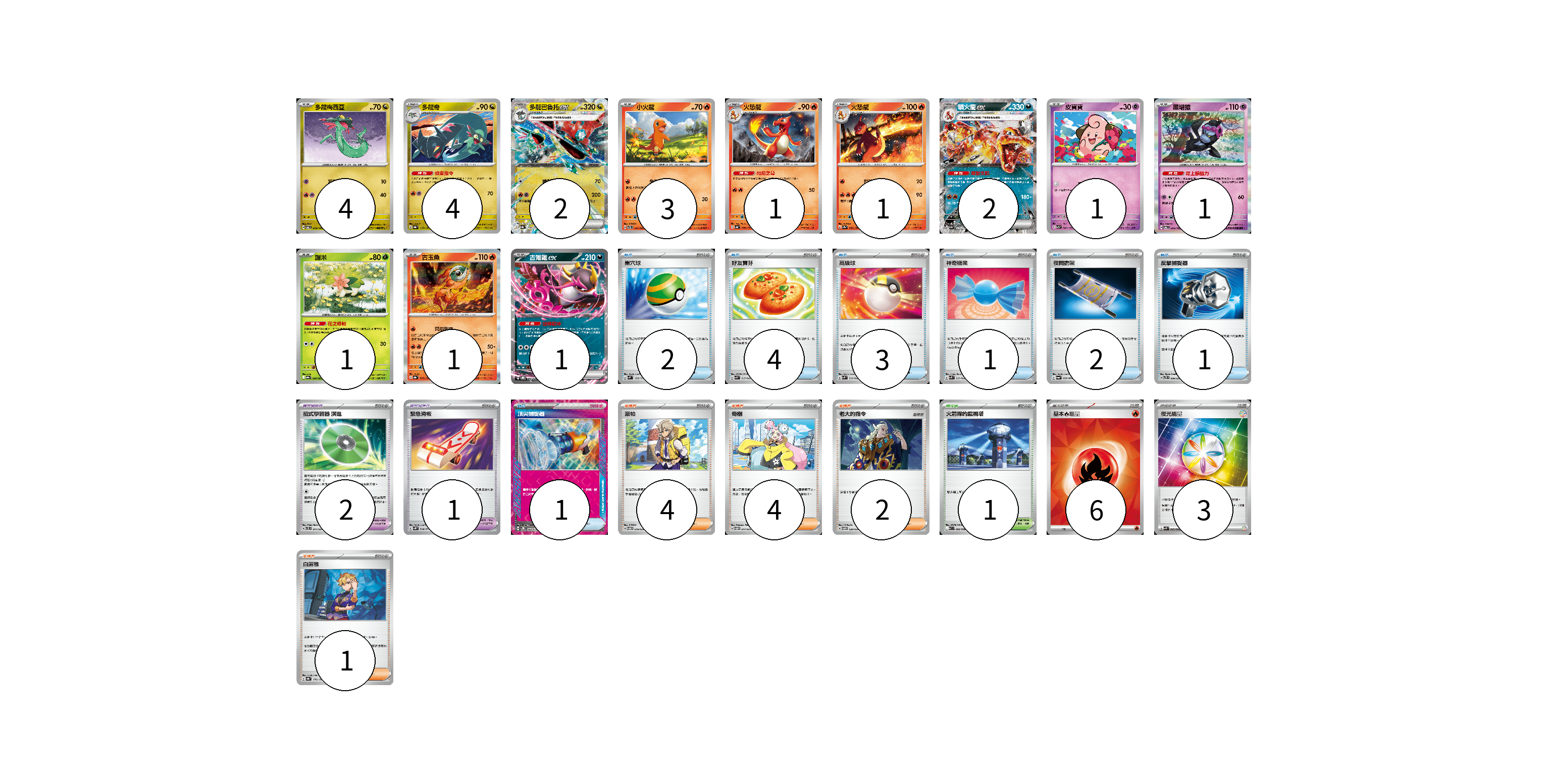 牌組構築方案 以此牌組為基礎新構築牌組 顯示卡面 顯示列表 寶可夢卡(22) 4 4 2 3 1 1 2 1 1 1 1 1 寶可夢道具(3) 2 1 物品卡(14) 2 4 3 1 2 1 1 支援者卡(11) 4 4 2 1 競技場卡(1) 1 能量卡(9) 6 3 寶可夢卡(22) 卡牌名稱 張數 卡牌名稱 張數 多龍梅西亞 SV6 079/101 04 多龍奇 SV8a 119/187 04 多龍巴魯托ex SV8a 120/187 02 小火龍 SVTL 001/021 03 火恐龍 SV4a 026/190 01 火恐龍 SV2a 005/165 01 噴火龍ex SV4a 115/190 02 皮寶寶 SV3 042/108 01 願增猿 SV6 055/101 01 謝米 SV9a 006/063 01 古玉魚 SV8a 025/187 01 吉雉雞ex SVOD 004/020 01 寶可夢道具(3) 卡牌名稱 張數 卡牌名稱 張數 招式學習器 演進 SVTL 017/021 02 緊急滑板 SV5K 064/071 01 物品卡(14) 卡牌名稱 張數 卡牌名稱 張數 巢穴球 SVM 133/175 02 好友寶芬 SVK 015/042 04 高級球 SVK 018/042 03 神奇糖果 SVK 019/042 01 夜間擔架 SV6a 056/064 02 反擊捕捉器 SVTS 009/022 01 頂尖捕捉器 SV5M 062/071 01 支援者卡(11) 卡牌名稱 張數 卡牌名稱 張數 派帕 SVTM 019/022 04 奇樹 SVTM 017/022 04 老大的指令 SVTM 020/022 02 白蕾雅 SV8a 176/187 01 競技場卡(1) 卡牌名稱 張數 卡牌名稱 張數 火箭隊的監視塔 SV10 096/098 01 能量卡(9) 卡牌名稱 張數 卡牌名稱 張數 基本【火】能量 SVK FIR 06 夜光能量 SVK 042/042 03 以此牌組為基礎新構築牌組 牌組編碼 gIOOaU-gWRNmS-ZjxYqA copy 列印牌組單 牌組編碼已複製 分享至SNS