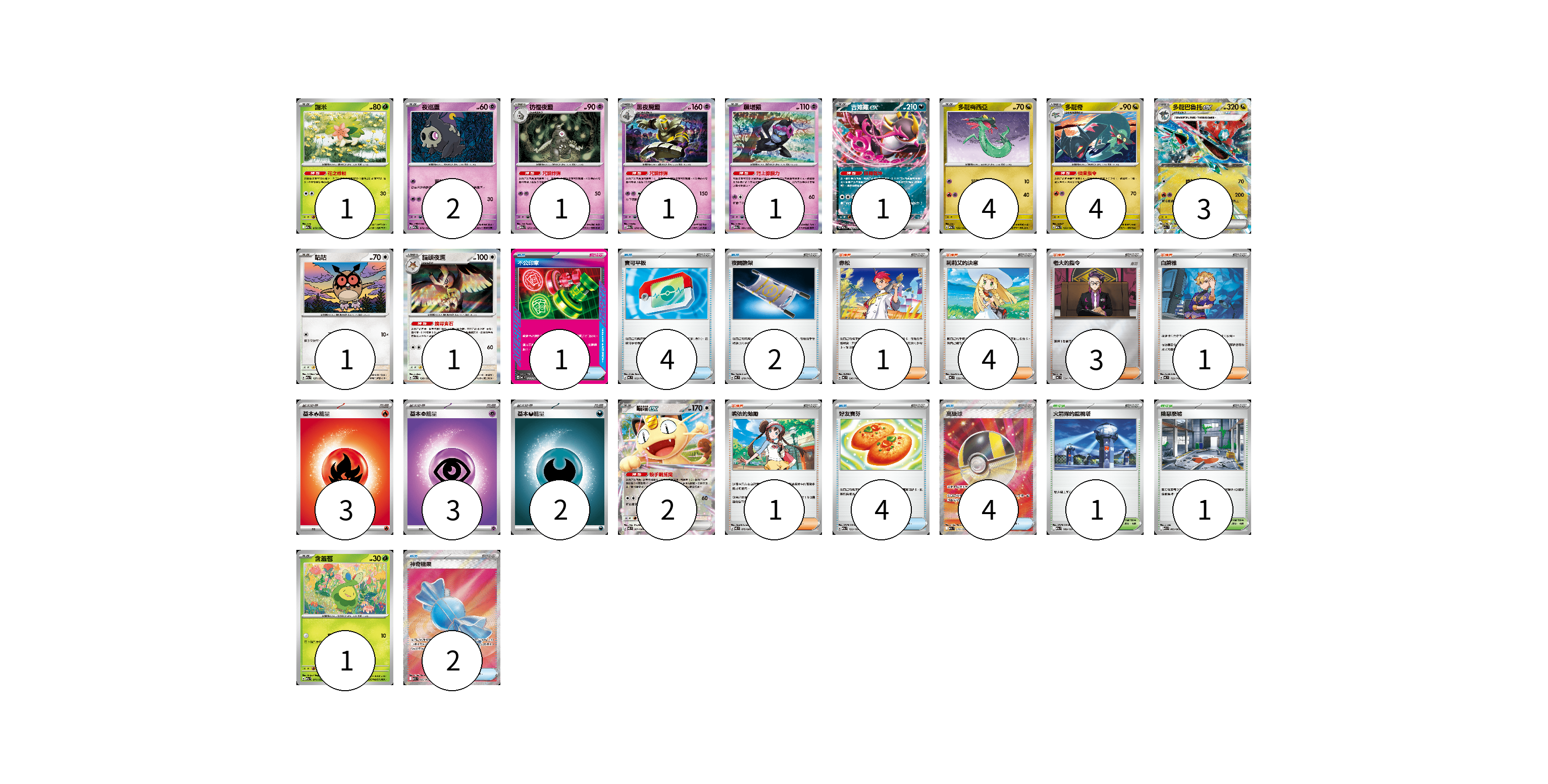 牌組構築方案 以此牌組為基礎新構築牌組 顯示卡面 顯示列表 寶可夢卡(23) 1 2 1 1 1 1 4 4 3 1 1 2 1 物品卡(17) 1 4 2 4 4 2 支援者卡(10) 1 4 3 1 1 競技場卡(2) 1 1 能量卡(8) 3 3 2 寶可夢卡(23) 卡牌名稱 張數 卡牌名稱 張數 謝米 M2a 012/193 01 夜巡靈 M2a 072/193 02 彷徨夜靈 M2a 073/193 01 黑夜魔靈 M2a 074/193 01 願增猿 M2a 081/193 01 吉雉雞ex M2a 114/193 01 多龍梅西亞 M2a 132/193 04 多龍奇 M2a 133/193 04 多龍巴魯托ex M2a 134/193 03 咕咕 M2a 137/193 01 貓頭夜鷹 M2a 138/193 01 喵喵ex M3 061/080 02 含羞苞 M2a 011/193 01 物品卡(17) 卡牌名稱 張數 卡牌名稱 張數 不公印章 MC 633/742 01 寶可平板 MC 662/742 04 夜間擔架 MC 670/742 02 好友寶芬 M2a 153/193 04 高級球 M2a 216/193 04 神奇糖果 M1S 082/063 02 支援者卡(10) 卡牌名稱 張數 卡牌名稱 張數 赤松 MC 696/742 01 莉莉艾的決意 MC 729/742 04 老大的指令 MC 724/742 03 白蕾雅 MC 722/742 01 鳴依的勉勵 M3 075/080 01 競技場卡(2) 卡牌名稱 張數 卡牌名稱 張數 火箭隊的監視塔 M2a 189/193 01 險惡廢墟 M1L 063/063 01 能量卡(8) 卡牌名稱 張數 卡牌名稱 張數 基本【火】能量 MC FIR 03 基本【超】能量 MC PSY 03 基本【惡】能量 MC DAR 02 以此牌組為基礎新構築牌組 牌組編碼 gLDCpJ-IsuYbz-rvIQwh copy 列印牌組單 牌組編碼已複製 分享至SNS