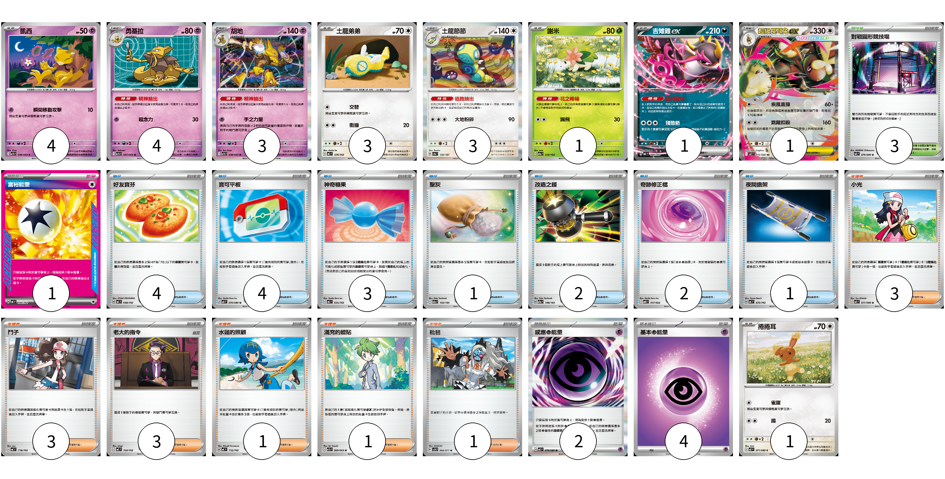 牌組構築方案 以此牌組為基礎新構築牌組 顯示卡面 顯示列表 寶可夢卡(21) 4 4 3 3 3 1 1 1 1 物品卡(17) 4 4 3 1 2 2 1 支援者卡(12) 3 3 3 1 1 1 競技場卡(3) 3 能量卡(7) 1 2 4 寶可夢卡(21) 卡牌名稱 張數 卡牌名稱 張數 凱西 M1S 036/063 04 勇基拉 M1S 037/063 04 胡地 M1S 038/063 03 土龍弟弟 MC 574/742 03 土龍節節 SV8a 130/187 03 謝米 M2a 012/193 01 吉雉雞ex MC 489/742 01 超級長耳兔ex M2 072/080 01 捲捲耳 M2 071/080 01 物品卡(17) 卡牌名稱 張數 卡牌名稱 張數 好友寶芬 MC 648/742 04 寶可平板 M3 070/080 04 神奇糖果 MC 655/742 03 聖灰 M2a 150/193 01 改造之錘 M2a 148/193 02 奇跡修正檔 MBD 017/022 02 夜間擔架 MC 670/742 01 支援者卡(12) 卡牌名稱 張數 卡牌名稱 張數 小光 M2 077/080 03 鬥子 MC 718/742 03 老大的指令 MC 724/742 03 水蓮的照顧 MC 712/742 01 滿充的體貼 M1S 060/063 01 枇琶 SV5K 068/071 01 競技場卡(3) 卡牌名稱 張數 卡牌名稱 張數 對戰圓形競技場 M2 079/080 03 能量卡(7) 卡牌名稱 張數 卡牌名稱 張數 富裕能量 MC 740/742 01 感應【超】能量 M3 079/080 02 基本【超】能量 MC PSY 04 以此牌組為基礎新構築牌組 牌組編碼 gQjJns-fNlMZk-svGdPZ copy 列印牌組單 牌組編碼已複製 分享至SNS