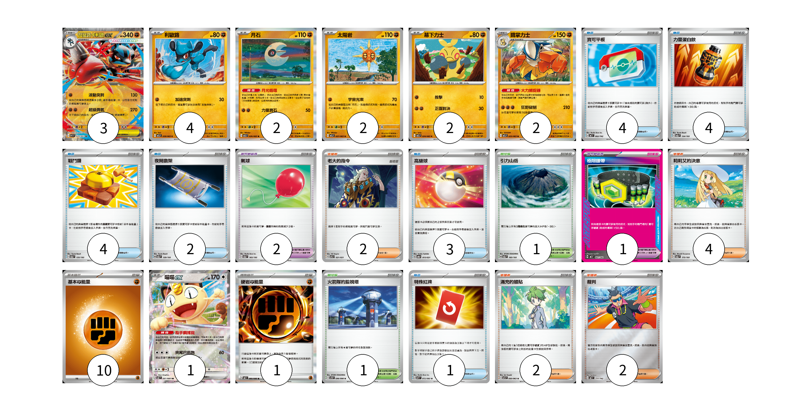 牌組構築方案 以此牌組為基礎新構築牌組 顯示卡面 顯示列表 寶可夢卡(16) 3 4 2 2 2 2 1 寶可夢道具(3) 2 1 物品卡(18) 4 4 4 2 3 1 支援者卡(10) 2 4 2 2 競技場卡(2) 1 1 能量卡(11) 10 1 寶可夢卡(16) 卡牌名稱 張數 卡牌名稱 張數 超級路卡利歐ex M1L 029/063 03 利歐路 M1L 028/063 04 月石 M1L 026/063 02 太陽岩 M1L 027/063 02 幕下力士 M1L 024/063 02 鐵掌力士 M1L 025/063 02 喵喵ex M3 061/080 01 寶可夢道具(3) 卡牌名稱 張數 卡牌名稱 張數 氣球 M2a 165/193 02 極限腰帶 MC 691/742 01 物品卡(18) 卡牌名稱 張數 卡牌名稱 張數 寶可平板 MC 662/742 04 力量蛋白飲 M2a 154/193 04 戰鬥鑼 M2a 155/193 04 夜間擔架 M2a 159/193 02 高級球 SVOM 013/021 03 特殊紅牌 M4 072/083 01 支援者卡(10) 卡牌名稱 張數 卡牌名稱 張數 老大的指令 SVTL 021/021 02 莉莉艾的決意 M2a 175/193 04 滿充的體貼 M1S 060/063 02 裁判 MC 711/742 02 競技場卡(2) 卡牌名稱 張數 卡牌名稱 張數 引力山岳 M2a 183/193 01 火箭隊的監視塔 SV10 096/098 01 能量卡(11) 卡牌名稱 張數 卡牌名稱 張數 基本【鬥】能量 MC FIG 10 硬岩【鬥】能量 M3 080/080 01 以此牌組為基礎新構築牌組 牌組編碼 gRrApz-eRTYlw-cSgcpV copy 列印牌組單 牌組編碼已複製 分享至SNS