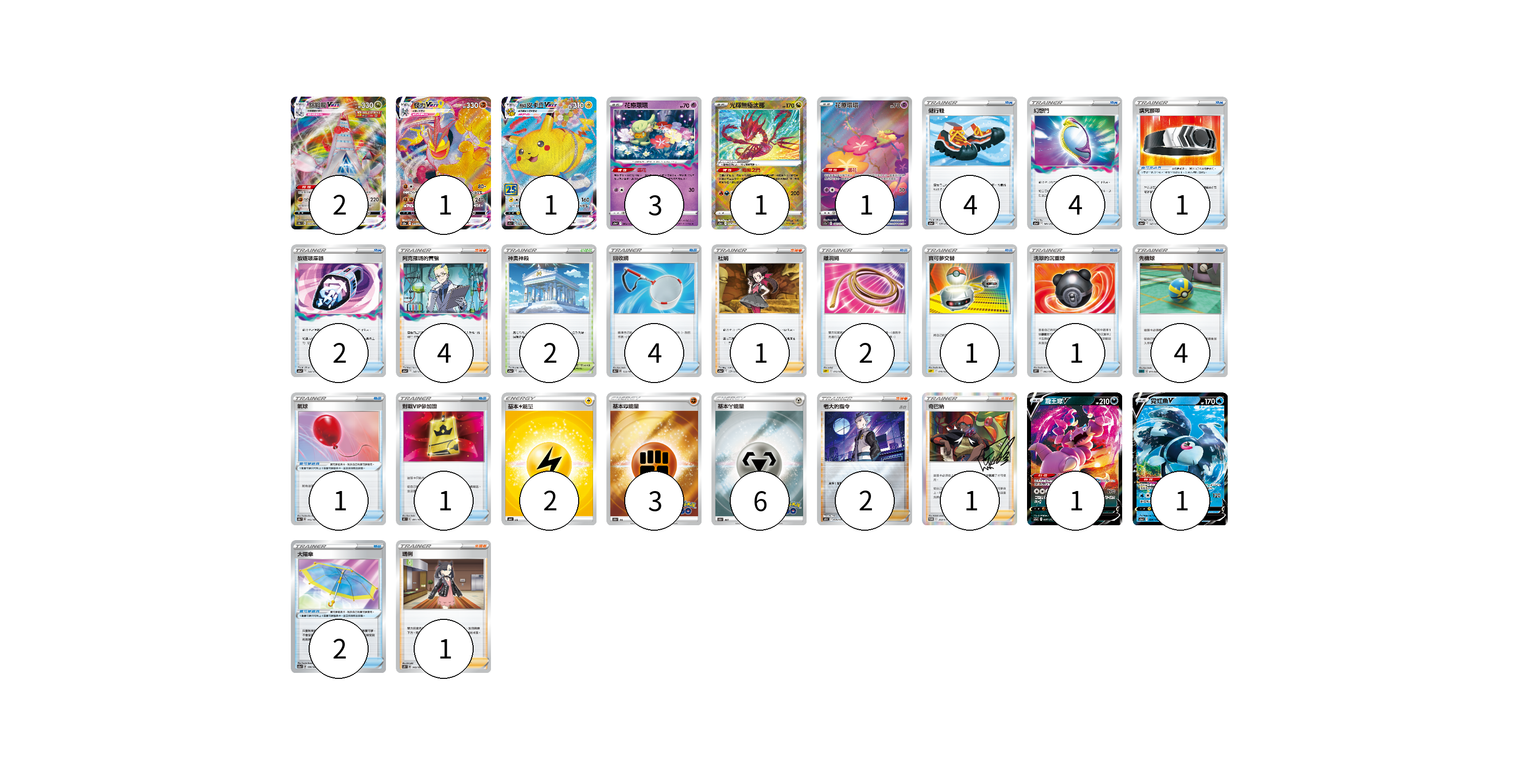 牌組構築方案 以此牌組為基礎新構築牌組 顯示卡面 顯示列表 寶可夢卡(11) 2 1 1 3 1 1 1 1 寶可夢道具(4) 1 1 2 物品卡(23) 4 4 2 4 2 1 1 4 1 支援者卡(9) 4 1 2 1 1 競技場卡(2) 2 能量卡(11) 2 3 6 寶可夢卡(11) 卡牌名稱 張數 卡牌名稱 張數 鋁鋼龍VMAX S8b 123/184 02 怪力VMAX S12a 072/172 01 飛翔皮卡丘VMAX S8a 024/028 01 花療環環 S12a 064/172 03 光輝無極汰那 S12a 115/172 01 花療環環 S12a 187/172 01 龍王蠍V S12a 085/172 01 霓虹魚V S12a 026/172 01 寶可夢道具(4) 卡牌名稱 張數 卡牌名稱 張數 講究腰帶 S12a 145/172 01 氣球 S8b 145/184 01 大陽傘 SC2a 136/145 02 物品卡(23) 卡牌名稱 張數 卡牌名稱 張數 健行鞋 S12a 137/172 04 幻想門 S12a 141/172 04 放逐吸塵器 S12a 144/172 02 回收網 S8b 133/184 04 離洞繩 SDP 012/022 02 寶可夢交替 SDP 016/022 01 洗翠的沉重球 S10P 062/067 01 先機球 SLD 011/020 04 對戰VIP參加證 S8 091/100 01 支援者卡(9) 卡牌名稱 張數 卡牌名稱 張數 阿克羅瑪的實驗 S12a 148/172 04 杜娟 S12a 157/172 01 老大的指令(赤日) SO 028/030 02 奇巴納 S-P 203/S-P 01 瑪俐 SCB 143/156 01 競技場卡(2) 卡牌名稱 張數 卡牌名稱 張數 神奧神殿 S12a 169/172 02 能量卡(11) 卡牌名稱 張數 卡牌名稱 張數 基本雷能量 SN LIG 02 基本鬥能量 S10b FIG 03 基本鋼能量 S10b MET 06 以此牌組為基礎新構築牌組 牌組編碼 gSStAf-cujUZm-kjPKIy copy 列印牌組單 牌組編碼已複製 分享至SNS