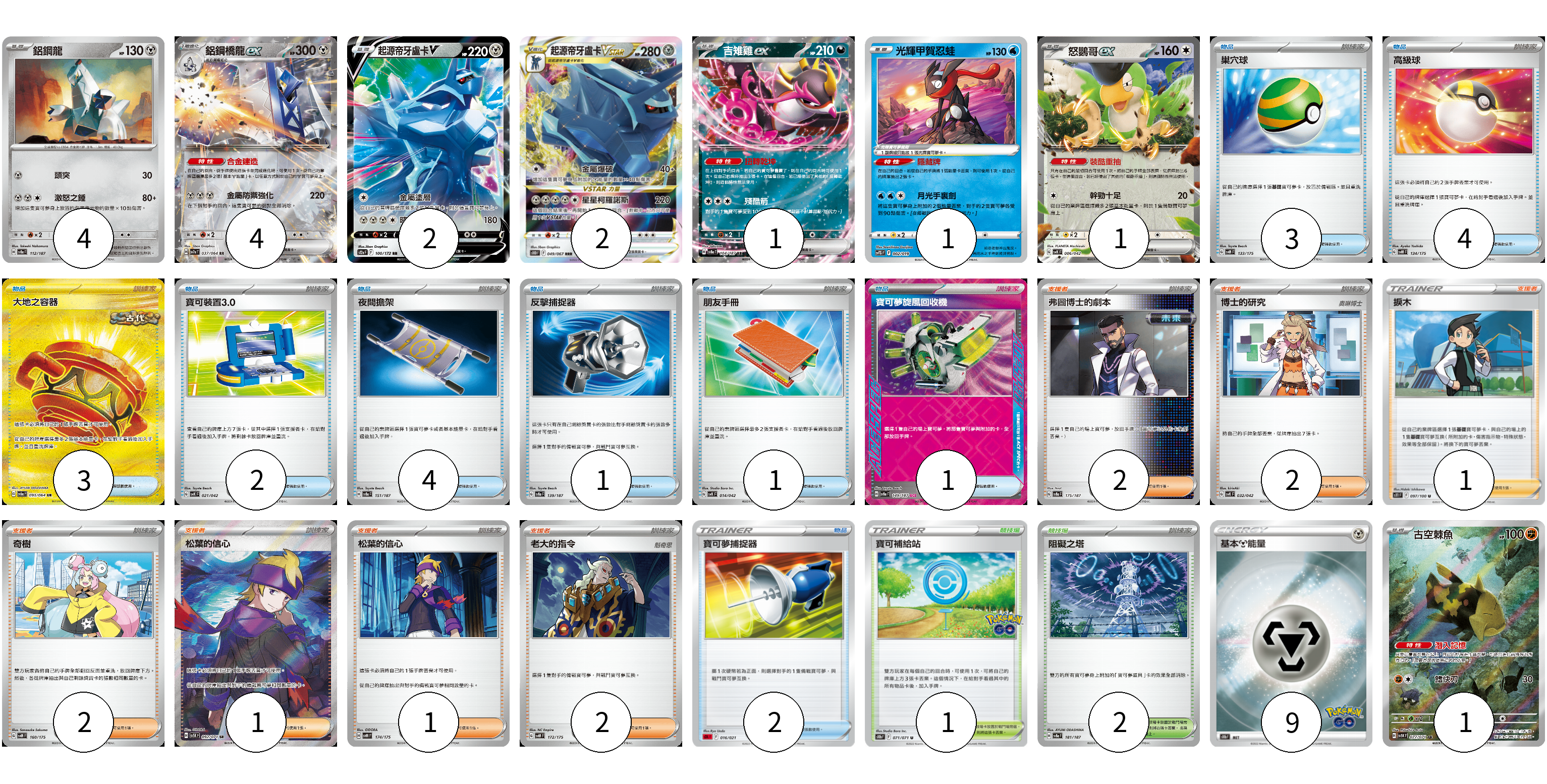 牌組構築方案 以此牌組為基礎新構築牌組 顯示卡面 顯示列表 寶可夢卡(16) 4 4 2 2 1 1 1 1 物品卡(21) 3 4 3 2 4 1 1 1 2 支援者卡(11) 2 2 1 2 1 1 2 競技場卡(3) 1 2 能量卡(9) 9 寶可夢卡(16) 卡牌名稱 張數 卡牌名稱 張數 鋁鋼龍 SV8a 112/187 04 鋁鋼橋龍ex SV7a 037/064 04 起源帝牙盧卡V S12a 100/172 02 起源帝牙盧卡VSTAR S10D 049/067 02 吉雉雞ex SV8a 104/187 01 光輝甲賀忍蛙 SVTG 002/019 01 怒鸚哥ex SVK 006/042 01 古空棘魚 SV5K 077/071 01 物品卡(21) 卡牌名稱 張數 卡牌名稱 張數 巢穴球 SVM 133/175 03 高級球 SVM 134/175 04 大地之容器 SV6a 093/064 03 寶可裝置3.0 SVK 021/042 02 夜間擔架 SV8a 151/187 04 反擊捕捉器 SV8a 139/187 01 朋友手冊 SVK 014/042 01 寶可夢旋風回收機 SV8a 149/187 01 寶可夢捕捉器 SDL 016/021 02 支援者卡(11) 卡牌名稱 張數 卡牌名稱 張數 弗圖博士的劇本 SV8a 175/187 02 博士的研究 SVK 032/042 02 捩木 S11 097/100 01 奇樹 SVM 160/175 02 松葉的信心 SV5K 092/071 01 松葉的信心 SVM 174/175 01 老大的指令 SVM 172/175 02 競技場卡(3) 卡牌名稱 張數 卡牌名稱 張數 寶可補給站 S10b 071/071 01 阻礙之塔 SV8a 181/187 02 能量卡(9) 卡牌名稱 張數 卡牌名稱 張數 基本鋼能量 S10b MET 09 以此牌組為基礎新構築牌組 牌組編碼 gVCJWa-HfjiWW-VqLDVt copy 列印牌組單 牌組編碼已複製 分享至SNS