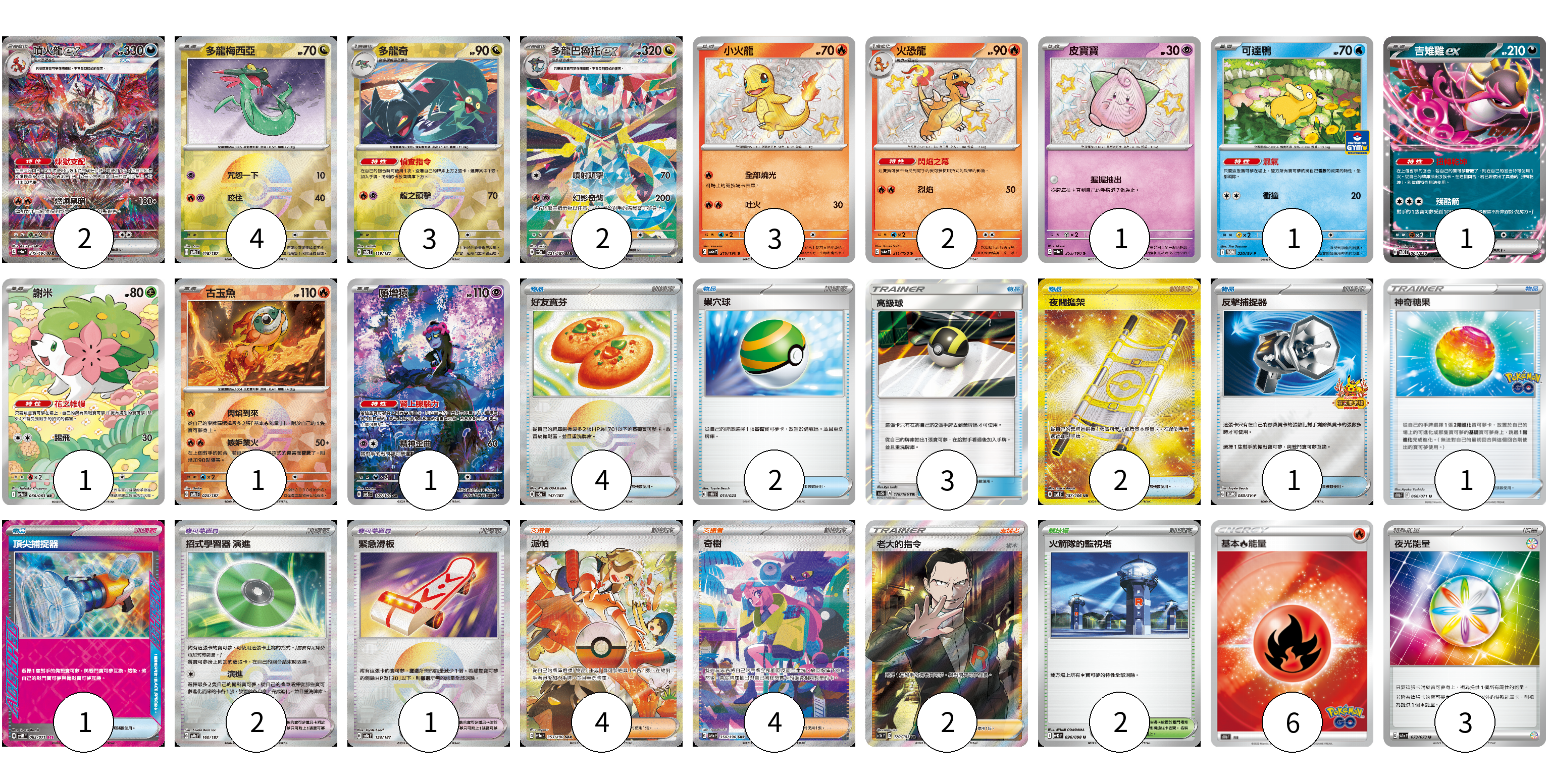 牌組構築方案 以此牌組為基礎新構築牌組 顯示卡面 顯示列表 寶可夢卡(22) 2 4 3 2 3 2 1 1 1 1 1 1 寶可夢道具(3) 2 1 物品卡(14) 4 2 3 2 1 1 1 支援者卡(10) 4 4 2 競技場卡(2) 2 能量卡(9) 6 3 寶可夢卡(22) 卡牌名稱 張數 卡牌名稱 張數 噴火龍ex SV4a 349/190 02 多龍梅西亞 SV8a 118/187 04 多龍奇 SV8a 119/187 03 多龍巴魯托ex SV8a 221/187 02 小火龍 SV4a 210/190 03 火恐龍 SV4a 211/190 02 皮寶寶 SV4a 255/190 01 可達鴨 SV-P 220/SV-P 01 吉雉雞ex SVOD 004/020 01 謝米 SV9a 066/063 01 古玉魚 SV8a 025/187 01 願增猿 SV6 107/101 01 寶可夢道具(3) 卡牌名稱 張數 卡牌名稱 張數 招式學習器 演進 SV8a 160/187 02 緊急滑板 SV8a 153/187 01 物品卡(14) 卡牌名稱 張數 卡牌名稱 張數 好友寶芬 SV8a 147/187 04 巢穴球 SVAW 014/023 02 高級球 AS5b 178/186 03 夜間擔架 SV8 137/106 02 反擊捕捉器 SV-P 083/SV-P 01 神奇糖果 S10b 066/071 01 頂尖捕捉器 SV5M 062/071 01 支援者卡(10) 卡牌名稱 張數 卡牌名稱 張數 派帕 SV4a 353/190 04 奇樹 SV4a 350/190 04 老大的指令(坂木) SC1b 170/153 02 競技場卡(2) 卡牌名稱 張數 卡牌名稱 張數 火箭隊的監視塔 SV10 096/098 02 能量卡(9) 卡牌名稱 張數 卡牌名稱 張數 基本火能量 S10b FIR 06 夜光能量 SV1a 073/073 03 以此牌組為基礎新構築牌組 牌組編碼 gWXNMQ-oBVdws-wSScmh copy 列印牌組單 牌組編碼已複製 分享至SNS