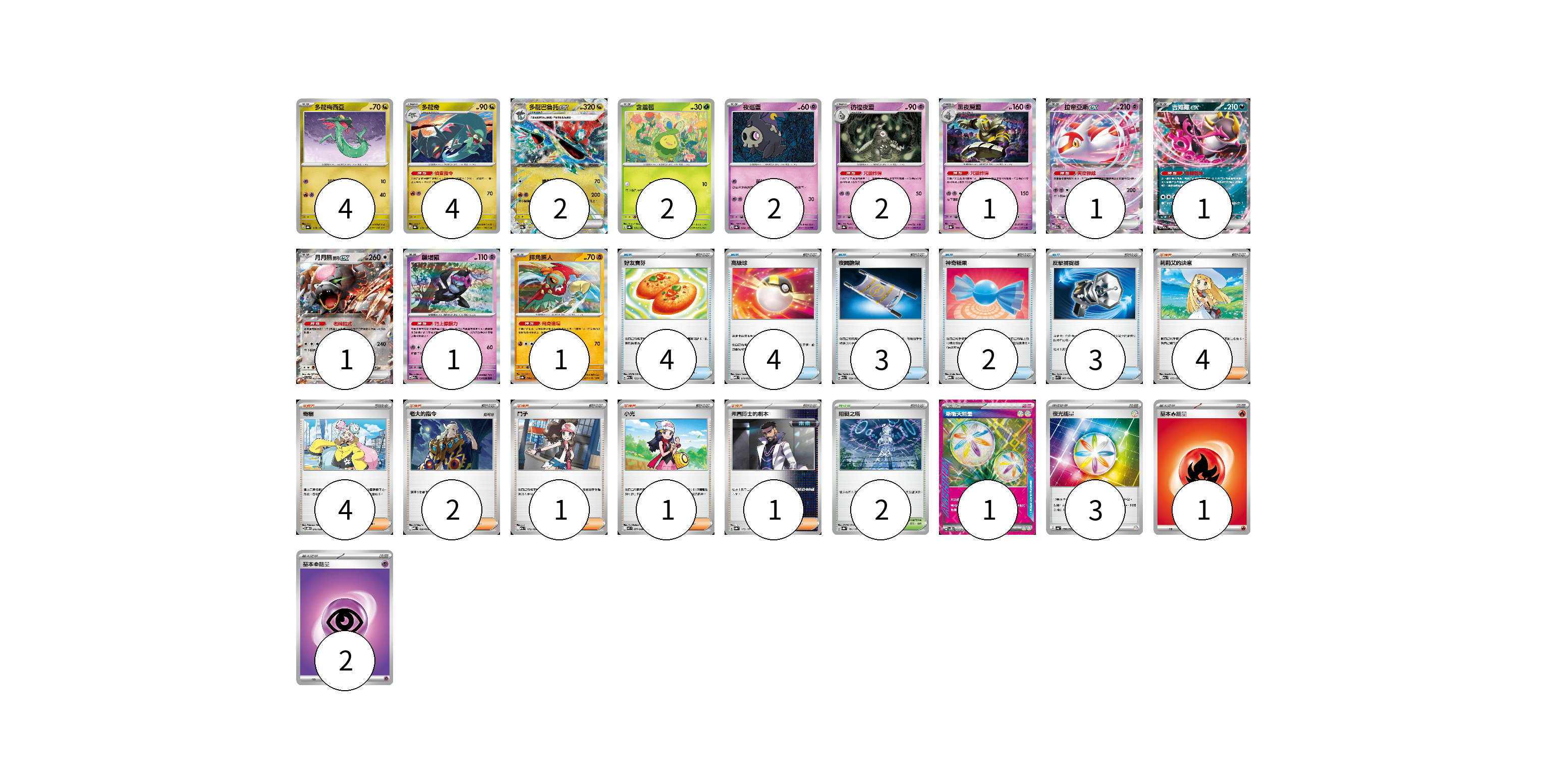 牌組構築方案 以此牌組為基礎新構築牌組 顯示卡面 顯示列表 寶可夢卡(22) 4 4 2 2 2 2 1 1 1 1 1 1 物品卡(16) 4 4 3 2 3 支援者卡(13) 4 4 2 1 1 1 競技場卡(2) 2 能量卡(7) 1 3 1 2 寶可夢卡(22) 卡牌名稱 張數 卡牌名稱 張數 多龍梅西亞 SV8a 118/187 04 多龍奇 SV8a 119/187 04 多龍巴魯托ex SV8a 120/187 02 含羞苞 SV8a 001/187 02 夜巡靈 SV8a 064/187 02 彷徨夜靈 SV8a 065/187 02 黑夜魔靈 SV8a 066/187 01 拉帝亞斯ex M2a 075/193 01 吉雉雞ex M2a 114/193 01 月月熊 赫月 ex SV5a 052/066 01 願增猿 M2a 081/193 01 摔角鷹人 SV8a 084/187 01 物品卡(16) 卡牌名稱 張數 卡牌名稱 張數 好友寶芬 M2a 153/193 04 高級球 MBD 014/022 04 夜間擔架 M2a 159/193 03 神奇糖果 MBG 013/022 02 反擊捕捉器 SVK 009/042 03 支援者卡(13) 卡牌名稱 張數 卡牌名稱 張數 莉莉艾的決意 M2a 175/193 04 奇樹 SVOD 016/020 04 老大的指令 MBD 020/022 02 鬥子 M2a 172/193 01 小光 M2 077/080 01 弗圖博士的劇本 SV8a 175/187 01 競技場卡(2) 卡牌名稱 張數 卡牌名稱 張數 阻礙之塔 SV8a 181/187 02 能量卡(7) 卡牌名稱 張數 卡牌名稱 張數 新衝天能量 SV5K 071/071 01 夜光能量 SV4a 190/190 03 基本【火】能量 SVHK FIR 01 基本【超】能量 SVHM PSY 02 以此牌組為基礎新構築牌組 牌組編碼 gXmlju-jgmlXn-Yjzebp copy 列印牌組單 牌組編碼已複製 分享至SNS