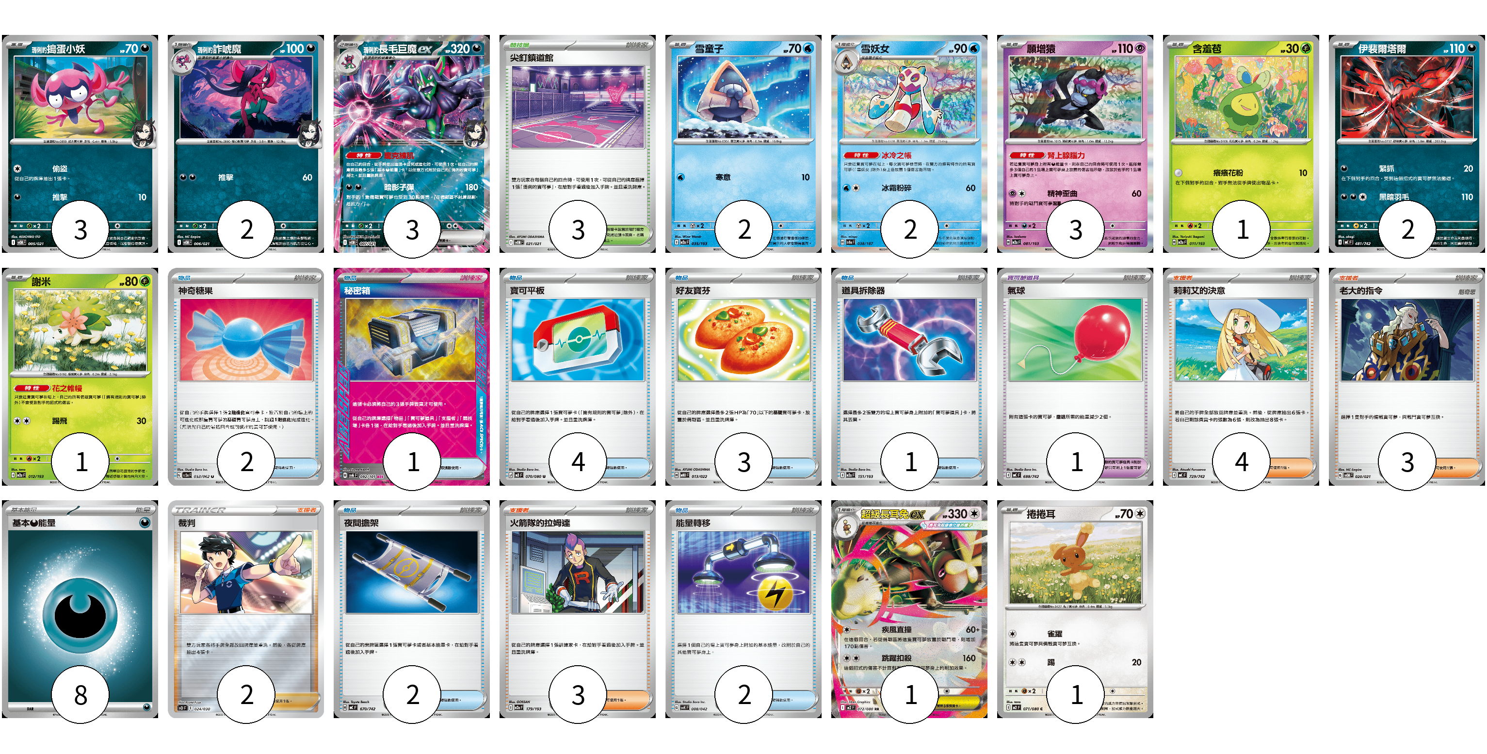 牌組構築方案 以此牌組為基礎新構築牌組 顯示卡面 顯示列表 寶可夢卡(21) 3 2 3 2 2 3 1 2 1 1 1 寶可夢道具(1) 1 物品卡(15) 2 1 4 3 1 2 2 支援者卡(12) 4 3 2 3 競技場卡(3) 3 能量卡(8) 8 寶可夢卡(21) 卡牌名稱 張數 卡牌名稱 張數 <瑪俐的>搗蛋小妖 SVOM 005/021 03 <瑪俐的>詐唬魔 SVOM 006/021 02 <瑪俐的>長毛巨魔ex SVOM 007/021 03 雪童子 M2a 035/193 02 雪妖女 SV8a 038/187 02 願增猿 M2a 081/193 03 含羞苞 M2a 011/193 01 伊裴爾塔爾 MC 481/742 02 謝米 M2a 012/193 01 超級長耳兔ex M2 072/080 01 捲捲耳 M2 071/080 01 寶可夢道具(1) 卡牌名稱 張數 卡牌名稱 張數 氣球 MC 688/742 01 物品卡(15) 卡牌名稱 張數 卡牌名稱 張數 神奇糖果 SV3a 053/062 02 秘密箱 SV6 092/101 01 寶可平板 M3 070/080 04 好友寶芬 MBD 013/022 03 道具拆除器 M2a 151/193 01 夜間擔架 MC 670/742 02 能量轉移 SVK 008/042 02 支援者卡(12) 卡牌名稱 張數 卡牌名稱 張數 莉莉艾的決意 MC 729/742 04 老大的指令 SVOM 020/021 03 裁判 SO 024/030 02 火箭隊的拉姆達 M2a 179/193 03 競技場卡(3) 卡牌名稱 張數 卡牌名稱 張數 尖釘鎮道館 SVOM 021/021 03 能量卡(8) 卡牌名稱 張數 卡牌名稱 張數 基本【惡】能量 MC DAR 08 以此牌組為基礎新構築牌組 牌組編碼 gYHnWx-pbbDgH-pZVMVe copy 列印牌組單 牌組編碼已複製 分享至SNS