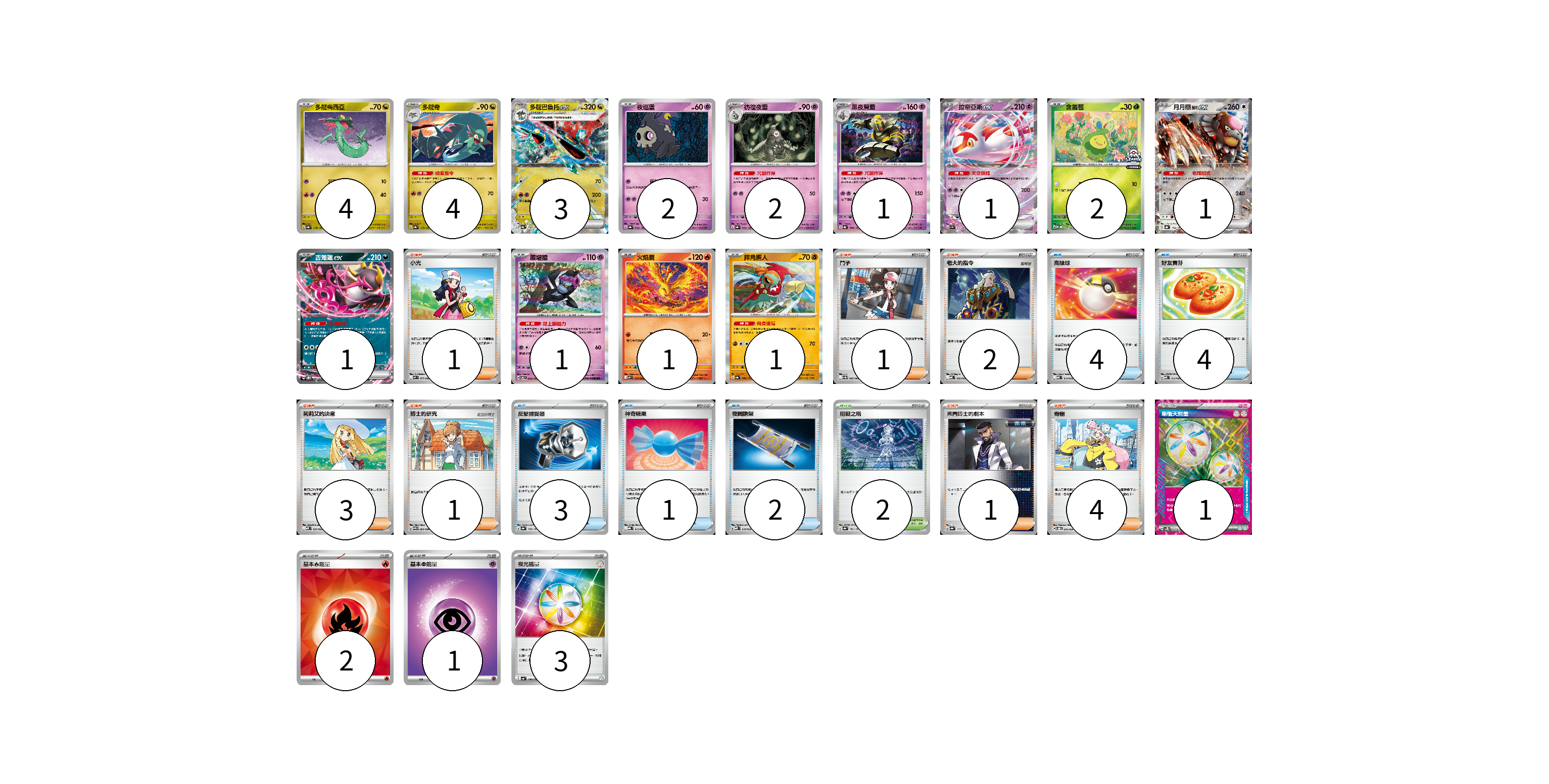 牌組構築方案 以此牌組為基礎新構築牌組 顯示卡面 顯示列表 寶可夢卡(24) 4 4 3 2 2 1 1 2 1 1 1 1 1 物品卡(14) 4 4 3 1 2 支援者卡(13) 1 1 2 3 1 1 4 競技場卡(2) 2 能量卡(7) 1 2 1 3 寶可夢卡(24) 卡牌名稱 張數 卡牌名稱 張數 多龍梅西亞 SV8a 118/187 04 多龍奇 SV8a 119/187 04 多龍巴魯托ex SV8a 120/187 03 夜巡靈 SV8a 064/187 02 彷徨夜靈 SV8a 065/187 02 黑夜魔靈 SV8a 066/187 01 拉帝亞斯ex SV7a 019/064 01 含羞苞 M-P 037/M-P 02 月月熊 赫月ex SV8a 134/187 01 吉雉雞ex SVOD 004/020 01 願增猿 SV6 055/101 01 火焰鳥 M2 014/080 01 摔角鷹人 SV8a 084/187 01 物品卡(14) 卡牌名稱 張數 卡牌名稱 張數 高級球 MBD 014/022 04 好友寶芬 MBD 013/022 04 反擊捕捉器 SV8a 139/187 03 神奇糖果 MBG 013/022 01 夜間擔架 MBD 016/022 02 支援者卡(13) 卡牌名稱 張數 卡牌名稱 張數 小光 M2 077/080 01 鬥子 SV11W 085/086 01 老大的指令 MBD 020/022 02 莉莉艾的決意 MBD 021/022 03 博士的研究 SV11B 084/086 01 弗圖博士的劇本 SV8a 175/187 01 奇樹 SVOD 016/020 04 競技場卡(2) 卡牌名稱 張數 卡牌名稱 張數 阻礙之塔 SV8a 181/187 02 能量卡(7) 卡牌名稱 張數 卡牌名稱 張數 新衝天能量 SV5K 071/071 01 基本【火】能量 SVQL FIR 02 基本【超】能量 M-P PSY 01 夜光能量 SV4a 190/190 03 以此牌組為基礎新構築牌組 牌組編碼 gbzdmU-rSMciH-gnziKx copy 列印牌組單 牌組編碼已複製 分享至SNS