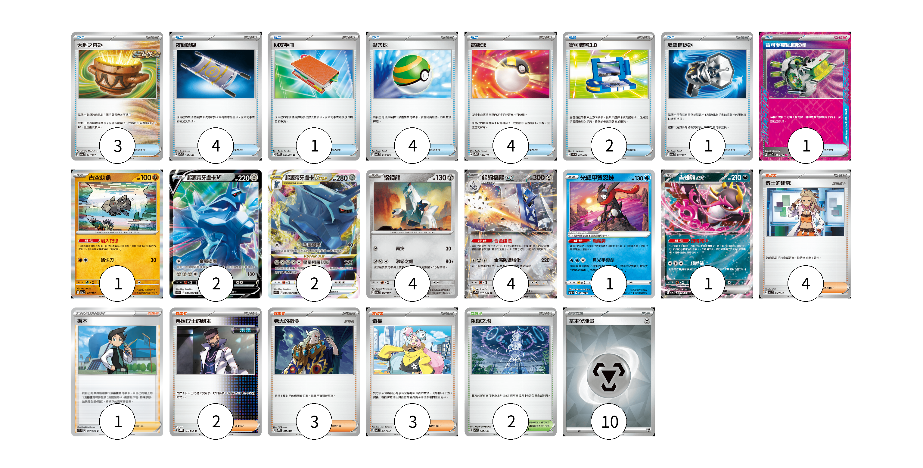 牌組構築方案 以此牌組為基礎新構築牌組 顯示卡面 顯示列表 寶可夢卡(15) 1 2 2 4 4 1 1 物品卡(20) 3 4 1 4 4 2 1 1 支援者卡(13) 4 1 2 3 3 競技場卡(2) 2 能量卡(10) 10 寶可夢卡(15) 卡牌名稱 張數 卡牌名稱 張數 古空棘魚 SV8a 079/187 01 起源帝牙盧卡V S10D 048/067 02 起源帝牙盧卡VSTAR S10D 049/067 02 鋁鋼龍 SV8a 112/187 04 鋁鋼橋龍ex SV7a 037/064 04 光輝甲賀忍蛙 SVTS 001/022 01 吉雉雞ex SV6a 038/064 01 物品卡(20) 卡牌名稱 張數 卡牌名稱 張數 大地之容器 SV8a 143/187 03 夜間擔架 SV8a 151/187 04 朋友手冊 SV1S 069/078 01 巢穴球 SVM 133/175 04 高級球 SVM 134/175 04 寶可裝置3.0 SVAL 015/021 02 反擊捕捉器 SV8a 139/187 01 寶可夢旋風回收機 SV8a 149/187 01 支援者卡(13) 卡牌名稱 張數 卡牌名稱 張數 博士的研究 SVK 032/042 04 捩木 S11 097/100 01 弗圖博士的劇本 SV4M 065/066 02 老大的指令 SVTG 019/019 03 奇樹 SVK 031/042 03 競技場卡(2) 卡牌名稱 張數 卡牌名稱 張數 阻礙之塔 SV8a 181/187 02 能量卡(10) 卡牌名稱 張數 卡牌名稱 張數 基本【鋼】能量 SVK MET 10 以此牌組為基礎新構築牌組 牌組編碼 ghIkDj-oDzmsY-nWtqpG copy 列印牌組單 牌組編碼已複製 分享至SNS