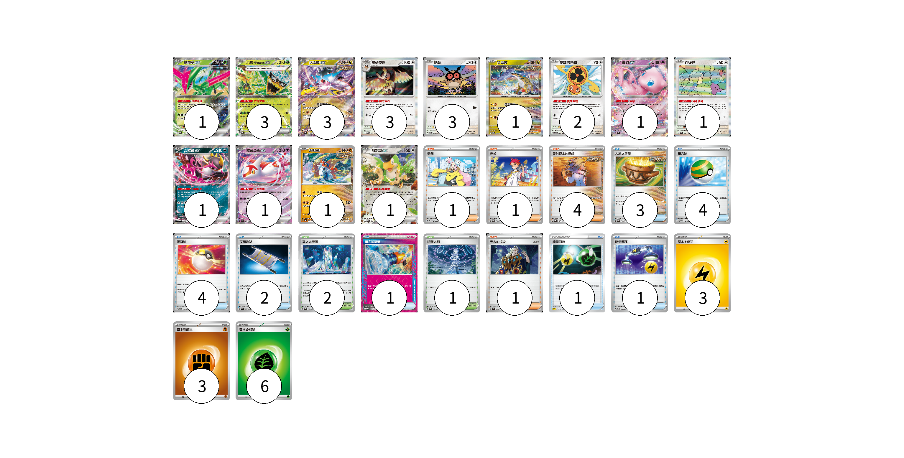 牌組構築方案 以此牌組為基礎新構築牌組 顯示卡面 顯示列表 寶可夢卡(22) 1 3 3 3 3 1 2 1 1 1 1 1 1 寶可夢道具(1) 1 物品卡(16) 3 4 4 2 1 1 1 支援者卡(6) 1 4 1 競技場卡(3) 2 1 能量卡(12) 3 3 6 寶可夢卡(22) 卡牌名稱 張數 卡牌名稱 張數 鐵斑葉ex SV8a 016/187 01 厄鬼椪 碧草面具ex SV8a 020/187 03 猛雷鼓ex SV8a 124/187 03 貓頭夜鷹 SV8a 128/187 03 咕咕 SV7 076/102 03 猛雷鼓 SV7 075/102 01 旋轉洛托姆 SV7 080/102 02 夢幻ex SV4a 076/190 01 百變怪 SV4a 144/190 01 吉雉雞ex SV6a 038/064 01 拉帝亞斯ex SV7a 019/064 01 爬地翅 SV4K 041/066 01 怒鸚哥ex SV4a 154/190 01 寶可夢道具(1) 卡牌名稱 張數 卡牌名稱 張數 奇樹 SVTL 018/021 01 物品卡(16) 卡牌名稱 張數 卡牌名稱 張數 大地之容器 SV8a 143/187 03 巢穴球 SVTS 013/022 04 高級球 SVTS 014/022 04 夜間擔架 SV6a 056/064 02 頂尖捕捉器 SV8a 148/187 01 能量回收 SDP 013/022 01 能量轉移 SVTR 010/021 01 支援者卡(6) 卡牌名稱 張數 卡牌名稱 張數 赤松 SV8a 163/187 01 奧琳博士的氣魄 SV8a 167/187 04 老大的指令 SVM 172/175 01 競技場卡(3) 卡牌名稱 張數 卡牌名稱 張數 零之大空洞 SV8a 182/187 02 阻礙之塔 SV8a 181/187 01 能量卡(12) 卡牌名稱 張數 卡牌名稱 張數 基本【雷】能量 SVHM LIG 03 基本【鬥】能量 SVF FIG 03 基本【草】能量 SVF GRA 06 以此牌組為基礎新構築牌組 牌組編碼 ghlXzE-wAXQWV-DXgtSC copy 列印牌組單 牌組編碼已複製 分享至SNS