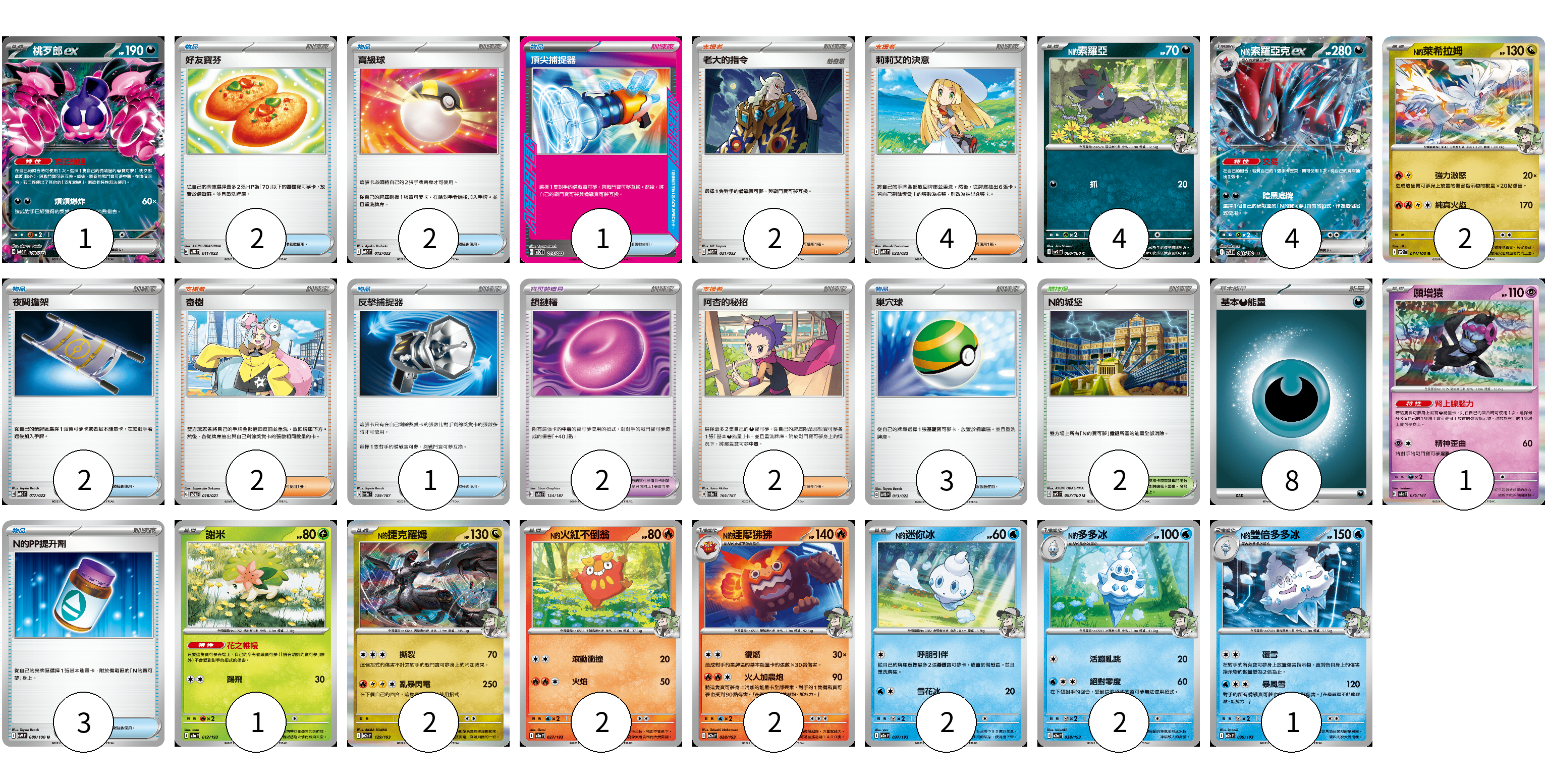牌組構築方案 以此牌組為基礎新構築牌組 顯示卡面 顯示列表 寶可夢卡(24) 1 4 4 2 1 1 2 2 2 2 2 1 寶可夢道具(2) 2 物品卡(14) 2 2 1 2 1 3 3 支援者卡(10) 2 4 2 2 競技場卡(2) 2 能量卡(8) 8 寶可夢卡(24) 卡牌名稱 張數 卡牌名稱 張數 桃歹郎ex MBG 009/022 01 N的索羅亞 SV9 060/100 04 N的索羅亞克ex SV9 061/100 04 N的萊希拉姆 SV9 074/100 02 願增猿 SV8a 075/187 01 謝米 M2a 012/193 01 N的捷克羅姆 M2a 129/193 02 N的火紅不倒翁 M2a 027/193 02 N的達摩狒狒 M2a 028/193 02 N的迷你冰 M2a 037/193 02 N的多多冰 M2a 038/193 02 N的雙倍多多冰 M2a 039/193 01 寶可夢道具(2) 卡牌名稱 張數 卡牌名稱 張數 鎖鏈糬 SV8a 154/187 02 物品卡(14) 卡牌名稱 張數 卡牌名稱 張數 好友寶芬 MBG 011/022 02 高級球 MBG 012/022 02 頂尖捕捉器 MBG 014/022 01 夜間擔架 MBG 017/022 02 反擊捕捉器 SV8a 139/187 01 巢穴球 SVTS 013/022 03 N的PP提升劑 SV9 089/100 03 支援者卡(10) 卡牌名稱 張數 卡牌名稱 張數 老大的指令 MBG 021/022 02 莉莉艾的決意 MBG 022/022 04 奇樹 SVOM 018/021 02 阿杏的秘招 SV8a 166/187 02 競技場卡(2) 卡牌名稱 張數 卡牌名稱 張數 N的城堡 SV9 097/100 02 能量卡(8) 卡牌名稱 張數 卡牌名稱 張數 基本【惡】能量 MBG DAR 08 以此牌組為基礎新構築牌組 牌組編碼 gjZZoM-uOPdva-MemTQa copy 列印牌組單 牌組編碼已複製 分享至SNS