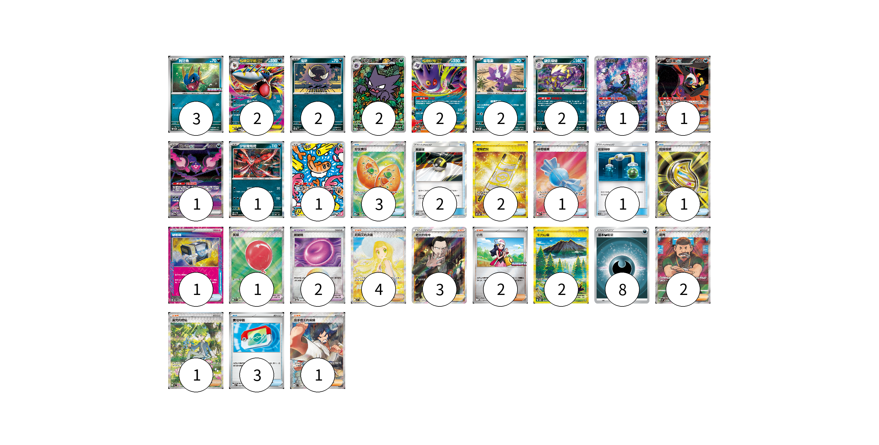 牌組構築方案 以此牌組為基礎新構築牌組 顯示卡面 顯示列表 寶可夢卡(20) 3 2 2 2 2 2 2 1 1 1 1 1 寶可夢道具(3) 1 2 物品卡(14) 3 2 2 1 1 1 1 3 支援者卡(13) 4 3 2 2 1 1 競技場卡(2) 2 能量卡(8) 8 寶可夢卡(20) 卡牌名稱 張數 卡牌名稱 張數 利牙魚 M-P 026/M-P 03 超級巨牙鯊ex M2 051/080 02 鬼斯 MBG 001/022 02 鬼斯通 MBG 023/022 02 超級耿鬼ex MBG 003/022 02 毒電嬰 M-P 027/M-P 02 顫弦蠑螈 M-P 031/M-P 02 願增猿 SV6 107/101 01 吉雉雞ex SV6a 089/064 01 桃歹郎ex SV6a 090/064 01 伊裴爾塔爾 M1L 040/063 01 米立龍 SV6 112/101 01 寶可夢道具(3) 卡牌名稱 張數 卡牌名稱 張數 氣球 M1L 084/063 01 鎖鏈糬 SV8a 154/187 02 物品卡(14) 卡牌名稱 張數 卡牌名稱 張數 好友寶芬 M1S 081/063 03 高級球 AS5b 178/186 02 夜間擔架 SV8 137/106 02 神奇糖果 M1S 082/063 01 能量轉移 AC1D 132/157 01 超級信號 M1S 083/063 01 秘密箱 SV6 092/101 01 寶可平板 MC 662/742 03 支援者卡(13) 卡牌名稱 張數 卡牌名稱 張數 莉莉艾的決意 M1L 091/063 04 老大的指令(坂木) SC1b 170/153 03 小光 M-P 028/M-P 02 裁判 SV4a 342/190 02 滿充的體貼 M1S 091/063 01 空手道王的演練 M2a 220/193 01 競技場卡(2) 卡牌名稱 張數 卡牌名稱 張數 引力山岳 SV8 138/106 02 能量卡(8) 卡牌名稱 張數 卡牌名稱 張數 基本惡能量 SLD DAR 08 以此牌組為基礎新構築牌組 牌組編碼 gnJPTI-XbhbeA-sUmivZ copy 列印牌組單 牌組編碼已複製 分享至SNS