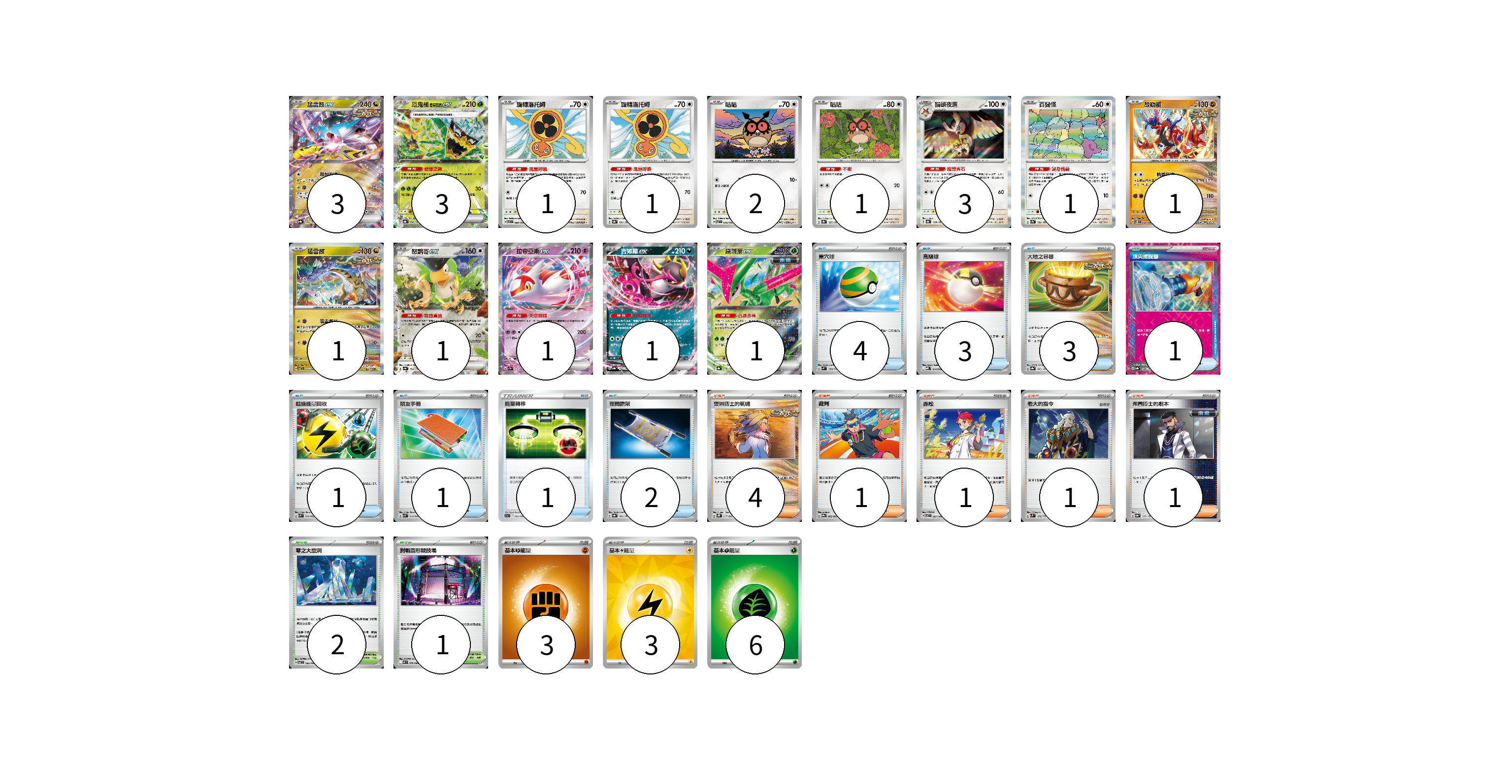牌組構築方案 以此牌組為基礎新構築牌組 顯示卡面 顯示列表 寶可夢卡(21) 3 3 1 1 2 1 3 1 1 1 1 1 1 1 物品卡(16) 4 3 3 1 1 1 1 2 支援者卡(8) 4 1 1 1 1 競技場卡(3) 2 1 能量卡(12) 3 3 6 寶可夢卡(21) 卡牌名稱 張數 卡牌名稱 張數 猛雷鼓ex SV8a 124/187 03 厄鬼椪 碧草面具ex SV8a 020/187 03 旋轉洛托姆 SV7 080/102 01 旋轉洛托姆 SV8a 131/187 01 咕咕 SV7 076/102 02 咕咕 SV8a 127/187 01 貓頭夜鷹 SV8a 128/187 03 百變怪 SV2a 132/165 01 故勒頓 SV8 069/106 01 猛雷鼓 SV7 075/102 01 怒鸚哥ex SV4a 154/190 01 拉帝亞斯ex SV7a 019/064 01 吉雉雞ex SV8a 104/187 01 鐵斑葉ex SV8a 016/187 01 物品卡(16) 卡牌名稱 張數 卡牌名稱 張數 巢穴球 SVM 133/175 04 高級球 MBD 014/022 03 大地之容器 SV8a 143/187 03 頂尖捕捉器 SV8a 148/187 01 超級能量回收 SVK 010/042 01 朋友手冊 SVK 014/042 01 能量轉移 S11a 059/068 01 夜間擔架 SV8a 151/187 02 支援者卡(8) 卡牌名稱 張數 卡牌名稱 張數 奧琳博士的氣魄 SVHK 017/022 04 裁判 SV9a 062/063 01 赤松 SV7 097/102 01 老大的指令 SVM 172/175 01 弗圖博士的劇本 SV8a 175/187 01 競技場卡(3) 卡牌名稱 張數 卡牌名稱 張數 零之大空洞 SV7 102/102 02 對戰圓形競技場 M2 079/080 01 能量卡(12) 卡牌名稱 張數 卡牌名稱 張數 基本【鬥】能量 M-P FIG 03 基本【雷】能量 SVQP LIG 03 基本【草】能量 M-P GRA 06 以此牌組為基礎新構築牌組 牌組編碼 goBECg-FVWcgj-kkKKkv copy 列印牌組單 牌組編碼已複製 分享至SNS