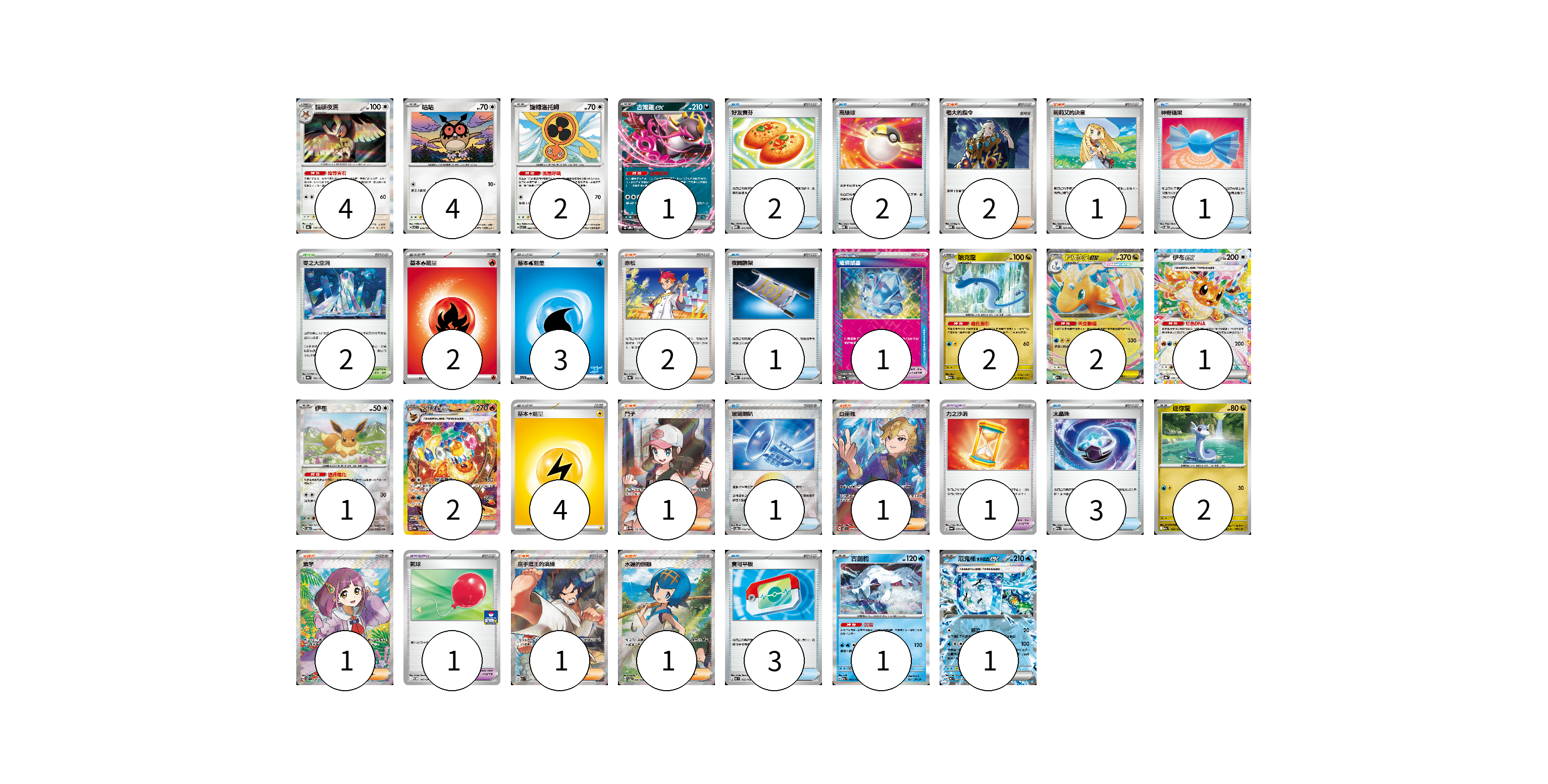 牌組構築方案 以此牌組為基礎新構築牌組 顯示卡面 顯示列表 寶可夢卡(23) 4 4 2 1 2 2 1 1 2 2 1 1 寶可夢道具(3) 1 1 1 物品卡(13) 2 2 1 1 1 3 3 支援者卡(10) 2 1 2 1 1 1 1 1 競技場卡(2) 2 能量卡(9) 2 3 4 寶可夢卡(23) 卡牌名稱 張數 卡牌名稱 張數 貓頭夜鷹 SV8a 128/187 04 咕咕 SV7 076/102 04 旋轉洛托姆 SV7 080/102 02 吉雉雞ex SVOD 004/020 01 哈克龍 M2a 125/193 02 超級快龍ex M2a 126/193 02 伊布ex SV8a 126/187 01 伊布 SV8a 125/187 01 火伊布ex SV8a 202/187 02 迷你龍 M2a 124/193 02 古劍豹 M2a 043/193 01 厄鬼椪 水井面具ex MC 224/742 01 寶可夢道具(3) 卡牌名稱 張數 卡牌名稱 張數 璀璨結晶 SV8a 152/187 01 力之沙漏 SV6a 058/064 01 氣球 M-P 047/M-P 01 物品卡(13) 卡牌名稱 張數 卡牌名稱 張數 好友寶芬 MBD 013/022 02 高級球 MBD 014/022 02 神奇糖果 SVOD 013/020 01 夜間擔架 MBD 016/022 01 玻璃喇叭 SV8a 140/187 01 太晶珠 M2a 152/193 03 寶可平板 MC 662/742 03 支援者卡(10) 卡牌名稱 張數 卡牌名稱 張數 老大的指令 MBD 020/022 02 莉莉艾的決意 MBD 021/022 01 赤松 SV8a 163/187 02 鬥子 SV11W 166/086 01 白蕾雅 SV7 126/102 01 紫竽 SV7 124/102 01 空手道王的演練 M2a 220/193 01 水蓮的照顧 SV5a 088/066 01 競技場卡(2) 卡牌名稱 張數 卡牌名稱 張數 零之大空洞 SV8a 182/187 02 能量卡(9) 卡牌名稱 張數 卡牌名稱 張數 基本【火】能量 M-P FIR 02 基本【水】能量 SVI WAT 03 基本【雷】能量 SVTR LIG 04 以此牌組為基礎新構築牌組 牌組編碼 grZukj-bNsheK-IBuIlg copy 列印牌組單 牌組編碼已複製 分享至SNS