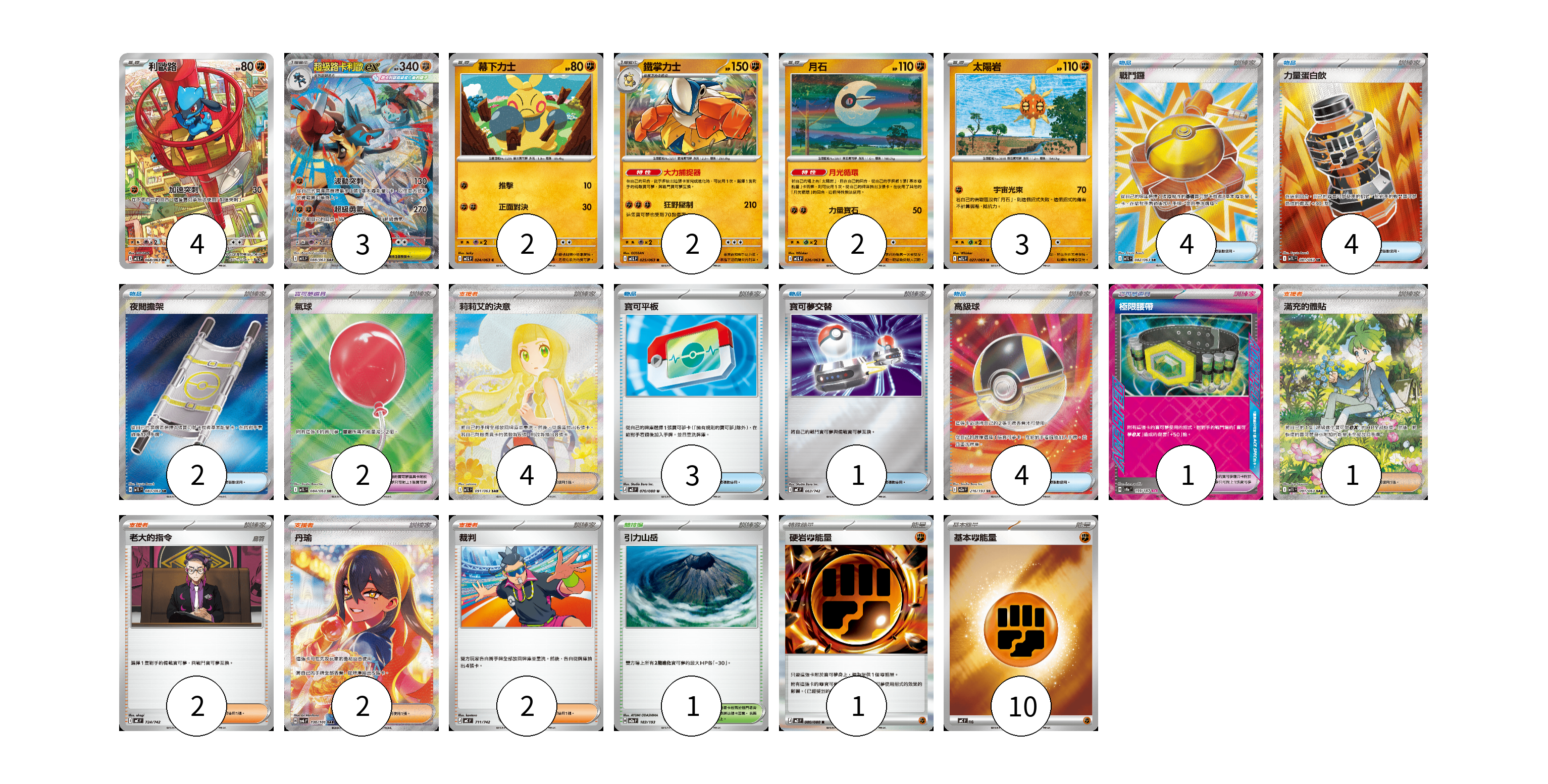 牌組構築方案 以此牌組為基礎新構築牌組 顯示卡面 顯示列表 寶可夢卡(16) 4 3 2 2 2 3 寶可夢道具(3) 2 1 物品卡(18) 4 4 2 3 1 4 支援者卡(11) 4 1 2 2 2 競技場卡(1) 1 能量卡(11) 1 10 寶可夢卡(16) 卡牌名稱 張數 卡牌名稱 張數 利歐路 M1L 068/063 04 超級路卡利歐ex M1L 088/063 03 幕下力士 M1L 024/063 02 鐵掌力士 M1L 025/063 02 月石 M1L 026/063 02 太陽岩 M1L 027/063 03 寶可夢道具(3) 卡牌名稱 張數 卡牌名稱 張數 氣球 M1L 084/063 02 極限腰帶 SV8a 159/187 01 物品卡(18) 卡牌名稱 張數 卡牌名稱 張數 戰鬥鑼 M1L 082/063 04 力量蛋白飲 M1L 081/063 04 夜間擔架 M1L 083/063 02 寶可平板 M3 070/080 03 寶可夢交替 MC 663/742 01 高級球 M2a 216/193 04 支援者卡(11) 卡牌名稱 張數 卡牌名稱 張數 莉莉艾的決意 M1L 091/063 04 滿充的體貼 M1S 091/063 01 老大的指令 MC 724/742 02 丹瑜 SV6 130/101 02 裁判 MC 711/742 02 競技場卡(1) 卡牌名稱 張數 卡牌名稱 張數 引力山岳 M2a 183/193 01 能量卡(11) 卡牌名稱 張數 卡牌名稱 張數 硬岩【鬥】能量 M3 080/080 01 基本【鬥】能量 MC FIG 10 以此牌組為基礎新構築牌組 牌組編碼 gsBhky-Ktftpl-ZvlIes copy 列印牌組單 牌組編碼已複製 分享至SNS