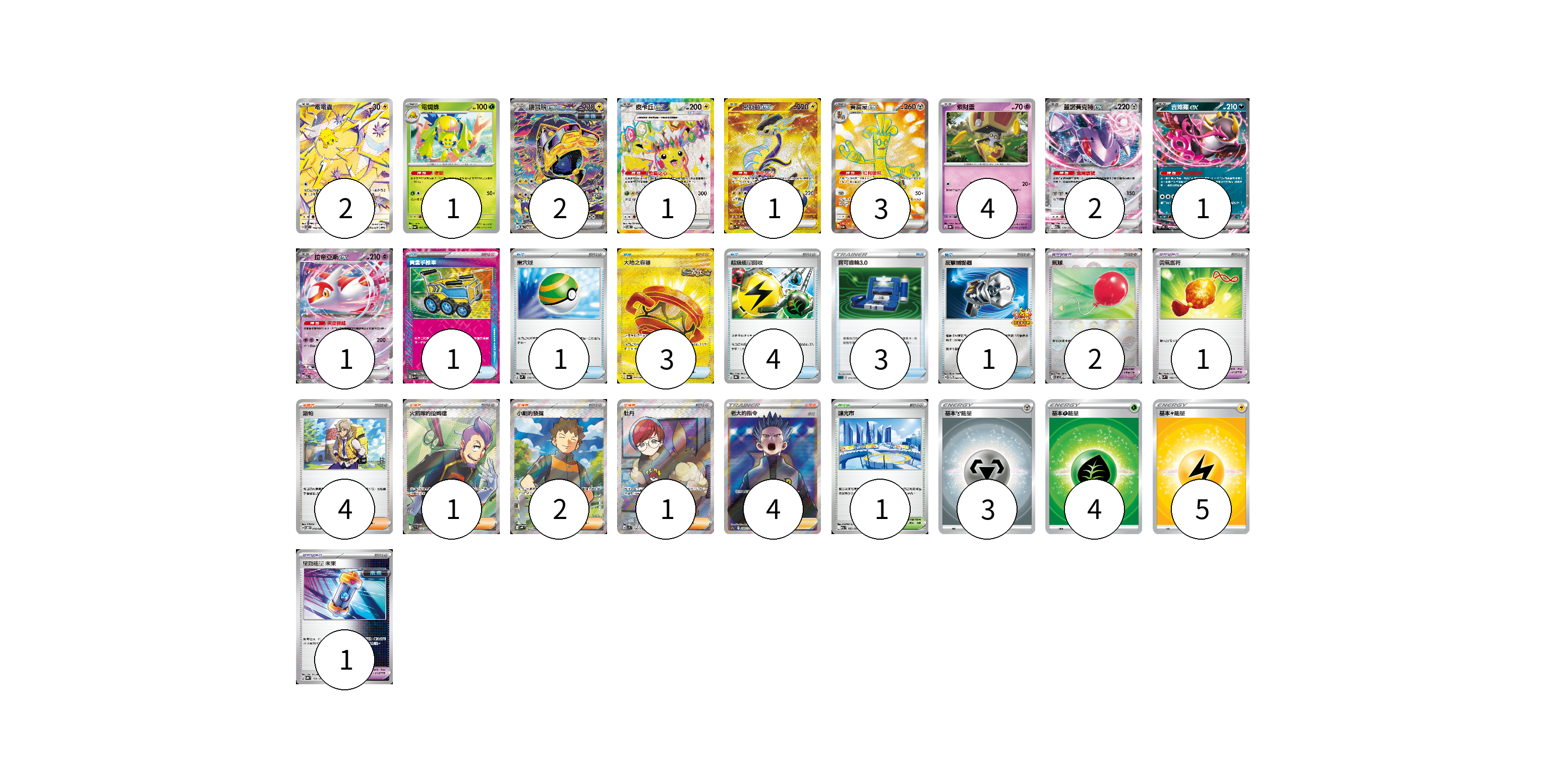 牌組構築方案 以此牌組為基礎新構築牌組 顯示卡面 顯示列表 寶可夢卡(18) 2 1 2 1 1 3 4 2 1 1 寶可夢道具(4) 2 1 1 物品卡(13) 1 1 3 4 3 1 支援者卡(12) 4 1 2 1 4 競技場卡(1) 1 能量卡(12) 3 4 5 寶可夢卡(18) 卡牌名稱 張數 卡牌名稱 張數 電電蟲 SV7 108/102 02 電蜘蛛 SV6a 002/064 01 鐵臂膀ex SV8a 210/187 02 皮卡丘ex SV8 122/106 01 密勒頓ex SV1V 106/078 01 賽富豪ex SV3a 079/062 03 索財靈 SV8a 073/187 04 蓋諾賽克特ex M2a 119/193 02 吉雉雞ex MC 489/742 01 拉帝亞斯ex M2a 075/193 01 寶可夢道具(4) 卡牌名稱 張數 卡牌名稱 張數 氣球 SV11B 082/086 02 勇氣護符 SVM 142/175 01 驅勁能量 未來 SV8a 158/187 01 物品卡(13) 卡牌名稱 張數 卡牌名稱 張數 貴重手推車 SVK 020/042 01 巢穴球 SVM 133/175 01 大地之容器 SV6a 093/064 03 超級能量回收 SV8a 141/187 04 寶可齒輪3.0 SLD 014/020 03 反擊捕捉器 SV-P 083/SV-P 01 支援者卡(12) 卡牌名稱 張數 卡牌名稱 張數 派帕 SVOD 018/020 04 火箭隊的拉姆達 SV10 122/098 01 小剛的發掘 SV9 123/100 02 牡丹 SV1S 100/078 01 老大的指令(赤日) S12a 250/172 04 競技場卡(1) 卡牌名稱 張數 卡牌名稱 張數 釀光市 M2a 185/193 01 能量卡(12) 卡牌名稱 張數 卡牌名稱 張數 基本【鋼】能量 SI MET 03 基本【草】能量 SI GRA 04 基本【雷】能量 SI LIG 05 以此牌組為基礎新構築牌組 牌組編碼 gvvkuk-dkixOW-Fynxza copy 列印牌組單 牌組編碼已複製 分享至SNS
