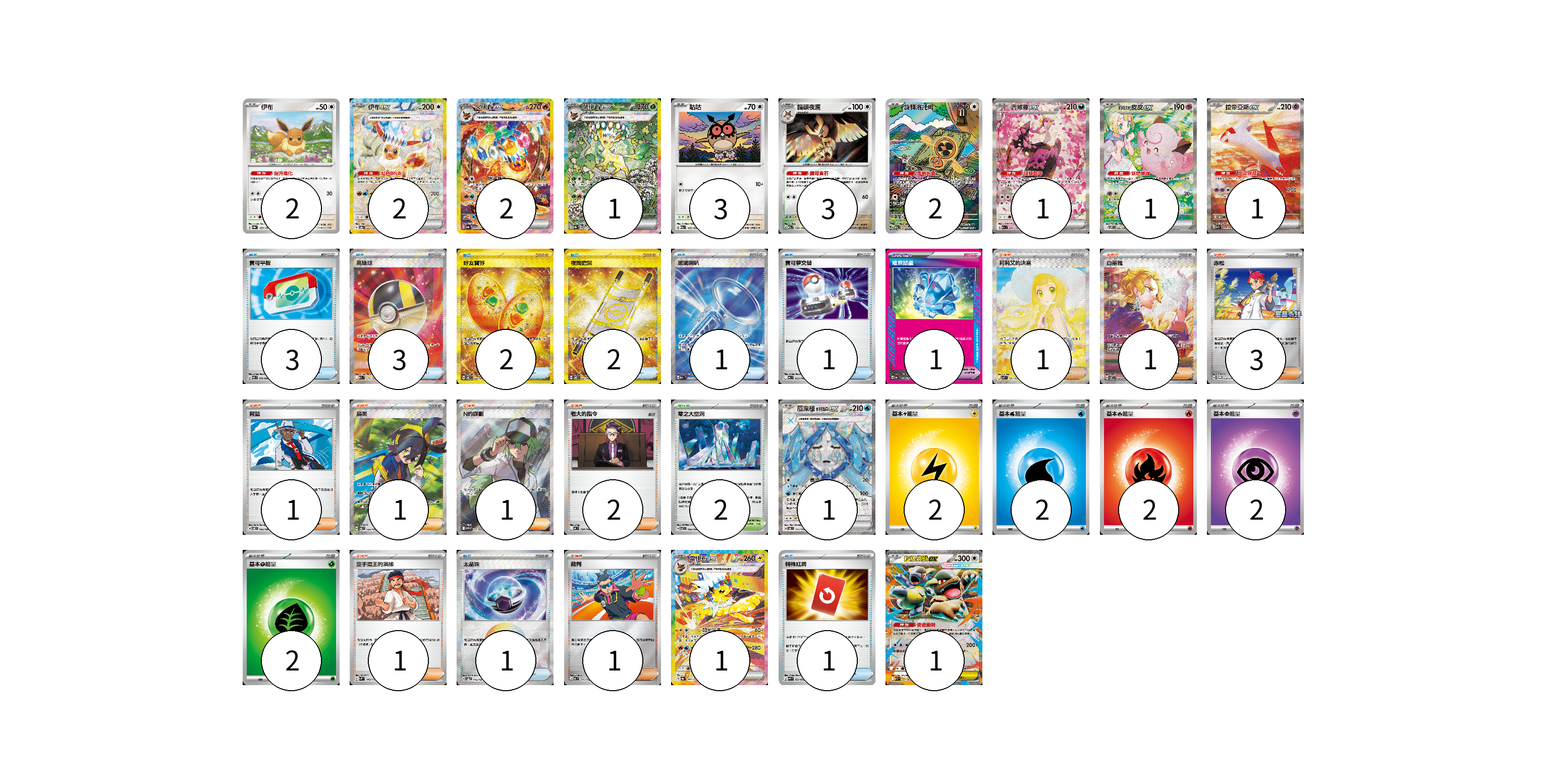 牌組構築方案 以此牌組為基礎新構築牌組 顯示卡面 顯示列表 寶可夢卡(21) 2 2 2 1 3 3 2 1 1 1 1 1 1 寶可夢道具(1) 1 物品卡(14) 3 3 2 2 1 1 1 1 支援者卡(12) 1 1 3 1 1 1 2 1 1 競技場卡(2) 2 能量卡(10) 2 2 2 2 2 寶可夢卡(21) 卡牌名稱 張數 卡牌名稱 張數 伊布 SV8a 125/187 02 伊布ex SV8a 223/187 02 火伊布ex SV8a 202/187 02 葉伊布ex SV8a 200/187 01 咕咕 M2a 137/193 03 貓頭夜鷹 M2a 138/193 03 旋轉洛托姆 M2a 213/193 02 吉雉雞ex M2a 244/193 01 莉莉艾的皮皮ex SV9 126/100 01 拉帝亞斯ex SV7a 087/064 01 厄鬼椪 水井面具ex SV6 117/101 01 雷伊布ex SV8a 209/187 01 超級袋獸ex M1S 051/063 01 寶可夢道具(1) 卡牌名稱 張數 卡牌名稱 張數 璀璨結晶 MC 680/742 01 物品卡(14) 卡牌名稱 張數 卡牌名稱 張數 寶可平板 M3 070/080 03 高級球 M2a 216/193 03 好友寶芬 SV6 133/101 02 夜間擔架 SV8 137/106 02 玻璃喇叭 M2a 215/193 01 寶可夢交替 MC 663/742 01 太晶珠 SV8a 145/187 01 特殊紅牌 M4 072/083 01 支援者卡(12) 卡牌名稱 張數 卡牌名稱 張數 莉莉艾的決意 M1L 091/063 01 白蕾雅 SV7 132/102 01 赤松 SV-P 150/SV-P 03 席藍 SV8 102/106 01 烏栗 SV6 122/101 01 N的謀劃 SV11B 165/086 01 老大的指令 MC 724/742 02 空手道王的演練 SVM 146/175 01 裁判 MC 711/742 01 競技場卡(2) 卡牌名稱 張數 卡牌名稱 張數 零之大空洞 SV7 102/102 02 能量卡(10) 卡牌名稱 張數 卡牌名稱 張數 基本【雷】能量 MC LIG 02 基本【水】能量 MC WAT 02 基本【火】能量 MC FIR 02 基本【超】能量 MC PSY 02 基本【草】能量 MC GRA 02 以此牌組為基礎新構築牌組 牌組編碼 gzmClZ-TbzBoB-NYgxrk copy 列印牌組單 牌組編碼已複製 分享至SNS