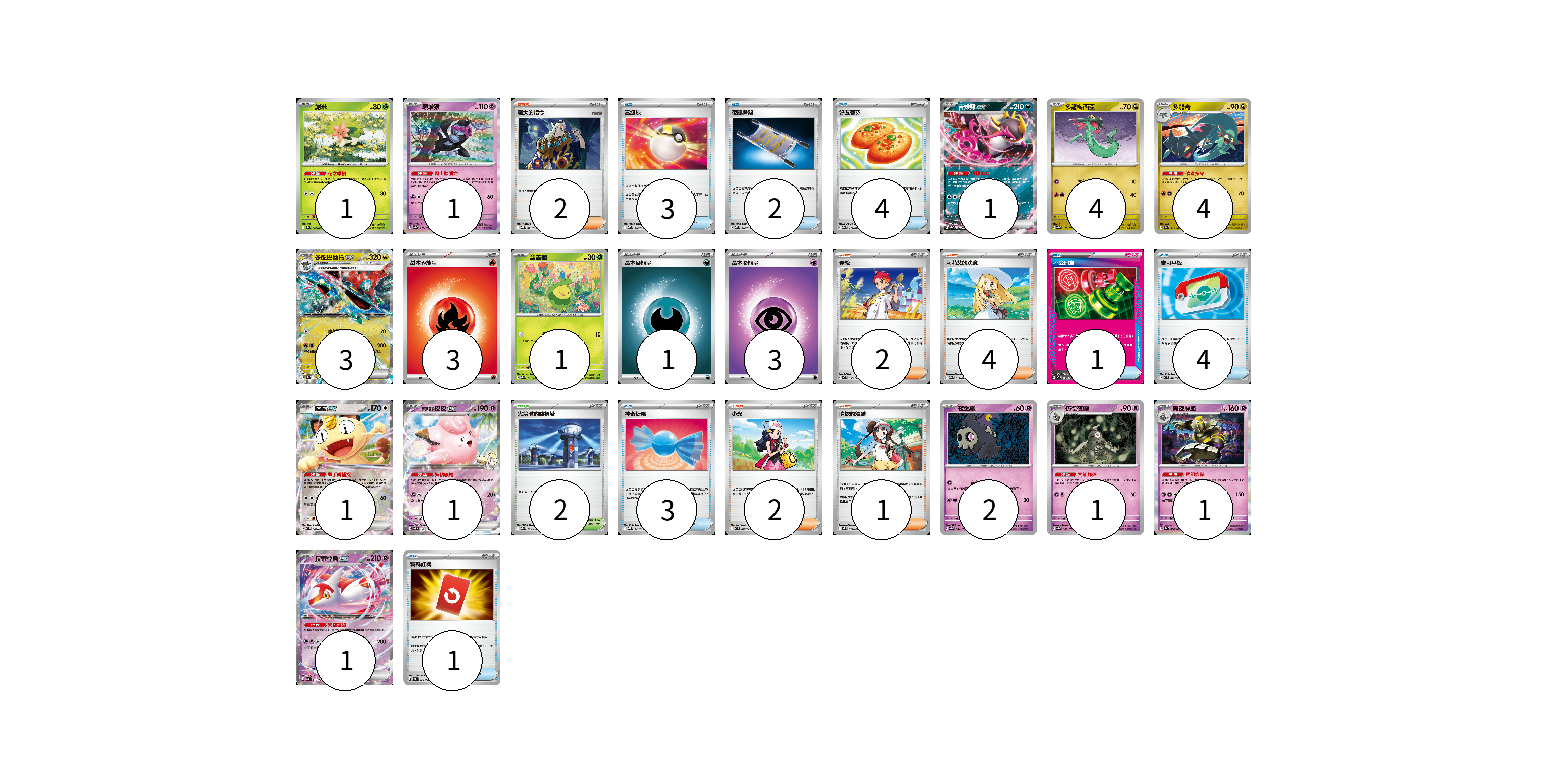 牌組構築方案 以此牌組為基礎新構築牌組 顯示卡面 顯示列表 寶可夢卡(22) 1 1 1 4 4 3 1 1 1 2 1 1 1 物品卡(18) 3 2 4 1 4 3 1 支援者卡(11) 2 2 4 2 1 競技場卡(2) 2 能量卡(7) 3 1 3 寶可夢卡(22) 卡牌名稱 張數 卡牌名稱 張數 謝米 SV9a 006/063 01 願增猿 SV8a 075/187 01 吉雉雞ex SV8a 104/187 01 多龍梅西亞 SV8a 118/187 04 多龍奇 SV8a 119/187 04 多龍巴魯托ex SV8a 120/187 03 含羞苞 M2a 011/193 01 喵喵ex M3 061/080 01 莉莉艾的皮皮ex SV9 033/100 01 夜巡靈 SV8a 064/187 02 彷徨夜靈 SV8a 065/187 01 黑夜魔靈 SV8a 066/187 01 拉帝亞斯ex SV7a 019/064 01 物品卡(18) 卡牌名稱 張數 卡牌名稱 張數 高級球 MBD 014/022 03 夜間擔架 MBD 016/022 02 好友寶芬 MBG 011/022 04 不公印章 MC 633/742 01 寶可平板 M3 070/080 04 神奇糖果 MBG 013/022 03 特殊紅牌 M4 072/083 01 支援者卡(11) 卡牌名稱 張數 卡牌名稱 張數 老大的指令 MBG 021/022 02 赤松 MC 696/742 02 莉莉艾的決意 MBG 022/022 04 小光 M2 077/080 02 鳴依的勉勵 M3 075/080 01 競技場卡(2) 卡牌名稱 張數 卡牌名稱 張數 火箭隊的監視塔 M2a 189/193 02 能量卡(7) 卡牌名稱 張數 卡牌名稱 張數 基本【火】能量 M-P FIR 03 基本【惡】能量 MC DAR 01 基本【超】能量 MC PSY 03 以此牌組為基礎新構築牌組 牌組編碼 hDjSRi-tXFZrc-RVogsi copy 列印牌組單 牌組編碼已複製 分享至SNS
