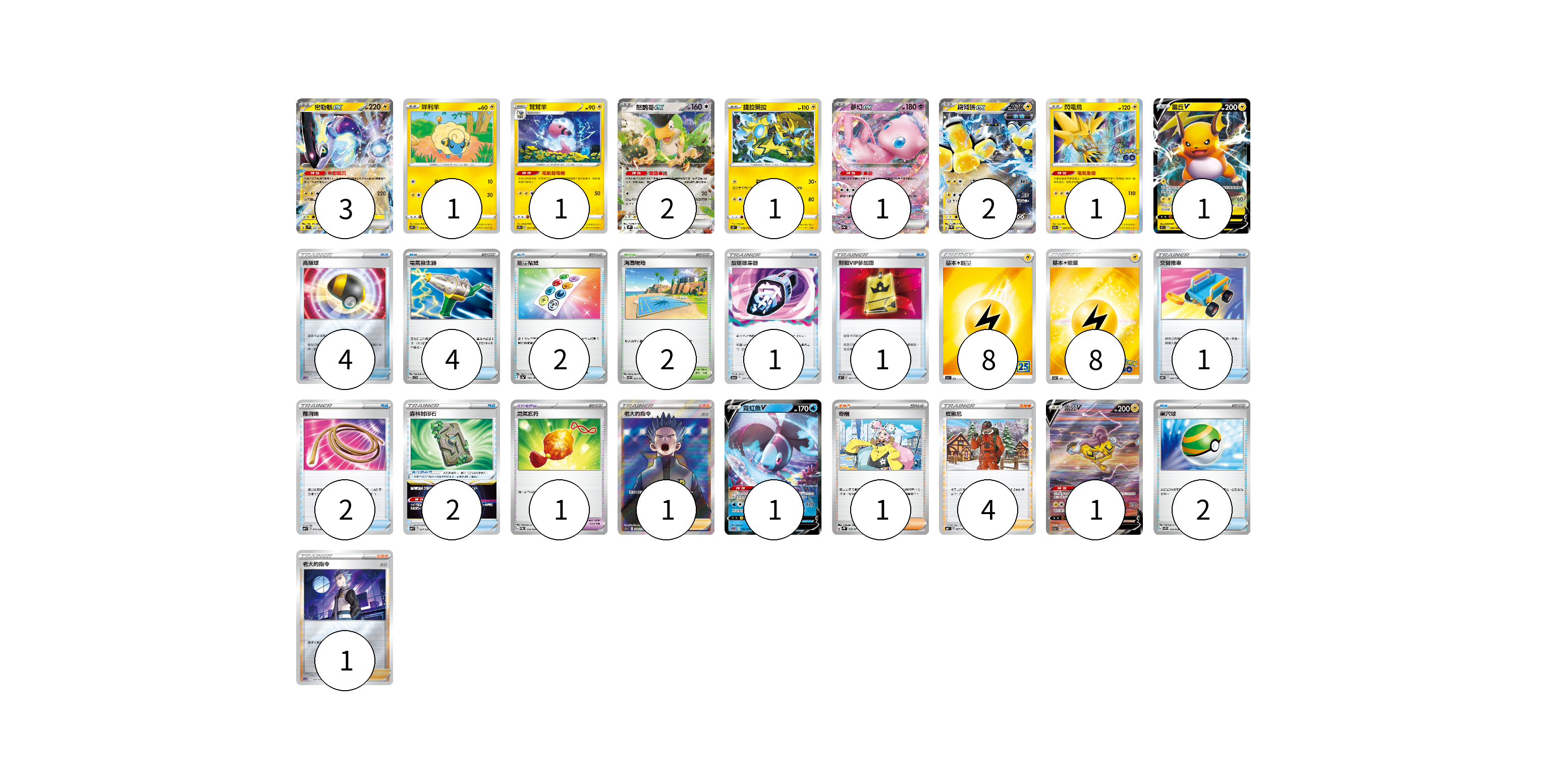 牌組構築方案 以此牌組為基礎新構築牌組 顯示卡面 顯示列表 寶可夢卡(15) 3 1 1 2 1 1 2 1 1 1 1 寶可夢道具(1) 1 物品卡(19) 4 4 2 1 1 1 2 2 2 支援者卡(7) 1 1 4 1 競技場卡(2) 2 能量卡(16) 8 8 寶可夢卡(15) 卡牌名稱 張數 卡牌名稱 張數 密勒頓ex SV1V 037/078 03 咩利羊 S7R 026/067 01 茸茸羊 S7R 027/067 01 怒鸚哥ex SV2P 065/071 02 捷拉奧拉 S12 032/098 01 夢幻ex SV2a 151/165 01 鐵臂膀ex SV4M 027/066 02 閃電鳥 S10b 029/071 01 雷丘V S9 034/100 01 霓虹魚V SPD 002/020 01 雷公V S12a 218/172 01 寶可夢道具(1) 卡牌名稱 張數 卡牌名稱 張數 勇氣護符 SVEM 016/020 01 物品卡(19) 卡牌名稱 張數 卡牌名稱 張數 高級球 SPD 010/020 04 電氣發生器 SVC 012/021 04 能量貼紙 SV2a 152/165 02 放逐吸塵器 S12a 144/172 01 對戰VIP參加證 S8 091/100 01 交替推車 S10D 060/067 01 離洞繩 SVF 010/038 02 森林封印石 SVF 024/038 02 巢穴球 SVF 016/038 02 支援者卡(7) 卡牌名稱 張數 卡牌名稱 張數 老大的指令(赤日) S12a 250/172 01 奇樹 SV2D 069/071 01 皮歐尼 S6H 067/070 04 老大的指令(赤日) SPD 020/020 01 競技場卡(2) 卡牌名稱 張數 卡牌名稱 張數 海灘場地 SVF 035/038 02 能量卡(16) 卡牌名稱 張數 卡牌名稱 張數 基本雷能量 S8a LIG 08 基本雷能量 S10b LIG 08 以此牌組為基礎新構築牌組 牌組編碼 hKeYqN-CtuAGN-jGbNIH copy 列印牌組單 牌組編碼已複製 分享至SNS