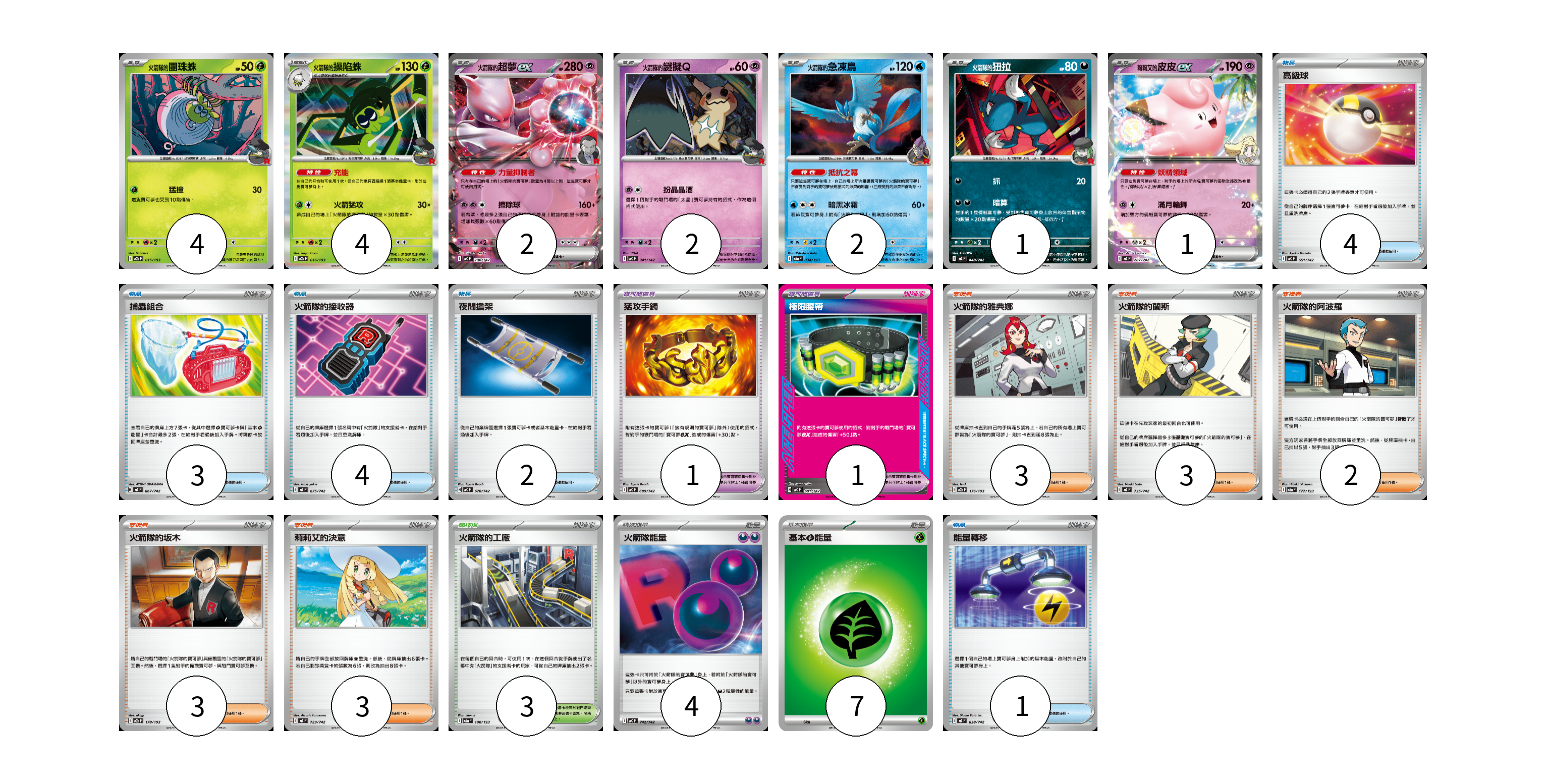 牌組構築方案 以此牌組為基礎新構築牌組 顯示卡面 顯示列表 寶可夢卡(16) 4 4 2 2 2 1 1 寶可夢道具(2) 1 1 物品卡(14) 4 3 4 2 1 支援者卡(14) 3 3 2 3 3 競技場卡(3) 3 能量卡(11) 4 7 寶可夢卡(16) 卡牌名稱 張數 卡牌名稱 張數 <火箭隊的>團珠蛛 M2a 015/193 04 <火箭隊的>操陷蛛 M2a 016/193 04 <火箭隊的>超夢ex MC 290/742 02 <火箭隊的>謎擬Q MC 341/742 02 <火箭隊的>急凍鳥 M2a 034/193 02 <火箭隊的>狃拉 MC 448/742 01 莉莉艾的皮皮ex MC 287/742 01 寶可夢道具(2) 卡牌名稱 張數 卡牌名稱 張數 猛攻手鐲 MC 689/742 01 極限腰帶 MC 691/742 01 物品卡(14) 卡牌名稱 張數 卡牌名稱 張數 高級球 MC 651/742 04 捕蟲組合 MC 667/742 03 火箭隊的接收器 MC 675/742 04 夜間擔架 MC 670/742 02 能量轉移 MC 638/742 01 支援者卡(14) 卡牌名稱 張數 卡牌名稱 張數 火箭隊的雅典娜 M2a 176/193 03 火箭隊的蘭斯 MC 735/742 03 火箭隊的阿波羅 M2a 177/193 02 火箭隊的坂木 M2a 178/193 03 莉莉艾的決意 MC 729/742 03 競技場卡(3) 卡牌名稱 張數 卡牌名稱 張數 火箭隊的工廠 M2a 190/193 03 能量卡(11) 卡牌名稱 張數 卡牌名稱 張數 火箭隊能量 MC 742/742 04 基本【草】能量 MJ GRA 07 以此牌組為基礎新構築牌組 牌組編碼 hLWzrC-rDCDmj-zNwTrd copy 列印牌組單 牌組編碼已複製 分享至SNS