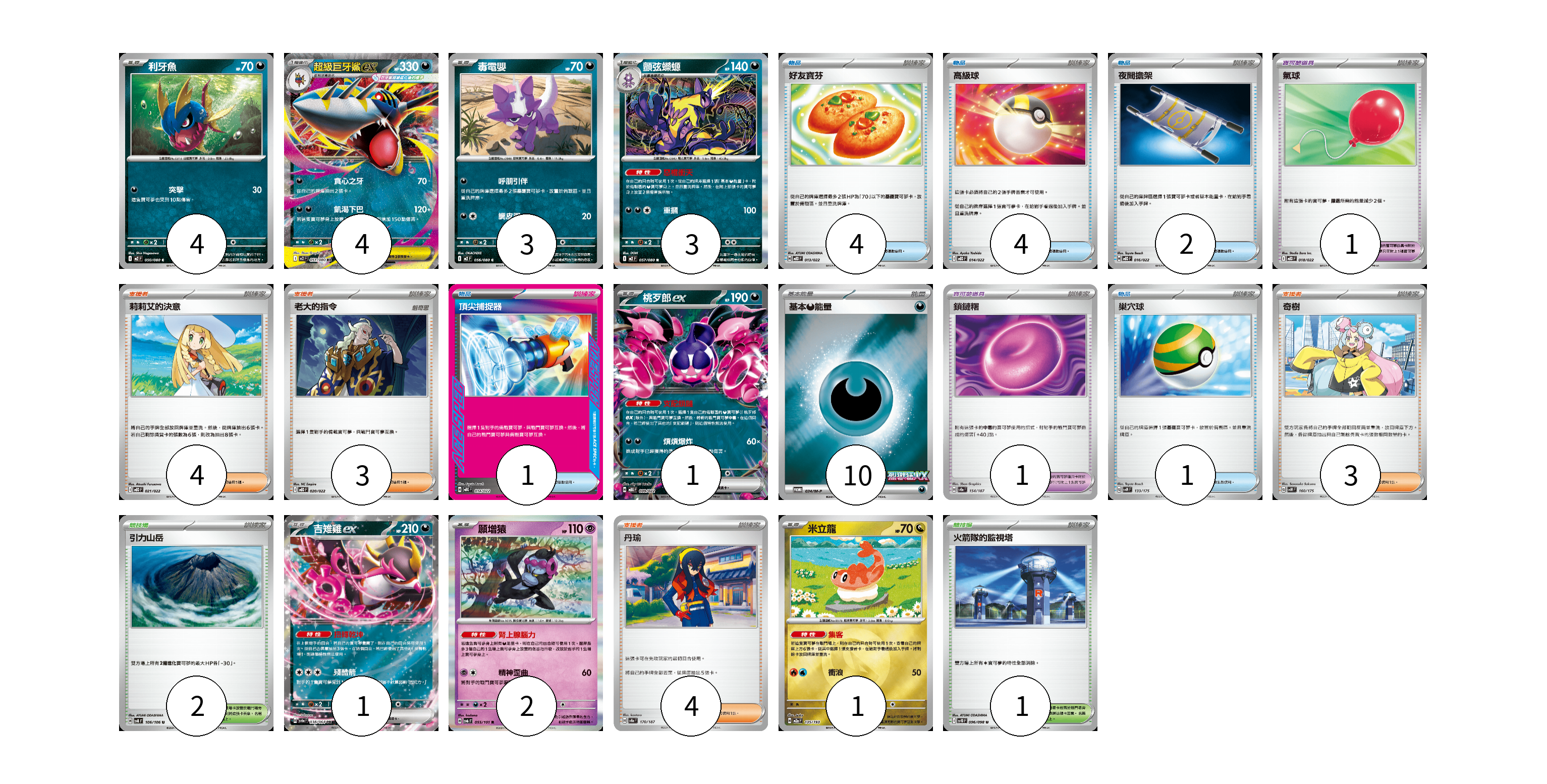 牌組構築方案 以此牌組為基礎新構築牌組 顯示卡面 顯示列表 寶可夢卡(19) 4 4 3 3 1 1 2 1 寶可夢道具(1) 1 物品卡(13) 4 4 2 1 1 1 支援者卡(14) 4 3 3 4 競技場卡(3) 2 1 能量卡(10) 10 寶可夢卡(19) 卡牌名稱 張數 卡牌名稱 張數 利牙魚 M2 050/080 04 超級巨牙鯊ex M2 051/080 04 毒電嬰 M2 056/080 03 顫弦蠑螈 M2 057/080 03 桃歹郎ex MBG 009/022 01 吉雉雞ex SV6a 038/064 01 願增猿 SV6 055/101 02 米立龍 M2a 135/193 01 寶可夢道具(1) 卡牌名稱 張數 卡牌名稱 張數 鎖鏈糬 SV8a 154/187 01 物品卡(13) 卡牌名稱 張數 卡牌名稱 張數 好友寶芬 MBD 013/022 04 高級球 MBD 014/022 04 夜間擔架 MBD 016/022 02 氣球 MBD 018/022 01 頂尖捕捉器 MBG 014/022 01 巢穴球 SVM 133/175 01 支援者卡(14) 卡牌名稱 張數 卡牌名稱 張數 莉莉艾的決意 MBD 021/022 04 老大的指令 MBD 020/022 03 奇樹 SVM 160/175 03 丹瑜 SV8a 170/187 04 競技場卡(3) 卡牌名稱 張數 卡牌名稱 張數 引力山岳 SV8 106/106 02 火箭隊的監視塔 SV10 096/098 01 能量卡(10) 卡牌名稱 張數 卡牌名稱 張數 基本【惡】能量 M-P 034/M-P 10 以此牌組為基礎新構築牌組 牌組編碼 hOUnMQ-tVAaHL-vJOBIE copy 列印牌組單 牌組編碼已複製 分享至SNS