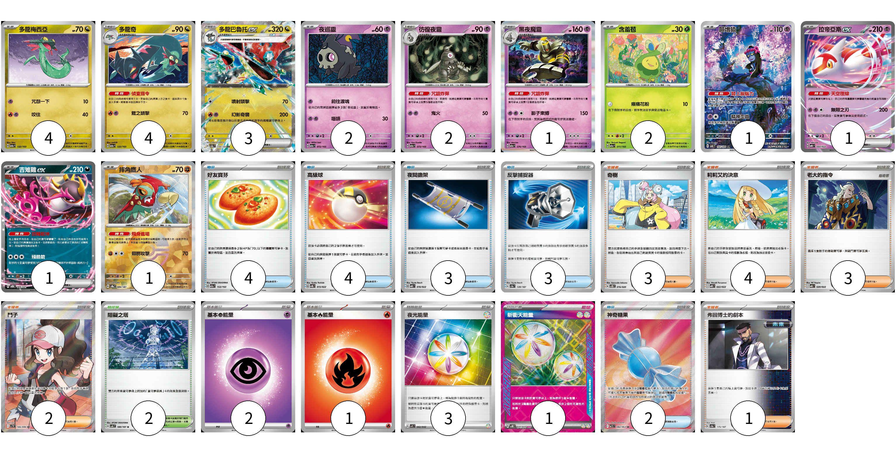 牌組構築方案 以此牌組為基礎新構築牌組 顯示卡面 顯示列表 寶可夢卡(22) 4 4 3 2 2 1 2 1 1 1 1 物品卡(16) 4 4 3 3 2 支援者卡(13) 3 4 3 2 1 競技場卡(2) 2 能量卡(7) 2 1 3 1 寶可夢卡(22) 卡牌名稱 張數 卡牌名稱 張數 多龍梅西亞 M2a 132/193 04 多龍奇 M2a 133/193 04 多龍巴魯托ex M2a 134/193 03 夜巡靈 M2a 072/193 02 彷徨夜靈 M2a 073/193 02 黑夜魔靈 M2a 074/193 01 含羞苞 M2a 011/193 02 願增猿 SV6 107/101 01 拉帝亞斯ex MBD 003/022 01 吉雉雞ex SVOM 009/021 01 摔角鷹人 SV8a 084/187 01 物品卡(16) 卡牌名稱 張數 卡牌名稱 張數 好友寶芬 M2a 153/193 04 高級球 SVQL 015/022 04 夜間擔架 MBD 016/022 03 反擊捕捉器 SV8a 139/187 03 神奇糖果 M1S 082/063 02 支援者卡(13) 卡牌名稱 張數 卡牌名稱 張數 奇樹 SVOD 016/020 03 莉莉艾的決意 MBG 022/022 04 老大的指令 MBD 020/022 03 鬥子 SV11W 166/086 02 弗圖博士的劇本 SV8a 175/187 01 競技場卡(2) 卡牌名稱 張數 卡牌名稱 張數 阻礙之塔 SV6 100/101 02 能量卡(7) 卡牌名稱 張數 卡牌名稱 張數 基本【超】能量 MBD PSY 02 基本【火】能量 M-P FIR 01 夜光能量 SVK 042/042 03 新衝天能量 SV5K 071/071 01 以此牌組為基礎新構築牌組 牌組編碼 hPGRNT-aBdMGG-uwGNqC copy 列印牌組單 牌組編碼已複製 分享至SNS