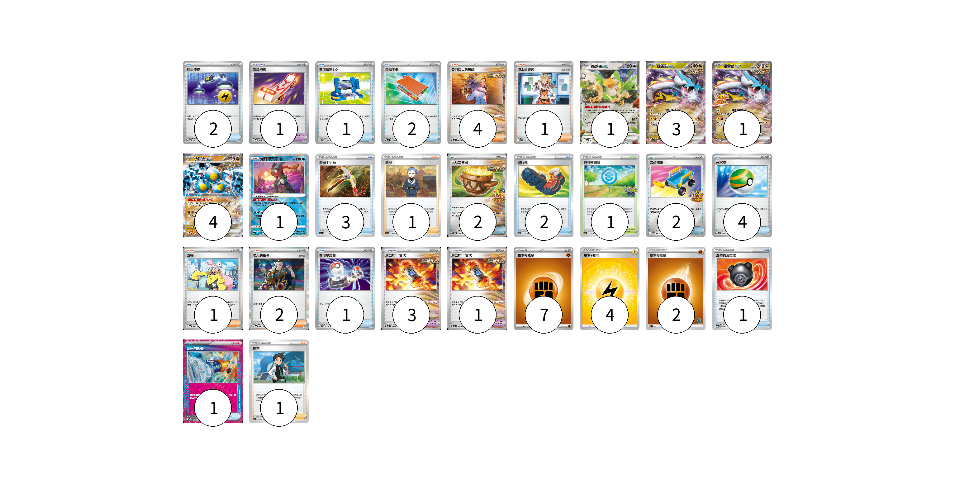 牌組構築方案 以此牌組為基礎新構築牌組 顯示卡面 顯示列表 寶可夢卡(10) 1 3 1 4 1 寶可夢道具(5) 1 3 1 物品卡(21) 2 1 2 3 2 2 2 4 1 1 1 支援者卡(10) 4 1 1 1 2 1 競技場卡(1) 1 能量卡(13) 7 4 2 寶可夢卡(10) 卡牌名稱 張數 卡牌名稱 張數 怒鸚哥ex SV4a 154/190 01 猛雷鼓ex SV5K 053/071 03 猛雷鼓ex SV-P 081/SV-P 01 沙鐵皮ex SV4K 042/066 04 光輝甲賀忍蛙 SVF 004/038 01 寶可夢道具(5) 卡牌名稱 張數 卡牌名稱 張數 緊急滑板 SV5K 064/071 01 驅勁能量 古代 SV5K 065/071 03 驅勁能量 古代 SV4K 061/066 01 物品卡(21) 卡牌名稱 張數 卡牌名稱 張數 能量轉移 SVD 111/139 02 寶可裝置3.0 SVD 121/139 01 朋友手冊 SV1S 069/078 02 堅毅十字鎬 S12a 133/172 03 大地之容器 SV-P 084/SV-P 02 健行鞋 S10D 061/067 02 交替推車 SV-P 082/SV-P 02 巢穴球 SVD 118/139 04 寶可夢交替 SVD 122/139 01 洗翠的沉重球 SVB 014/028 01 頂尖捕捉器 SV5M 062/071 01 支援者卡(10) 卡牌名稱 張數 卡牌名稱 張數 奧琳博士的氣魄 SV4K 064/066 04 博士的研究(奧琳博士) SVD 135/139 01 星月 S9a 064/067 01 奇樹 SV4a 174/190 01 老大的指令 SV4a 181/190 02 捩木 S11 097/100 01 競技場卡(1) 卡牌名稱 張數 卡牌名稱 張數 寶可補給站 S10b 071/071 01 能量卡(13) 卡牌名稱 張數 卡牌名稱 張數 基本【鬥】能量 SVF FIG 07 基本【雷】能量 SI LIG 04 基本鬥能量 SH FIG 02 以此牌組為基礎新構築牌組 牌組編碼 hQxKDw-dvVzuX-RgkRDL copy 列印牌組單 牌組編碼已複製 分享至SNS