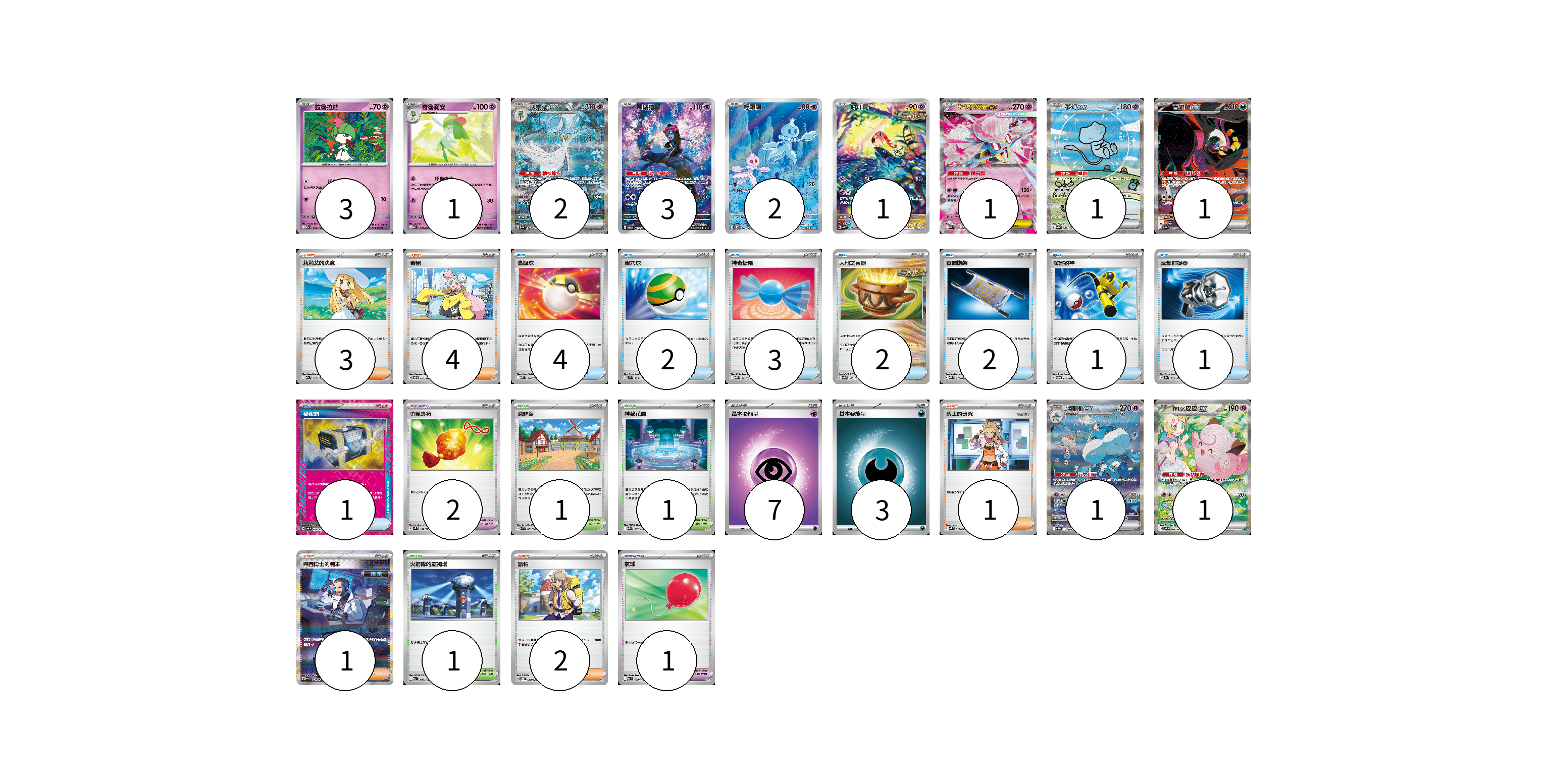 牌組構築方案 以此牌組為基礎新構築牌組 顯示卡面 顯示列表 寶可夢卡(17) 3 1 2 3 2 1 1 1 1 1 1 寶可夢道具(3) 2 1 物品卡(16) 4 2 3 2 2 1 1 1 支援者卡(11) 3 4 1 1 2 競技場卡(3) 1 1 1 能量卡(10) 7 3 寶可夢卡(17) 卡牌名稱 張數 卡牌名稱 張數 拉魯拉絲 M2a 069/193 03 奇魯莉安 M1S 041/063 01 沙奈朵ex SV4a 348/190 02 願增猿 SV6 107/101 03 輕飄飄 SV11W 124/086 02 吼叫尾 SV4K 071/066 01 超級蒂安希ex MBD 006/022 01 夢幻ex SV4a 347/190 01 吉雉雞ex SV6a 089/064 01 胖嘟嘟ex SV11W 170/086 01 莉莉艾的皮皮ex SV9 126/100 01 寶可夢道具(3) 卡牌名稱 張數 卡牌名稱 張數 勇氣護符 SVM 142/175 02 氣球 MC 688/742 01 物品卡(16) 卡牌名稱 張數 卡牌名稱 張數 高級球 MBD 014/022 04 巢穴球 SVM 133/175 02 神奇糖果 MBG 013/022 03 大地之容器 SV8a 143/187 02 夜間擔架 MBD 016/022 02 厲害釣竿 SVOD 010/020 01 反擊捕捉器 SV8a 139/187 01 秘密箱 SV6 092/101 01 支援者卡(11) 卡牌名稱 張數 卡牌名稱 張數 莉莉艾的決意 M2a 175/193 03 奇樹 SVOD 016/020 04 博士的研究 SVK 032/042 01 弗圖博士的劇本 SV4M 091/066 01 派帕 SVOD 018/020 02 競技場卡(3) 卡牌名稱 張數 卡牌名稱 張數 深缽鎮 SVK 039/042 01 神秘花園 M2a 187/193 01 火箭隊的監視塔 M2a 189/193 01 能量卡(10) 卡牌名稱 張數 卡牌名稱 張數 基本【超】能量 MBD PSY 07 基本【惡】能量 MBG DAR 03 以此牌組為基礎新構築牌組 牌組編碼 hSMkkf-dwOCPj-ShDMBk copy 列印牌組單 牌組編碼已複製 分享至SNS