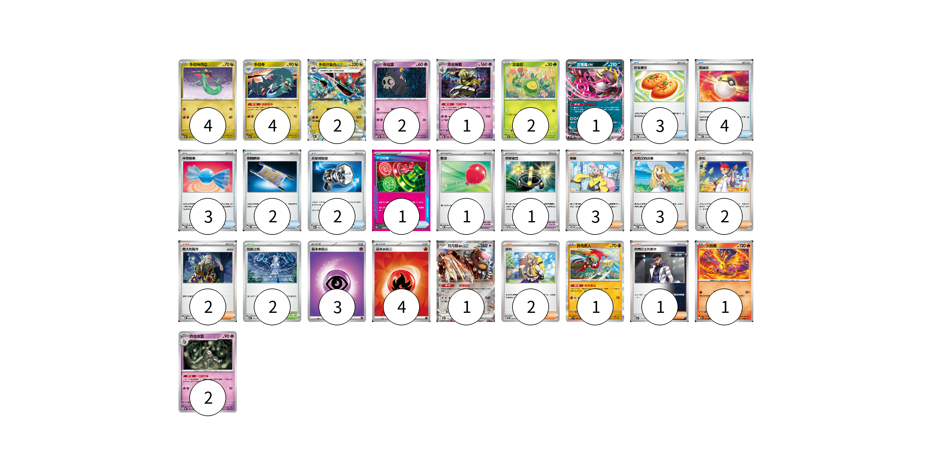 牌組構築方案 以此牌組為基礎新構築牌組 顯示卡面 顯示列表 寶可夢卡(21) 4 4 2 2 1 2 1 1 1 1 2 寶可夢道具(1) 1 物品卡(16) 3 4 3 2 2 1 1 支援者卡(13) 3 3 2 2 2 1 競技場卡(2) 2 能量卡(7) 3 4 寶可夢卡(21) 卡牌名稱 張數 卡牌名稱 張數 多龍梅西亞 SV8a 118/187 04 多龍奇 SV8a 119/187 04 多龍巴魯托ex SV8a 120/187 02 夜巡靈 SV8a 064/187 02 黑夜魔靈 SV8a 066/187 01 含羞苞 SV8a 001/187 02 吉雉雞ex SVOD 004/020 01 月月熊 赫月ex SV8a 134/187 01 摔角鷹人 SV1S 045/078 01 火焰鳥 M2 014/080 01 彷徨夜靈 SV8a 065/187 02 寶可夢道具(1) 卡牌名稱 張數 卡牌名稱 張數 學習裝置 SVTM 016/022 01 物品卡(16) 卡牌名稱 張數 卡牌名稱 張數 好友寶芬 MBD 013/022 03 高級球 MBD 014/022 04 神奇糖果 MBG 013/022 03 夜間擔架 MBG 017/022 02 反擊捕捉器 SV8a 139/187 02 不公印章 MBD 011/022 01 氣球 MBD 018/022 01 支援者卡(13) 卡牌名稱 張數 卡牌名稱 張數 奇樹 SVOD 016/020 03 莉莉艾的決意 MBD 021/022 03 赤松 SV8a 163/187 02 老大的指令 MBD 020/022 02 派帕 SVTL 020/021 02 弗圖博士的劇本 SV8a 175/187 01 競技場卡(2) 卡牌名稱 張數 卡牌名稱 張數 阻礙之塔 SV8a 181/187 02 能量卡(7) 卡牌名稱 張數 卡牌名稱 張數 基本【超】能量 M-P PSY 03 基本【火】能量 SVK FIR 04 以此牌組為基礎新構築牌組 牌組編碼 hSNWFc-OMOZLW-OTxUCu copy 列印牌組單 牌組編碼已複製 分享至SNS