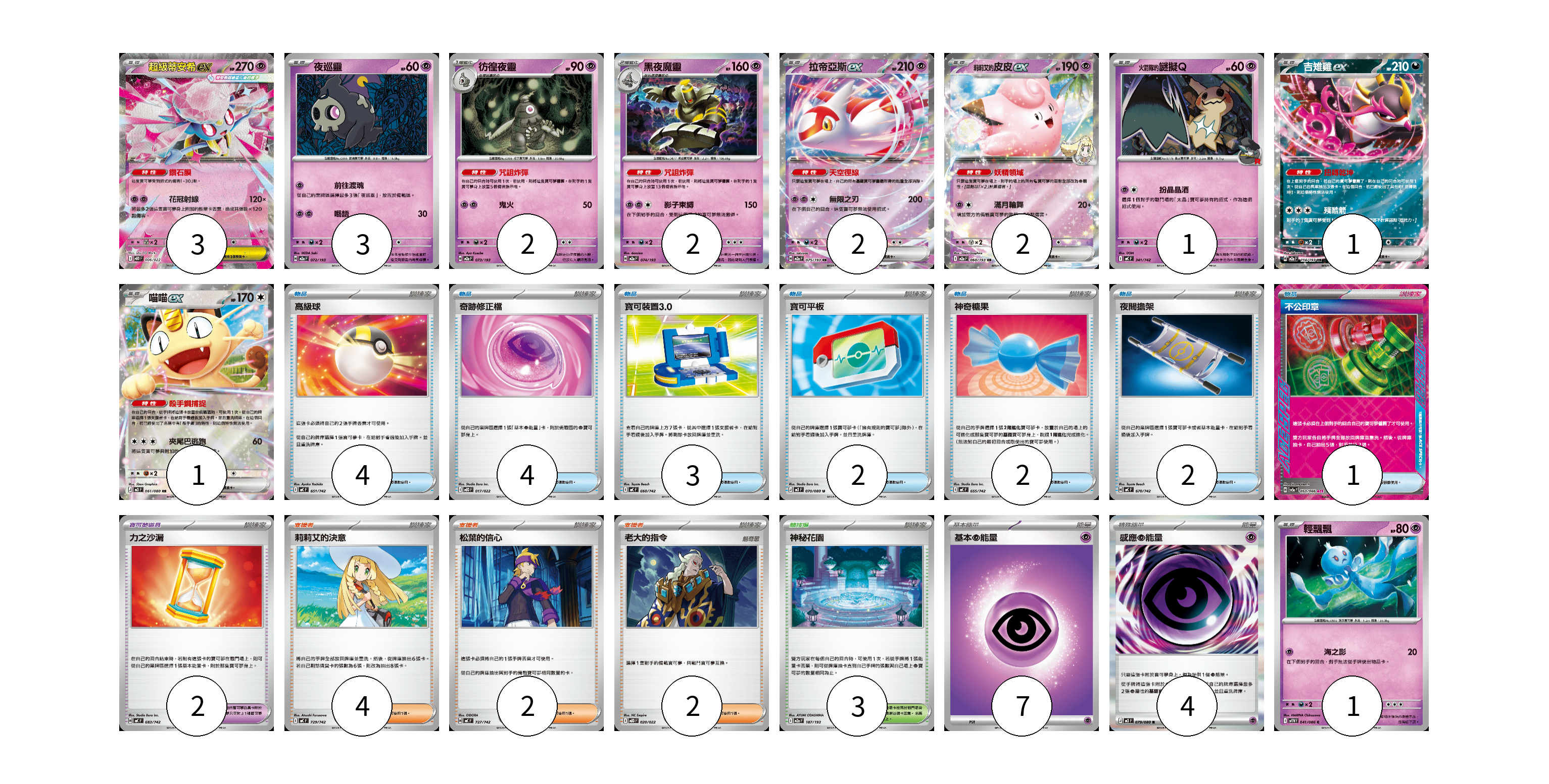 牌組構築方案 以此牌組為基礎新構築牌組 顯示卡面 顯示列表 寶可夢卡(18) 3 3 2 2 2 2 1 1 1 1 寶可夢道具(2) 2 物品卡(18) 4 4 3 2 2 2 1 支援者卡(8) 4 2 2 競技場卡(3) 3 能量卡(11) 7 4 寶可夢卡(18) 卡牌名稱 張數 卡牌名稱 張數 超級蒂安希ex MBD 006/022 03 夜巡靈 M2a 072/193 03 彷徨夜靈 M2a 073/193 02 黑夜魔靈 M2a 074/193 02 拉帝亞斯ex M2a 075/193 02 莉莉艾的皮皮ex M2a 060/193 02 <火箭隊的>謎擬Q MC 341/742 01 吉雉雞ex M2a 114/193 01 喵喵ex M3 061/080 01 輕飄飄 SV11W 041/086 01 寶可夢道具(2) 卡牌名稱 張數 卡牌名稱 張數 力之沙漏 MC 683/742 02 物品卡(18) 卡牌名稱 張數 卡牌名稱 張數 高級球 MC 651/742 04 奇跡修正檔 MBD 017/022 04 寶可裝置3.0 MC 660/742 03 寶可平板 M3 070/080 02 神奇糖果 MC 655/742 02 夜間擔架 MC 670/742 02 不公印章 SV5a 053/066 01 支援者卡(8) 卡牌名稱 張數 卡牌名稱 張數 莉莉艾的決意 MC 729/742 04 松葉的信心 MC 727/742 02 老大的指令 MBD 020/022 02 競技場卡(3) 卡牌名稱 張數 卡牌名稱 張數 神秘花園 M2a 187/193 03 能量卡(11) 卡牌名稱 張數 卡牌名稱 張數 基本【超】能量 MC PSY 07 感應【超】能量 M3 079/080 04 以此牌組為基礎新構築牌組 牌組編碼 hVjqoH-MiOpLs-lnliMt copy 列印牌組單 牌組編碼已複製 分享至SNS