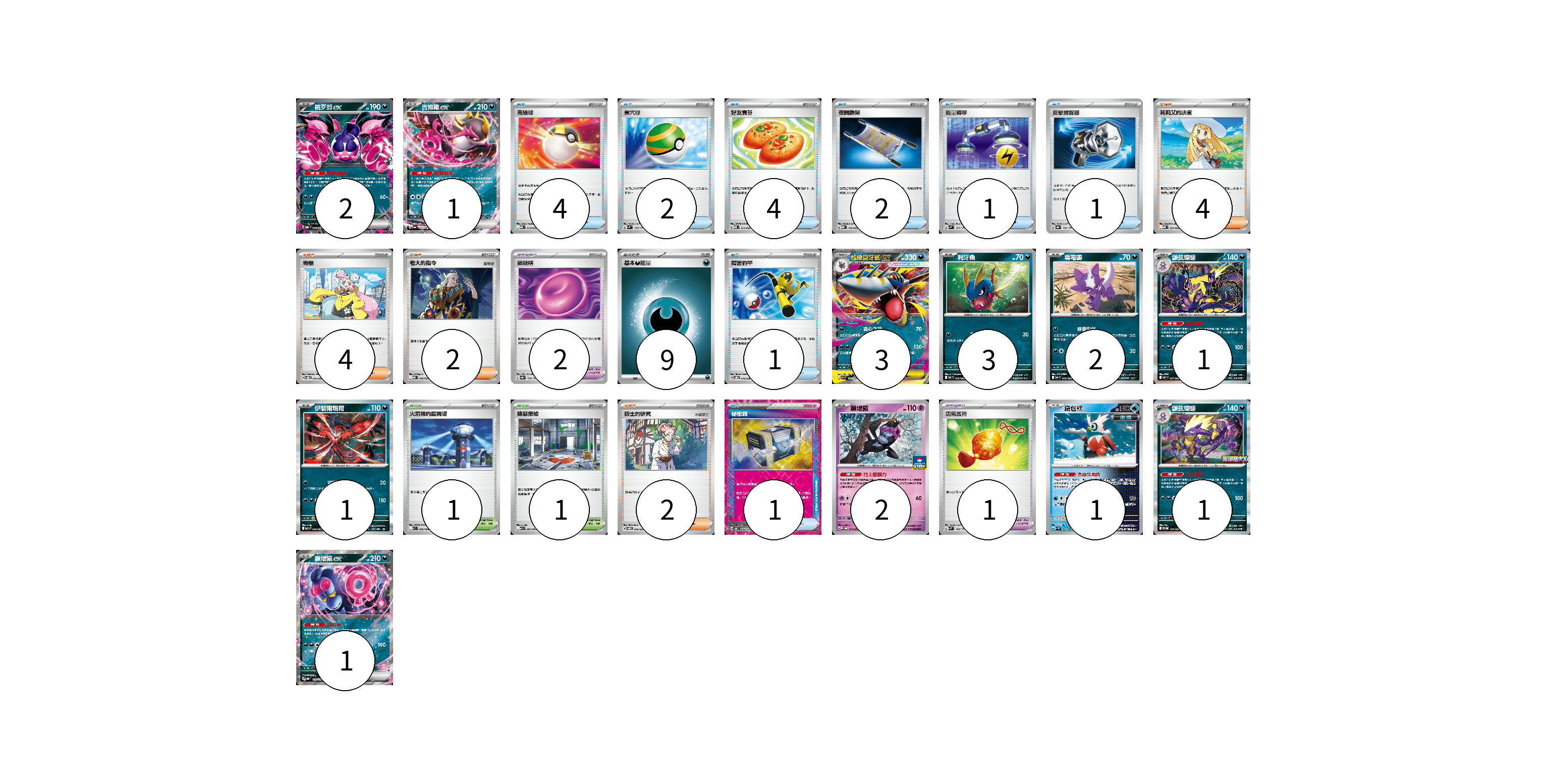 牌組構築方案 以此牌組為基礎新構築牌組 顯示卡面 顯示列表 寶可夢卡(18) 2 1 3 3 2 1 1 2 1 1 1 寶可夢道具(3) 2 1 物品卡(16) 4 2 4 2 1 1 1 1 支援者卡(12) 4 4 2 2 競技場卡(2) 1 1 能量卡(9) 9 寶可夢卡(18) 卡牌名稱 張數 卡牌名稱 張數 桃歹郎ex MBG 009/022 02 吉雉雞ex SV6a 038/064 01 超級巨牙鯊ex M2 051/080 03 利牙魚 M2 050/080 03 毒電嬰 M2 056/080 02 顫弦蠑螈 M2 057/080 01 伊裴爾塔爾 M1L 040/063 01 願增猿 M-P 014/M-P 02 鐵包袱 SV4M 020/066 01 顫弦蠑螈 M-P 031/M-P 01 願增猿ex SV8a 103/187 01 寶可夢道具(3) 卡牌名稱 張數 卡牌名稱 張數 鎖鏈糬 SV8a 154/187 02 勇氣護符 SVM 142/175 01 物品卡(16) 卡牌名稱 張數 卡牌名稱 張數 高級球 MBD 014/022 04 巢穴球 SVM 133/175 02 好友寶芬 MBD 013/022 04 夜間擔架 MBD 016/022 02 能量轉移 SVM 127/175 01 反擊捕捉器 SV8a 139/187 01 厲害釣竿 SVOD 010/020 01 秘密箱 SV6 092/101 01 支援者卡(12) 卡牌名稱 張數 卡牌名稱 張數 莉莉艾的決意 MBD 021/022 04 奇樹 SVOD 016/020 04 老大的指令 MBD 020/022 02 博士的研究 SVOM 019/021 02 競技場卡(2) 卡牌名稱 張數 卡牌名稱 張數 火箭隊的監視塔 SV10 096/098 01 險惡廢墟 M1L 063/063 01 能量卡(9) 卡牌名稱 張數 卡牌名稱 張數 基本【惡】能量 MBG DAR 09 以此牌組為基礎新構築牌組 牌組編碼 hWXoIw-HDsdiV-hBzhXp copy 列印牌組單 牌組編碼已複製 分享至SNS