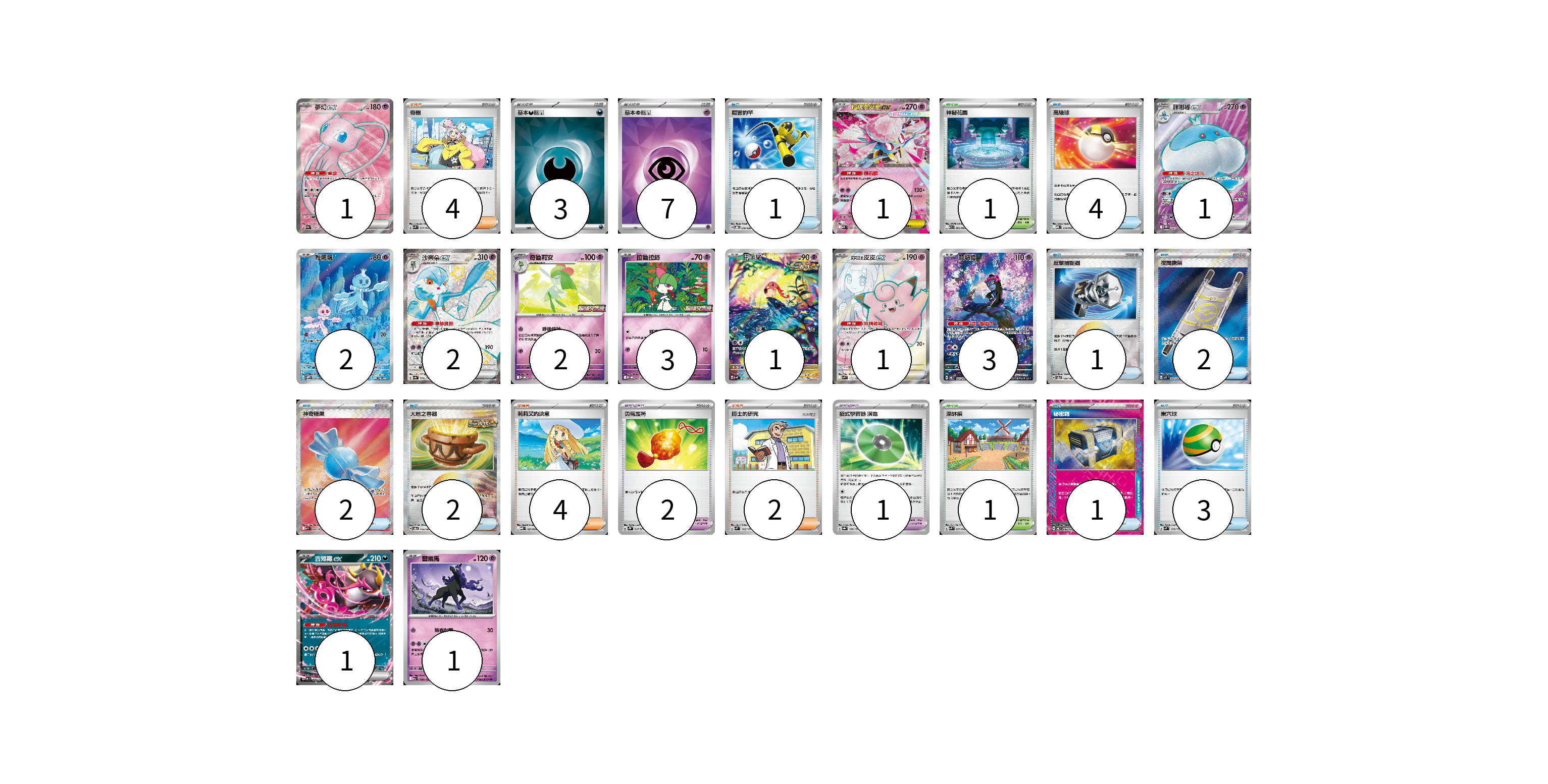 牌組構築方案 以此牌組為基礎新構築牌組 顯示卡面 顯示列表 寶可夢卡(19) 1 1 1 2 2 2 3 1 1 3 1 1 寶可夢道具(3) 2 1 物品卡(16) 1 4 1 2 2 2 1 3 支援者卡(10) 4 4 2 競技場卡(2) 1 1 能量卡(10) 3 7 寶可夢卡(19) 卡牌名稱 張數 卡牌名稱 張數 夢幻ex SV2a 195/165 01 超級蒂安希ex MBD 006/022 01 胖嘟嘟ex SV11W 162/086 01 輕飄飄 SV11W 124/086 02 沙奈朵ex SV4a 328/190 02 奇魯莉安 M-P 006/M-P 02 拉魯拉絲 M-P 005/M-P 03 吼叫尾 SV4K 071/066 01 莉莉艾的皮皮ex SV9 115/100 01 願增猿 SV6 107/101 03 吉雉雞ex MC 489/742 01 靈幽馬 M2a 080/193 01 寶可夢道具(3) 卡牌名稱 張數 卡牌名稱 張數 勇氣護符 SV2D 067/071 02 招式學習器 演進 SV8a 160/187 01 物品卡(16) 卡牌名稱 張數 卡牌名稱 張數 厲害釣竿 SVOD 010/020 01 高級球 MBD 014/022 04 反擊捕捉器 SV8a 139/187 01 夜間擔架 M1L 083/063 02 神奇糖果 M1S 082/063 02 大地之容器 SV8a 143/187 02 秘密箱 SV6 092/101 01 巢穴球 SVM 133/175 03 支援者卡(10) 卡牌名稱 張數 卡牌名稱 張數 奇樹 SVK 031/042 04 莉莉艾的決意 MBD 021/022 04 博士的研究 SVM 162/175 02 競技場卡(2) 卡牌名稱 張數 卡牌名稱 張數 神秘花園 M1S 063/063 01 深缽鎮 SVK 039/042 01 能量卡(10) 卡牌名稱 張數 卡牌名稱 張數 基本【惡】能量 SVK DAR 03 基本【超】能量 SVK PSY 07 以此牌組為基礎新構築牌組 牌組編碼 hXdOOH-AhjGsi-KAfADQ copy 列印牌組單 牌組編碼已複製 分享至SNS