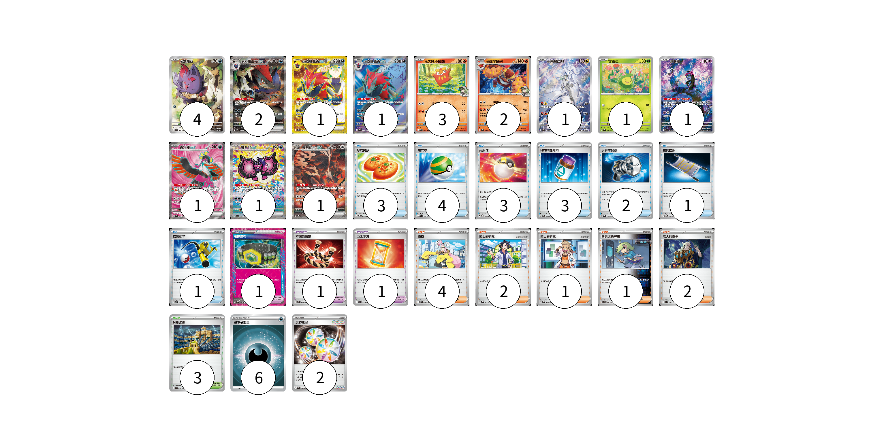 牌組構築方案 以此牌組為基礎新構築牌組 顯示卡面 顯示列表 寶可夢卡(19) 4 2 1 1 3 2 1 1 1 1 1 1 寶可夢道具(3) 1 1 1 物品卡(17) 3 4 3 3 2 1 1 支援者卡(10) 4 2 1 1 2 競技場卡(3) 3 能量卡(8) 6 2 寶可夢卡(19) 卡牌名稱 張數 卡牌名稱 張數 N的索羅亞 SV9 108/100 04 N的索羅亞克ex SV9 127/100 02 N的索羅亞克ex SV9 131/100 01 N的索羅亞克ex SV9 117/100 01 N的火紅不倒翁 SV9 015/100 03 N的達摩狒狒 SV9 016/100 02 N的萊希拉姆 SV9 109/100 01 含羞苞 SV8a 001/187 01 願增猿 SV6 107/101 01 吉雉雞ex SV6a 081/064 01 桃歹郎ex SV8a 219/187 01 月月熊 赫月ex SV8a 225/187 01 寶可夢道具(3) 卡牌名稱 張數 卡牌名稱 張數 極限腰帶 SV5K 066/071 01 不服輸頭帶 SVTL 016/021 01 力之沙漏 SV6a 058/064 01 物品卡(17) 卡牌名稱 張數 卡牌名稱 張數 好友寶芬 SVOD 011/020 03 巢穴球 SVM 133/175 04 高級球 SVOD 012/020 03 N的PP提升劑 SV9 089/100 03 反擊捕捉器 SV8a 139/187 02 夜間擔架 SVOM 016/021 01 厲害釣竿 SVOD 010/020 01 支援者卡(10) 卡牌名稱 張數 卡牌名稱 張數 奇樹 SVOM 018/021 04 博士的研究 SVM 167/175 02 博士的研究 SVK 032/042 01 暗碼迷的解讀 SV5M 067/071 01 老大的指令 SVM 172/175 02 競技場卡(3) 卡牌名稱 張數 卡牌名稱 張數 N的城堡 SV9 097/100 03 能量卡(8) 卡牌名稱 張數 卡牌名稱 張數 基本惡能量 SLD DAR 06 反轉能量 SV4a 189/190 02 以此牌組為基礎新構築牌組 牌組編碼 hYpsls-BBycAX-QiRuIu copy 列印牌組單 牌組編碼已複製 分享至SNS