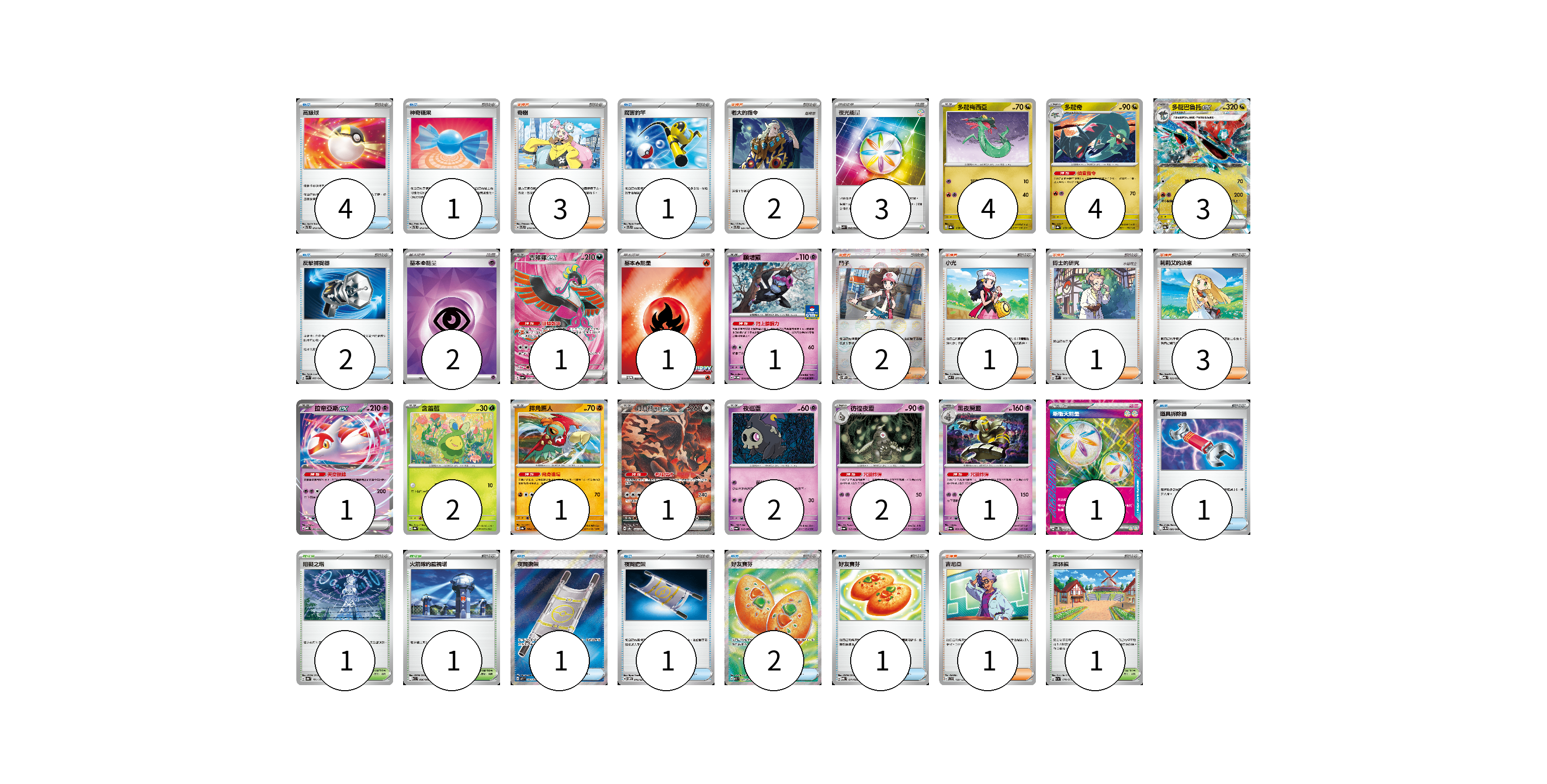 牌組構築方案 以此牌組為基礎新構築牌組 顯示卡面 顯示列表 寶可夢卡(23) 4 4 3 1 1 1 2 1 1 2 2 1 寶可夢道具(3) 3 物品卡(14) 4 1 1 2 1 1 1 2 1 支援者卡(10) 2 2 1 1 3 1 競技場卡(3) 1 1 1 能量卡(7) 3 2 1 1 寶可夢卡(23) 卡牌名稱 張數 卡牌名稱 張數 多龍梅西亞 SV8a 118/187 04 多龍奇 SV8a 119/187 04 多龍巴魯托ex SV8a 120/187 03 吉雉雞ex SV6a 081/064 01 願增猿 M-P 014/M-P 01 拉帝亞斯ex MBD 003/022 01 含羞苞 SV8a 001/187 02 摔角鷹人 SV8a 084/187 01 月月熊 赫月ex SV8a 225/187 01 夜巡靈 SV6a 018/064 02 彷徨夜靈 SV6a 019/064 02 黑夜魔靈 SV6a 020/064 01 寶可夢道具(3) 卡牌名稱 張數 卡牌名稱 張數 奇樹 SVTL 018/021 03 物品卡(14) 卡牌名稱 張數 卡牌名稱 張數 高級球 SVTL 012/021 04 神奇糖果 SVTL 013/021 01 厲害釣竿 SVTL 009/021 01 反擊捕捉器 SVK 009/042 02 道具拆除器 SV11W 080/086 01 夜間擔架 M1L 083/063 01 夜間擔架 SVOM 016/021 01 好友寶芬 M1S 081/063 02 好友寶芬 MBG 011/022 01 支援者卡(10) 卡牌名稱 張數 卡牌名稱 張數 老大的指令 SVTL 021/021 02 鬥子 SV11W 085/086 02 小光 M2 077/080 01 博士的研究 SVM 169/175 01 莉莉艾的決意 MBG 022/022 03 吉尼亞 SVD 129/139 01 競技場卡(3) 卡牌名稱 張數 卡牌名稱 張數 阻礙之塔 SV8a 181/187 01 火箭隊的監視塔 SV10 096/098 01 深缽鎮 SV1a 070/073 01 能量卡(7) 卡牌名稱 張數 卡牌名稱 張數 夜光能量 SVK 042/042 03 基本【超】能量 SVOD PSY 02 基本【火】能量 M-P 032/M-P 01 新衝天能量 SV5K 071/071 01 以此牌組為基礎新構築牌組 牌組編碼 hagfzB-kIVJKA-rvAkue copy 列印牌組單 牌組編碼已複製 分享至SNS