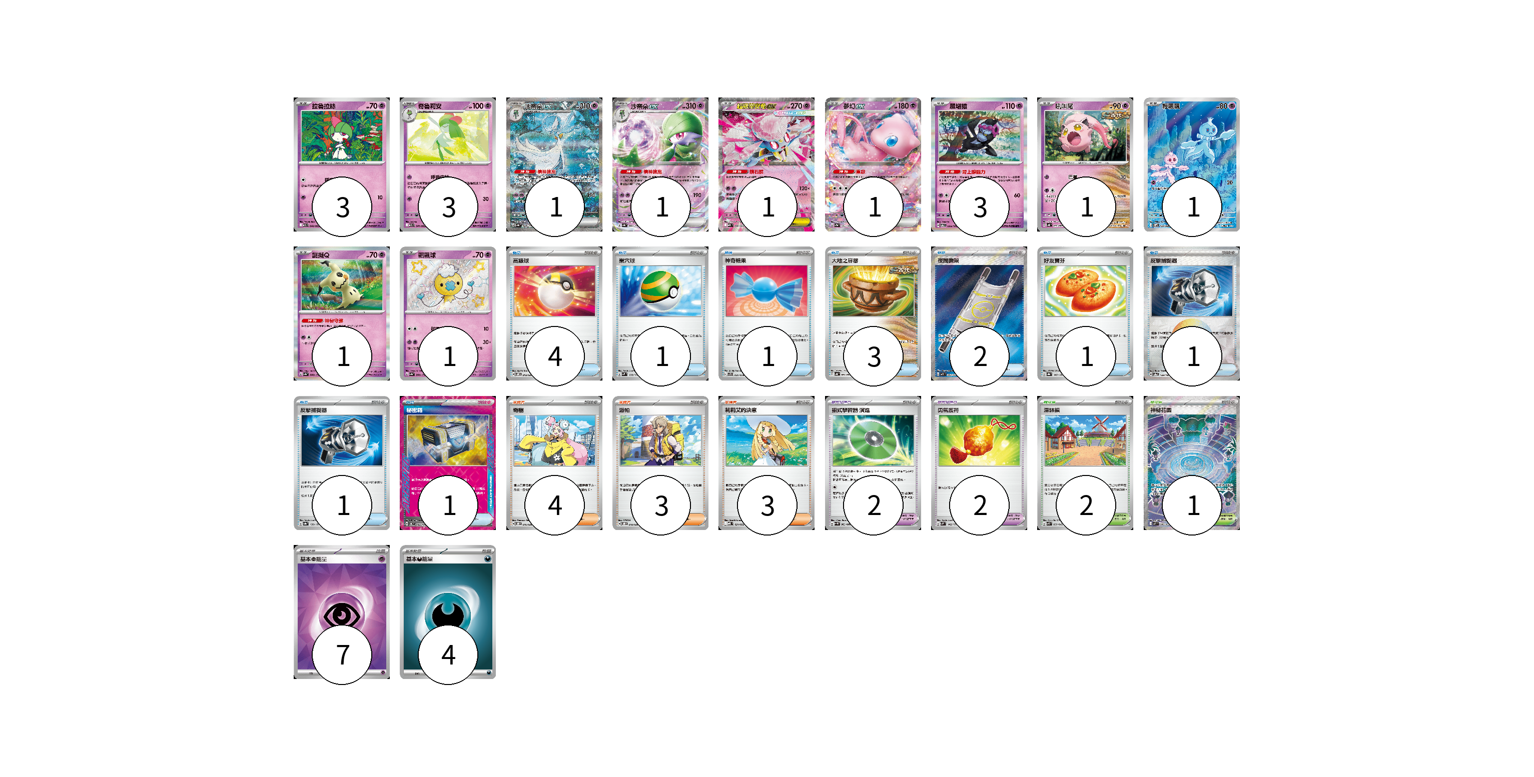 牌組構築方案 以此牌組為基礎新構築牌組 顯示卡面 顯示列表 寶可夢卡(17) 3 3 1 1 1 1 3 1 1 1 1 寶可夢道具(4) 2 2 物品卡(15) 4 1 1 3 2 1 1 1 1 支援者卡(10) 4 3 3 競技場卡(3) 2 1 能量卡(11) 7 4 寶可夢卡(17) 卡牌名稱 張數 卡牌名稱 張數 拉魯拉絲 M1S 040/063 03 奇魯莉安 M1S 041/063 03 沙奈朵ex SV4a 348/190 01 沙奈朵ex SV4a 082/190 01 超級蒂安希ex MBD 006/022 01 夢幻ex SV2a 151/165 01 願增猿 SV6 055/101 03 吼叫尾 SV4K 032/066 01 輕飄飄 SV11W 124/086 01 謎擬Q SV4a 088/190 01 飄飄球 SV4a 260/190 01 寶可夢道具(4) 卡牌名稱 張數 卡牌名稱 張數 招式學習器 演進 SV4M 063/066 02 勇氣護符 SVM 142/175 02 物品卡(15) 卡牌名稱 張數 卡牌名稱 張數 高級球 SVOM 013/021 04 巢穴球 SVM 133/175 01 神奇糖果 SVF 020/038 01 大地之容器 SV4K 060/066 03 夜間擔架 M1L 083/063 02 好友寶芬 SV8a 147/187 01 反擊捕捉器 SV8a 139/187 01 反擊捕捉器 SV8a 139/187 01 秘密箱 SV6 092/101 01 支援者卡(10) 卡牌名稱 張數 卡牌名稱 張數 奇樹 SVOD 016/020 04 派帕 SVOD 018/020 03 莉莉艾的決意 MBD 021/022 03 競技場卡(3) 卡牌名稱 張數 卡牌名稱 張數 深缽鎮 SVK 039/042 02 神秘花園 M1S 086/063 01 能量卡(11) 卡牌名稱 張數 卡牌名稱 張數 基本【超】能量 SVK PSY 07 基本【惡】能量 SVF DAR 04 以此牌組為基礎新構築牌組 牌組編碼 hbCBfu-wuCDpI-ehDKRT copy 列印牌組單 牌組編碼已複製 分享至SNS