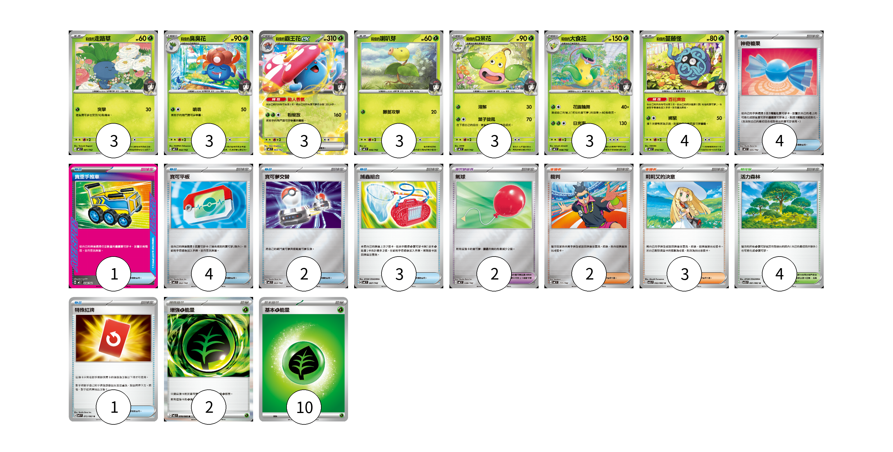 牌組構築方案 以此牌組為基礎新構築牌組 顯示卡面 顯示列表 寶可夢卡(22) 3 3 3 3 3 3 4 寶可夢道具(2) 2 物品卡(15) 4 1 4 2 3 1 支援者卡(5) 2 3 競技場卡(4) 4 能量卡(12) 2 10 寶可夢卡(22) 卡牌名稱 張數 卡牌名稱 張數 莉佳的走路草 MC 001/742 03 莉佳的臭臭花 MC 002/742 03 莉佳的霸王花ex MC 003/742 03 莉佳的喇叭芽 MC 006/742 03 莉佳的口呆花 MC 007/742 03 莉佳的大食花 MC 008/742 03 莉佳的蔓藤怪 MC 014/742 04 寶可夢道具(2) 卡牌名稱 張數 卡牌名稱 張數 氣球 MC 688/742 02 物品卡(15) 卡牌名稱 張數 卡牌名稱 張數 神奇糖果 MC 655/742 04 貴重手推車 MC 658/742 01 寶可平板 MC 662/742 04 寶可夢交替 MC 663/742 02 捕蟲組合 MC 667/742 03 特殊紅牌 M4 072/083 01 支援者卡(5) 卡牌名稱 張數 卡牌名稱 張數 裁判 MC 711/742 02 莉莉艾的決意 M1L 062/063 03 競技場卡(4) 卡牌名稱 張數 卡牌名稱 張數 活力森林 M1S 061/063 04 能量卡(12) 卡牌名稱 張數 卡牌名稱 張數 增強【草】能量 M3 078/080 02 基本【草】能量 MJ GRA 10 以此牌組為基礎新構築牌組 牌組編碼 hfyAel-uwwTsA-PMsMDH copy 列印牌組單 牌組編碼已複製 分享至SNS