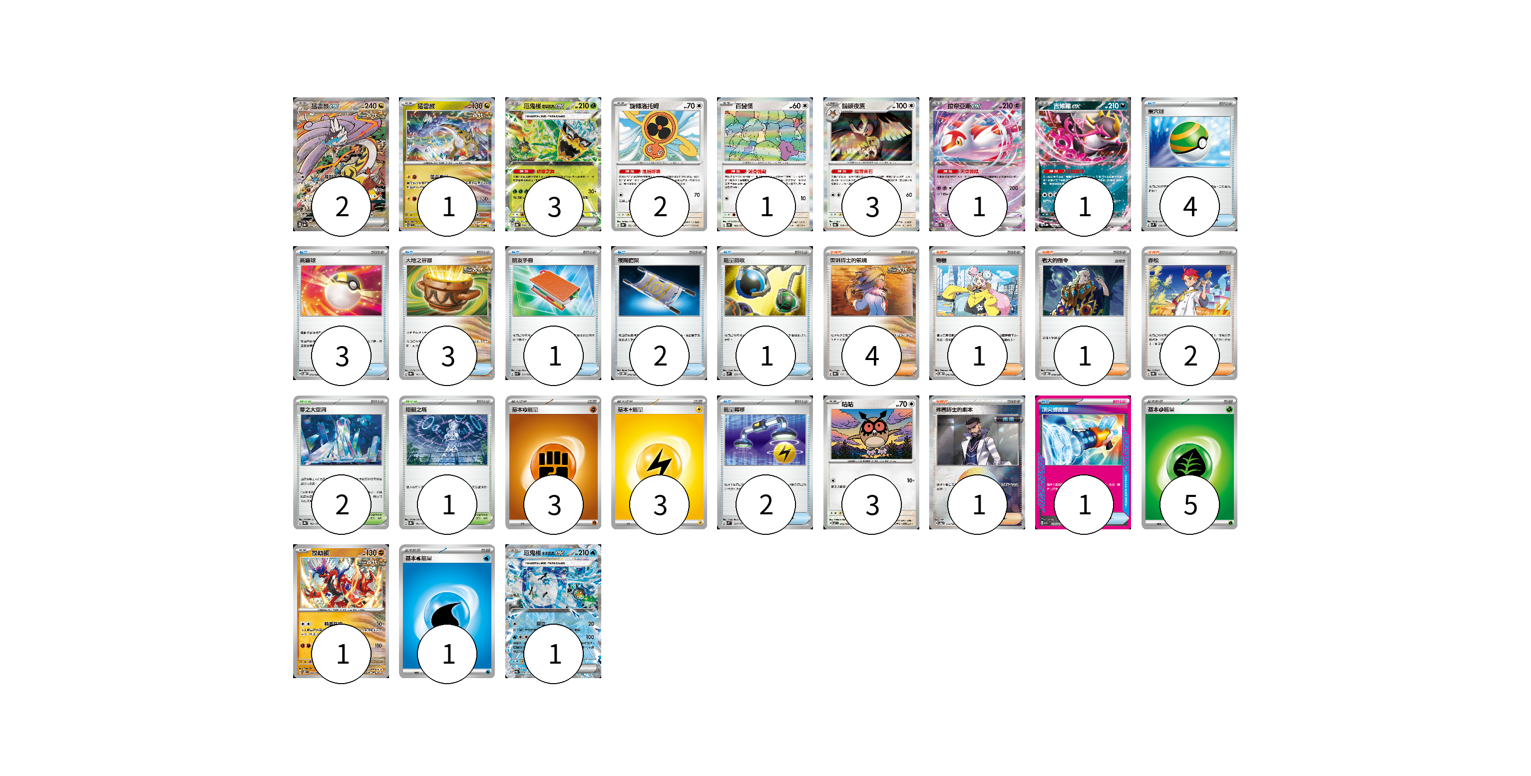牌組構築方案 以此牌組為基礎新構築牌組 顯示卡面 顯示列表 寶可夢卡(19) 2 1 3 2 1 3 1 1 3 1 1 物品卡(17) 4 3 3 1 2 1 2 1 支援者卡(9) 4 1 1 2 1 競技場卡(3) 2 1 能量卡(12) 3 3 5 1 寶可夢卡(19) 卡牌名稱 張數 卡牌名稱 張數 猛雷鼓ex SV8a 222/187 02 猛雷鼓 SV7 075/102 01 厄鬼椪 碧草面具ex SV8a 020/187 03 旋轉洛托姆 SV8a 131/187 02 百變怪 SV4a 144/190 01 貓頭夜鷹 SV8a 128/187 03 拉帝亞斯ex SV7a 019/064 01 吉雉雞ex SV8a 104/187 01 咕咕 SV7 076/102 03 故勒頓 SV8 069/106 01 厄鬼椪 水井面具ex SV8a 050/187 01 物品卡(17) 卡牌名稱 張數 卡牌名稱 張數 巢穴球 SVM 133/175 04 高級球 SVOD 012/020 03 大地之容器 SV8a 143/187 03 朋友手冊 SVK 014/042 01 夜間擔架 SVOM 016/021 02 能量回收 SVM 125/175 01 能量轉移 SVM 127/175 02 頂尖捕捉器 MBG 014/022 01 支援者卡(9) 卡牌名稱 張數 卡牌名稱 張數 奧琳博士的氣魄 SV8a 167/187 04 奇樹 SVOD 016/020 01 老大的指令 SVOD 019/020 01 赤松 SV8a 163/187 02 弗圖博士的劇本 SV8a 175/187 01 競技場卡(3) 卡牌名稱 張數 卡牌名稱 張數 零之大空洞 SV8a 182/187 02 阻礙之塔 SV8a 181/187 01 能量卡(12) 卡牌名稱 張數 卡牌名稱 張數 基本【鬥】能量 SVTG FIG 03 基本【雷】能量 SVTR LIG 03 基本【草】能量 SVF GRA 05 基本【水】能量 SVD WAT 01 以此牌組為基礎新構築牌組 牌組編碼 hhtJTH-ZmqwFq-mwowvW copy 列印牌組單 牌組編碼已複製 分享至SNS