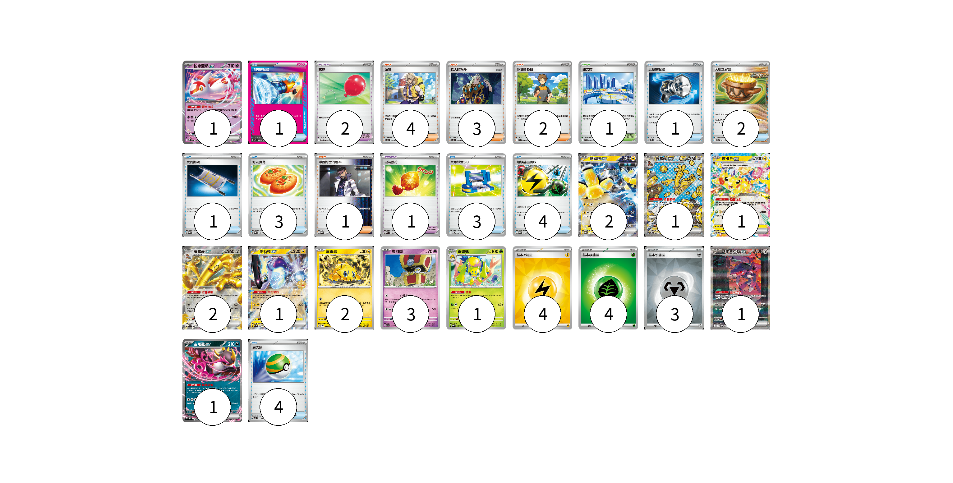 牌組構築方案 以此牌組為基礎新構築牌組 顯示卡面 顯示列表 寶可夢卡(16) 1 2 1 1 2 1 2 3 1 1 1 寶可夢道具(3) 2 1 物品卡(19) 1 1 2 1 3 3 4 4 支援者卡(10) 4 3 2 1 競技場卡(1) 1 能量卡(11) 4 4 3 寶可夢卡(16) 卡牌名稱 張數 卡牌名稱 張數 拉帝亞斯ex MBD 003/022 01 鐵臂膀ex SV8a 054/187 02 賽富豪ex SV8a 220/187 01 皮卡丘ex SV8 033/106 01 賽富豪ex SV3a 050/062 02 密勒頓ex SV-P 164/SV-P 01 電電蟲 SV7 032/102 02 索財靈 SV7a 024/064 03 電蜘蛛 SV6a 002/064 01 蓋諾賽克特ex SV11B 172/086 01 吉雉雞ex SVOM 009/021 01 寶可夢道具(3) 卡牌名稱 張數 卡牌名稱 張數 氣球 SV11B 082/086 02 勇氣護符 SVM 142/175 01 物品卡(19) 卡牌名稱 張數 卡牌名稱 張數 頂尖捕捉器 MBG 014/022 01 反擊捕捉器 SV8a 139/187 01 大地之容器 SV8a 143/187 02 夜間擔架 SV8a 151/187 01 好友寶芬 SV8a 147/187 03 寶可裝置3.0 SVEM 014/020 03 超級能量回收 SV8a 141/187 04 巢穴球 SVM 133/175 04 支援者卡(10) 卡牌名稱 張數 卡牌名稱 張數 派帕 SVOD 018/020 04 老大的指令 SVOD 019/020 03 小剛的發掘 SV9 096/100 02 弗圖博士的劇本 SV8a 175/187 01 競技場卡(1) 卡牌名稱 張數 卡牌名稱 張數 釀光市 SV9 098/100 01 能量卡(11) 卡牌名稱 張數 卡牌名稱 張數 基本【雷】能量 SVQP LIG 04 基本【草】能量 M-P GRA 04 基本【鋼】能量 SVOD MET 03 以此牌組為基礎新構築牌組 牌組編碼 hmwenu-nkkFDe-tRwLWF copy 列印牌組單 牌組編碼已複製 分享至SNS